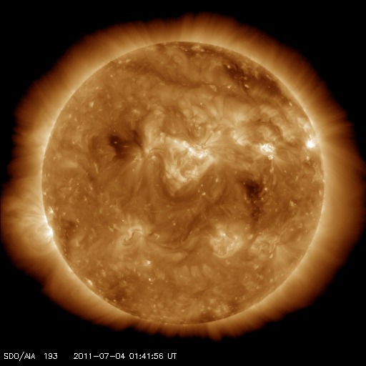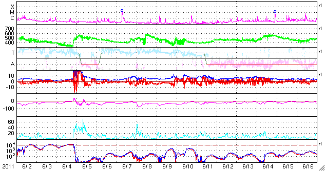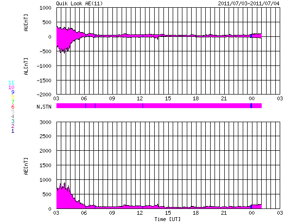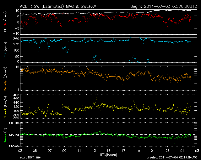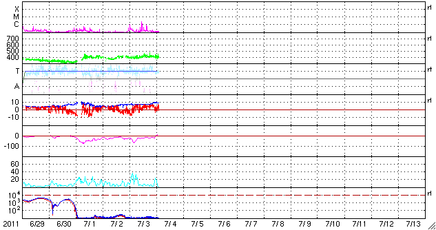 2011/ 7/ 4 11:12 更新 穏やかな太陽風が続いています。磁場が北向きのため、磁気圏は静穏です。 担当 篠原 太陽風の速度(ACEの図の黄色線)は、400km/秒と平均的な状態で安定してます。 一方、磁場強度(白線)は、6nTから10nTに強まっています。 高速風につながる変化ではないと思いますが、しばらく様子を見て下さい。 磁場の南北成分(赤線)は、ずっと北寄り(プラス方向)になっています。 このため、磁気圏の活動は静かで、AE指数は全く変化のない状態です。 SDO AIA193では、太陽の中心を挟んで東西(左右)に小さなコロナホールが見える程度です。 右のコロナホールの影響が、明日の太陽風に多少現れるかもしれません。 太陽では、1244黒点群が目立つ大きさになり、 C2の小規模フレアと、Bクラスの小さなフレアを何度も起こしています。 X線のグラフでは、変動は一段落ついているようですが、 黒点が更に発達するようだと、注意が必要になるでしょう。 SDO衛星のAIA193カメラによる太陽コロナの様子 (c) SDO (NASA) ![]() SDO衛星による太陽の可視光写真。マウスの矢印を写真に重ねると、黒点番号付きの写真に切り替わります。 (c) SDO (NASA) ![]() ACEが観測した太陽風の磁場(1番上の枠、白線は全体の強度、赤線は南北成分) および、太陽風の密度(3番目の橙線)、速度(4番目の黄線) (c) NOAA/SWPC ![]() リアルタイムAE指数 下段のAEグラフの値が高くなると、オーロラ活動が活発化しています。 (c) 京都大学, NICT ![]() 27日の太陽周期に合わせたデータプロット 太陽が同じ面を地球に向けていた27日前の変化から、今後を予想することができます。 (c) 作図:宇宙天気ニュース