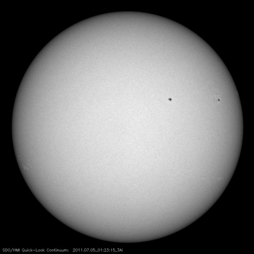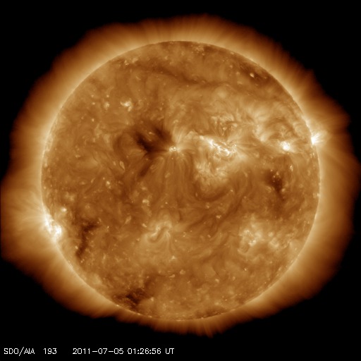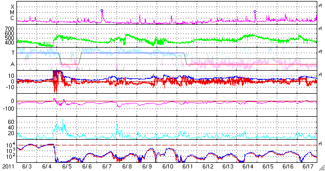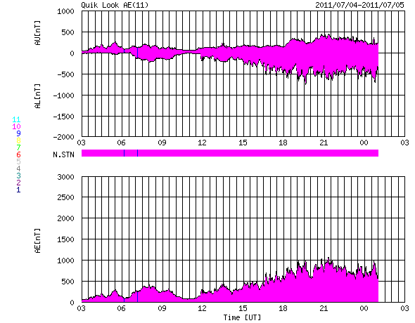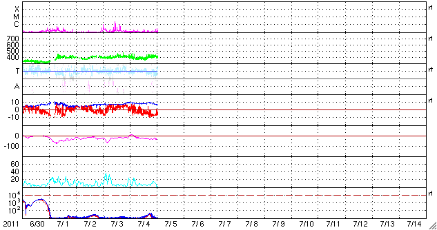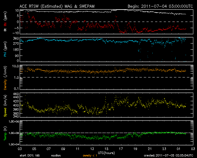 2011/ 7/ 5 11:06 更新 太陽風の磁場が南寄りになり、磁気圏の活動を強めています。太陽は静かです。 担当 篠原 太陽風の速度は、400km/秒と平均的な状態で安定しています。 一方、太陽風磁場の強まりは今朝まで続き、 10nT近くを保っていましたが、現在は6nTほどに下がっています。 昨日は北向きだった南北成分が南向きに変わったため、 活発な磁気圏活動が発生しています。 AE指数では、図の後半で、 500nTから1000nTに達する中規模の変動が半日ほど記録されています。 磁場の南向きは、この後どこまで続くでしょうか。 この状態で速度が上昇すると、磁気圏の変化は一段と活発になります。 SDO AIA193に見えていた小さなコロナホールの影響が 地球へやって来るかどうかという点と合わせて、注目してください。 また、3日のニュースで紹介した太陽のフレア活動に伴って、 弱いCMEも発生している様です。 その影響が、明日の夜か明後日にやって来るかもしれません。 ただし、やって来てもあまり大きな変化にはならないと思います。 太陽は、Bクラスの小さなフレアが発生している程度です。 黒点も小さくなっていて、活動は落ち着いています。 SDO衛星のAIA193カメラによる太陽コロナの様子 (c) SDO (NASA) ![]() SDO衛星による太陽の可視光写真。マウスの矢印を写真に重ねると、黒点番号付きの写真に切り替わります。 (c) SDO (NASA) ![]() ACEが観測した太陽風の磁場(1番上の枠、白線は全体の強度、赤線は南北成分) および、太陽風の密度(3番目の橙線)、速度(4番目の黄線) (c) NOAA/SWPC ![]() リアルタイムAE指数 下段のAEグラフの値が高くなると、オーロラ活動が活発化しています。 (c) 京都大学, NICT ![]() 27日の太陽周期に合わせたデータプロット 太陽が同じ面を地球に向けていた27日前の変化から、今後を予想することができます。 (c) 作図:宇宙天気ニュース