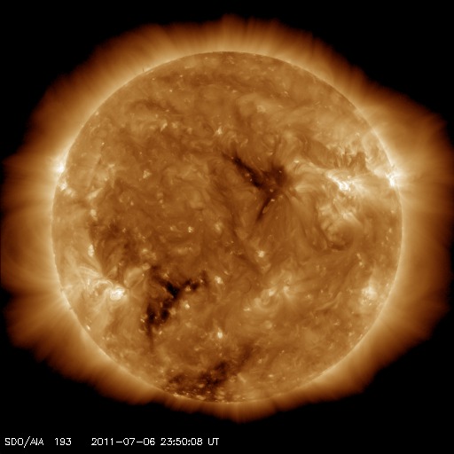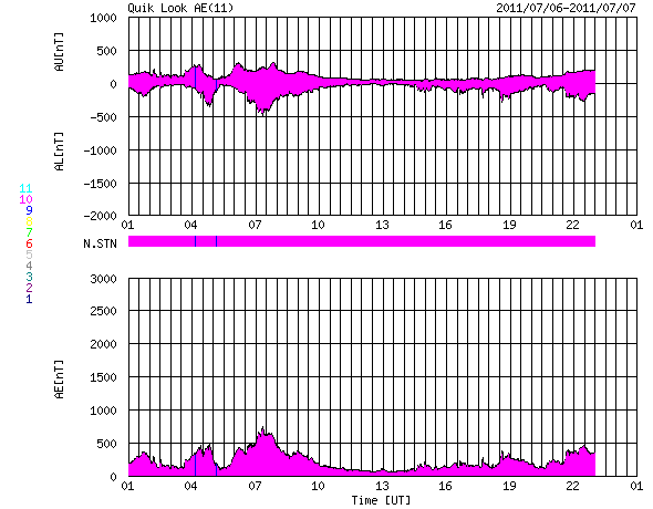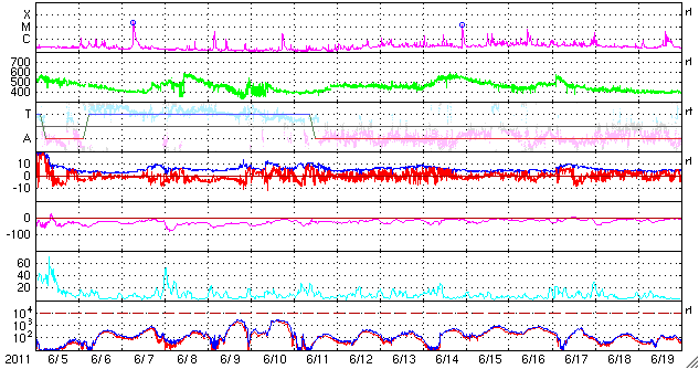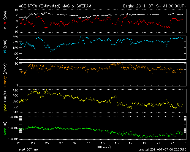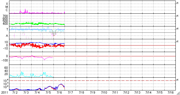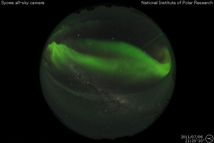 2011/ 7/ 7 09:32 更新 太陽風の速度は低速気味になっています。太陽も静かです。 担当 篠原 連日の様に昭和基地の全天カメラのお世話になっていますが、 今日(日本時間では今朝)も、美しいオーロラの活動が撮影されていました。 世界時6日21時半の南極のオーロラを動画で紹介します。 AE指数を見ると、300nTの小規模の活動が記録されています。 背後に重なる天の川との共演が美しいです。 そういえば、今夜は七夕です。 今夜、もし晴れていたら、夜空を見上げてみて下さい(鹿児島は絶望的です・・・)。 (昭和基地は南極にあるため、掲載の写真に七夕の星たちは写っていません) 太陽風は、速度が370km/秒と更に下がってきました。 磁場強度は5nT付近で安定していて、 CMEの影響は見られません。 こちらは、今日いっぱいは様子を見る必要があるでしょう。 SDO AIA193の太陽コロナ写真では、北半球側の小さなコロナホールが、 西側に進んでいます。 もう2日ほど経った、9日、10日頃の太陽風に影響が見られるかもしれません。 また、南半球側東寄りの緯度が高めの領域にもコロナホールがあります。 11日以降も、引き続いてこちらの影響がやって来る可能性があります。 前周期のこのあたりの太陽風は、 450〜550km/秒とやや高めの速度が続いていました。 今回も同程度の変化になるのかもしれません。 太陽の活動は静かです。 黒点も、1243黒点群がぽつんと見える程度です。 南極の昭和基地で全天カメラにより撮影された、オーロラの様子。 (c) 国立極地研究所、(動画加工 : 宇宙天気ニュース) ![]() SDO衛星のAIA193カメラによる太陽コロナの様子 (c) SDO (NASA) ![]() SDO衛星による太陽の可視光写真。マウスの矢印を写真に重ねると、黒点番号付きの写真に切り替わります。 (c) SDO (NASA) ![]() ACEが観測した太陽風の磁場(1番上の枠、白線は全体の強度、赤線は南北成分) および、太陽風の密度(3番目の橙線)、速度(4番目の黄線) (c) NOAA/SWPC ![]() リアルタイムAE指数 下段のAEグラフの値が高くなると、オーロラ活動が活発化しています。 (c) 京都大学, NICT ![]() 27日の太陽周期に合わせたデータプロット 太陽が同じ面を地球に向けていた27日前の変化から、今後を予想することができます。 (c) 作図:宇宙天気ニュース