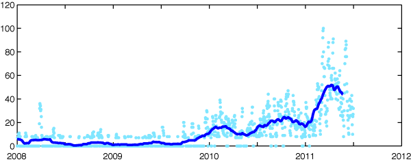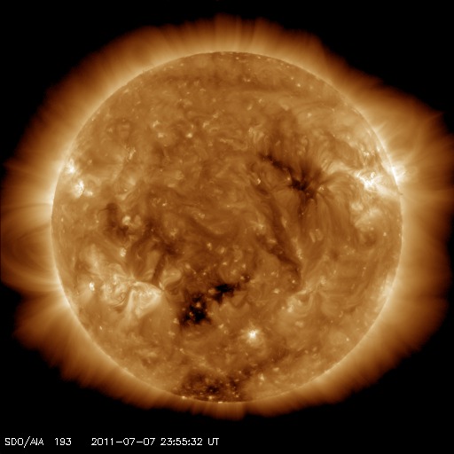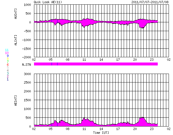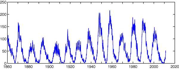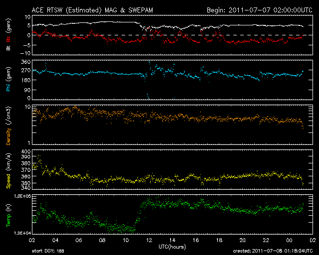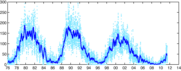 2011/ 7/ 8 10:18 更新 最近の黒点数の変化を紹介します。太陽風は低速ですが、小さいオーロラ活動は発生しています。 担当 篠原 最近の黒点数の様子をグラフで見てみましょう(かなり久しぶりです)。 1枚目の図は、第21活動周期から現在の第24活動周期まで、35年間の黒点数の推移。 2枚目は、2008年から現在まで、立ち上がって来る期間の拡大図。 3枚目は、1860年以降の150年間の様子です。 図の青点は1日の黒点数を、青線は3カ月の平均値を示しています。 2011年6月のデータまで含んでいます。 2008〜2009年のどん底を通りすぎて、2010年以降は黒点数も増えてきましたが、 その数値はまだまだ低く、 1日の黒点数も最高値がちょうど100に達した(2011年3月8日)程度です。 今年は、春頃に高めに上がったのですが、最近はまたグラフが下がっています。 黒点数の変化に波があるのは、過去の周期でも同じですが、 今期は過去の変化と比較しても、なかなか高まっていきません。 3枚目は、過去150年間の様子ですが、 この中でも最も低い山のひとつになるかもしれないという予想も、 NASAのグループから出されています。 今期の極大を見届けるには、まだ3年くらいかかるでしょう。 のんびりと今後の推移を見守って下さい。 現在の太陽風は、速度が360km/秒に下がり、一段と低速風になりました。 磁場強度も5nTで安定しています。 磁気圏も概ね静穏ですが、 太陽風の磁場が南寄りになっているため、 小規模のオーロラ活動は度々発生しています。 今日の太陽風はこのまま穏やかでしょう。 そして、明日か明後日くらいから、コロナホールの影響がやって来るかもしれません。 SDO衛星AIA193の太陽コロナ写真を見ると、 太陽の中心付近の南北に、西から東にかけて小規模のコロナホールが分布しています。 どれも規模は小さいので、影響は小さいですが、 やや高速程度の太陽風が5日程度続くかもしれません。 太陽は、東に1245黒点群が現れました。 この南側の領域や、西端の1243、1244黒点群などでBクラスの小さな活動が続いています。 (最大の現象はC1.0に達しています) 東側の領域は、今後どうなるでしょうか。 太陽の第21〜24活動周期の黒点数の推移。青線は3カ月平均値。 (c) 黒点データ:SIDC、作図:宇宙天気ニュース ![]() 2008年以降の拡大図。 (c) 黒点データ:SIDC、作図:宇宙天気ニュース ![]() 過去150年間の黒点数の変化。青線は3カ月平均値。 (c) 黒点データ:SIDC、作図:宇宙天気ニュース ![]() SDO衛星のAIA193カメラによる太陽コロナの様子 (c) SDO (NASA) ![]() SDO衛星による太陽の可視光写真。マウスの矢印を写真に重ねると、黒点番号付きの写真に切り替わります。 (c) SDO (NASA) ![]() ACEが観測した太陽風の磁場(1番上の枠、白線は全体の強度、赤線は南北成分) および、太陽風の密度(3番目の橙線)、速度(4番目の黄線) (c) NOAA/SWPC ![]() リアルタイムAE指数 下段のAEグラフの値が高くなると、オーロラ活動が活発化しています。 (c) 京都大学, NICT ![]() 27日の太陽周期に合わせたデータプロット 太陽が同じ面を地球に向けていた27日前の変化から、今後を予想することができます。 (c) 作図:宇宙天気ニュース