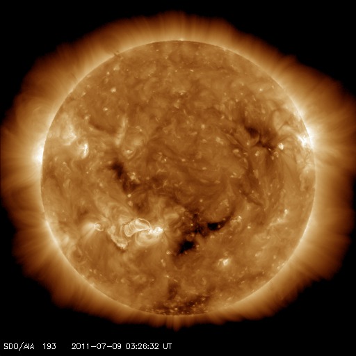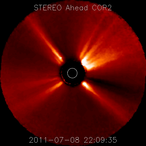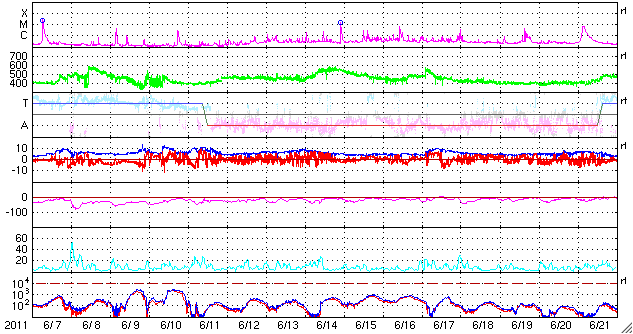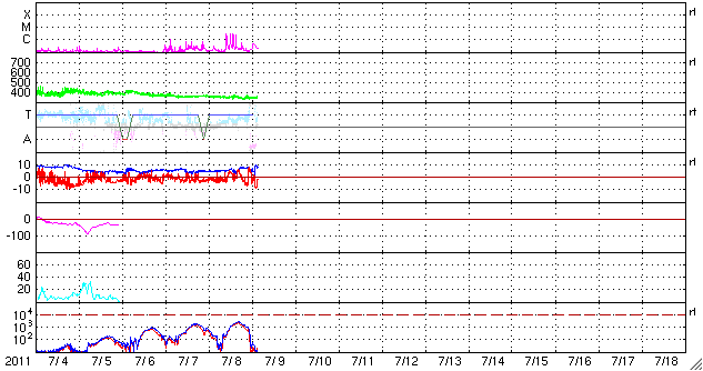 2011/ 7/ 9 13:03 更新 1247黒点群がフレア活動を起こしています。弱いCMEも発生し、地球へ向かっている様です。 担当 篠原 太陽の南半球中央付近に1247黒点群が現れ、活動を強めています。 昨夕、8日18時半(世界時8日9時半)から、深夜9日0時(世界時8日15時)にかけて、 C3.0、C2.8、C3.1、C2.3と、 ほとんど同じ規模の短時間型の小規模フレアを 連続的に4回発生させています。 とても印象的なX線のグラフになっています。 X線カメラの動画でも、チカチカと点滅する様に輝く様子が見えます。 更に、1247黒点群は、今朝9日10時(世界時9日1時)には、 B5と小規模ですが長時間型のフレアを起こしました。 これにより、地球方向にCME(太陽ガスの放出現象)が噴出しています。 STEREO Aheadの動画を掲載します。 4日後の13日頃に太陽風の乱れが到来するかもしれません。 1247黒点群の活動に、引き続き注目してください。 太陽風は、今朝より磁場強度が強まり始め、 5nTから現在は10nTに上がっています。 プラズマの密度も10個/cm^3に増えていて、 コロナホールの影響が始まっているのかもしれません。 太陽風の速度は変化なく、350km/秒と低速を保っています。 磁場強度の高まりに続いて、こちらも上昇を始めるのか、 変化は磁場強度だけになるのか、この後のACEのデータにも注意が必要です。 磁気圏のオーロラ活動は、これまでは小さな活動が見られる程度でしたが、 太陽風磁場が強まって、大きく南を向く変化が発生しているため、 この影響で中規模のオーロラ活動へ強まる可能性もあります。 磁場強度が強まっている間は、強く南向きに振れる可能性があるため、注意が必要です。 現在の太陽風の変化が、コロナホールに起因するものであれば、 これから4〜5日程度太陽風に変動が続く可能性があります。 また、13日頃には、今日のCMEの影響が重なって現れるかもしれません。 GOES-15衛星のX線カメラによる、連続的に4回発生したCクラスのフレア。 (c) NOAA/SWPC 、(動画加工 : 宇宙天気ニュース) ![]() GOES-15衛星のX線カメラによる、1247黒点群で発生した長時間型のフレア。 (c) NOAA/SWPC 、(動画加工 : 宇宙天気ニュース) ![]() STEREO aheadによる地球方向に噴き出すCMEの様子。 (c) NASA 、(動画加工 : 宇宙天気ニュース) ![]() SDO衛星のAIA193カメラによる太陽コロナの様子 (c) SDO (NASA) ![]() SDO衛星による太陽の可視光写真。マウスの矢印を写真に重ねると、黒点番号付きの写真に切り替わります。 (c) SDO (NASA) ![]() GOES衛星の太陽X線データ (c) NOAA/SWPC ![]() ACEが観測した太陽風の磁場(1番上の枠、白線は全体の強度、赤線は南北成分) および、太陽風の密度(3番目の橙線)、速度(4番目の黄線) (c) NOAA/SWPC ![]() リアルタイムAE指数 下段のAEグラフの値が高くなると、オーロラ活動が活発化しています。 (c) 京都大学, NICT ![]() 27日の太陽周期に合わせたデータプロット 太陽が同じ面を地球に向けていた27日前の変化から、今後を予想することができます。 (c) 作図:宇宙天気ニュース