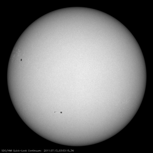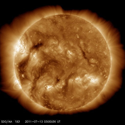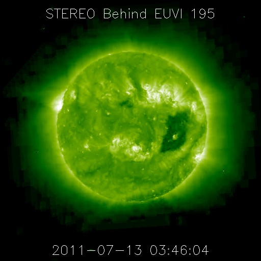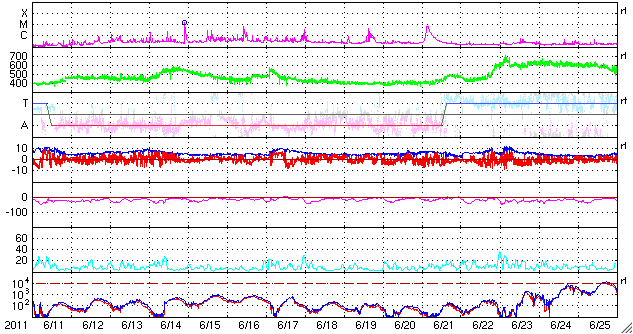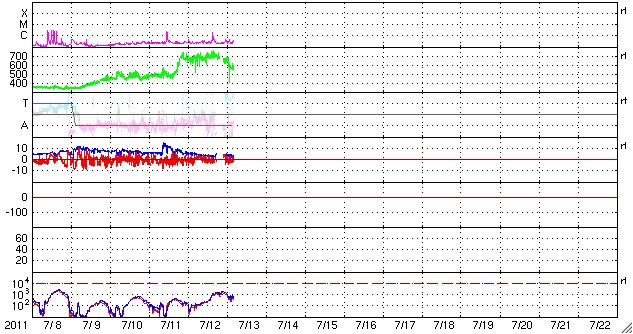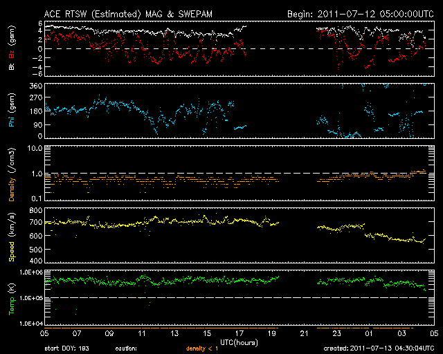 2011/ 7/13 13:30 更新 太陽風は、550km/秒に下がりましたが、高速状態が続いています。磁気圏は小さな活動程度です。 担当 篠原 太陽風は、今朝まで700km/秒近くの高い速度が続きました。 その後下がり始めて、現在は550km/秒と普通の高速風に下がっています。 最高速度の領域は通りすぎたようですが、 コロナホールの影響はもうしばらく続いて、 今後も2日程度高速状態が続く可能性があります。 太陽風の速度はかなり高まりましたが、 磁気圏のオーロラ活動はそれほど活発にならず、 AE指数は300〜500nTと小規模の変動に留まっています。 これは、太陽風磁場の南北成分が0nT付近で小さく変化していた影響だと思います。 SDO衛星AIA193の太陽コロナ写真では、 東端にコロナホールの暗い領域が見えてきました。 STEREO BehindのEUVI195の写真を1枚目に掲載します。 太陽を横から見ているこの写真では、 コロナホールはかなり大きな姿をしています。 SDOでも、明後日くらいには同じ様な姿を見ることができるでしょう。 7月20日頃から、このコロナホールによる太陽風の乱れが発生しそうです。 太陽の南半球では、西側の1247黒点群、中央やや東の1250黒点群、 そして東端の向こう側にある活動領域などで小さなフレア活動が発生しています。 小さな変化ばかりですが、少しにぎやかになっています。 STEREO Behind EUVI195による、太陽の東側(左側)のコロナの様子。右端に大きなコロナホールが見える。 (c) NASA ![]() SDO衛星のAIA193カメラによる太陽コロナの様子 (c) SDO (NASA) ![]() SDO衛星による太陽の可視光写真。マウスの矢印を写真に重ねると、黒点番号付きの写真に切り替わります。 (c) SDO (NASA) ![]() ACEが観測した太陽風の磁場(1番上の枠、白線は全体の強度、赤線は南北成分) および、太陽風の密度(3番目の橙線)、速度(4番目の黄線) (c) NOAA/SWPC ![]() リアルタイムAE指数 下段のAEグラフの値が高くなると、オーロラ活動が活発化しています。 (c) 京都大学, NICT ![]() 27日の太陽周期に合わせたデータプロット 太陽が同じ面を地球に向けていた27日前の変化から、今後を予想することができます。 (c) 作図:宇宙天気ニュース