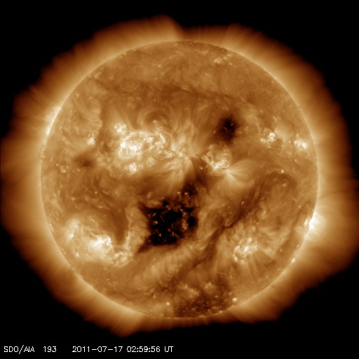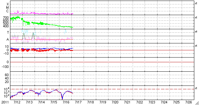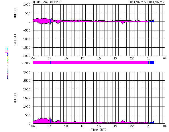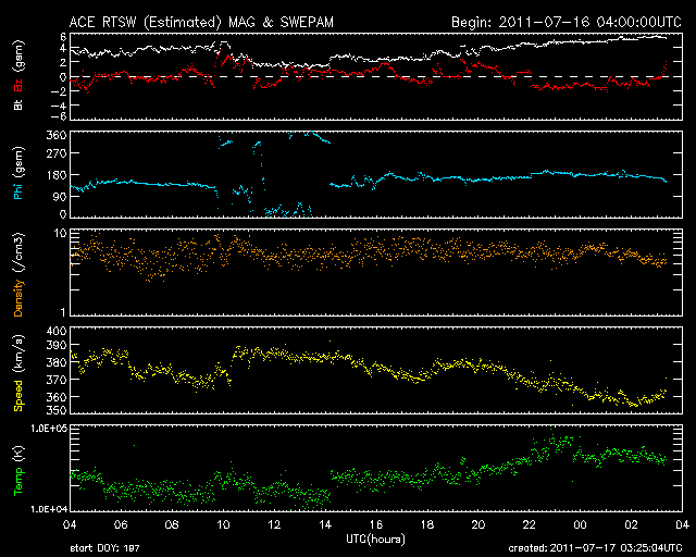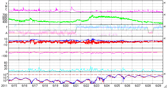 2011/ 7/17 12:26 更新 低速の太陽風が続いています。明日以降、コロナホールの影響がいつ始まるでしょうか。 担当 篠原 太陽風の速度は、380km/秒から360km/秒へ、 小幅の変化ですが、一段と低速になっています。 磁場強度も、昨日のニュースの後は、2〜3nTへ弱まりました。 今朝に入って上昇して、現在は6nT近くです。 SDO AIA193の太陽コロナ写真では、北西(右上)のコロナホールは西側へ進み、 明日くらいに地球へ影響が始まる目安の位置に達します。 コロナホールの位置や広がりから、実際に太陽風に変化が発生するかどうかは微妙ですが、 以降、19、20日と南半球側のより大きな領域からの影響が及び始まるので、 しばらく太陽風の推移に注目して下さい。 現在の磁気圏は静穏です。 AE指数はほとんど変化していません。 太陽は、小さいですが、黒点がにぎやかに見えています。 南東(左下)の1254黒点群は、B6の小さなフレアを起こし、 北西(右上)にはまだ番号の付いていない黒点が現われています。 しかし、フレア活動としては穏やかです。 今日の鹿児島は、台風の影響で東の風がだいぶ強まっています。 台風はまだ1000km近く遠くにある様なのですが、すごいエネルギーです。 SDO衛星のAIA193カメラによる太陽コロナの様子 (c) SDO (NASA) ![]() SDO衛星による太陽の可視光写真。マウスの矢印を写真に重ねると、黒点番号付きの写真に切り替わります。 (c) SDO (NASA) ![]() ACEが観測した太陽風の磁場(1番上の枠、白線は全体の強度、赤線は南北成分) および、太陽風の密度(3番目の橙線)、速度(4番目の黄線) (c) NOAA/SWPC ![]() リアルタイムAE指数 下段のAEグラフの値が高くなると、オーロラ活動が活発化しています。 (c) 京都大学, NICT ![]() 27日の太陽周期に合わせたデータプロット 太陽が同じ面を地球に向けていた27日前の変化から、今後を予想することができます。 (c) 作図:宇宙天気ニュース