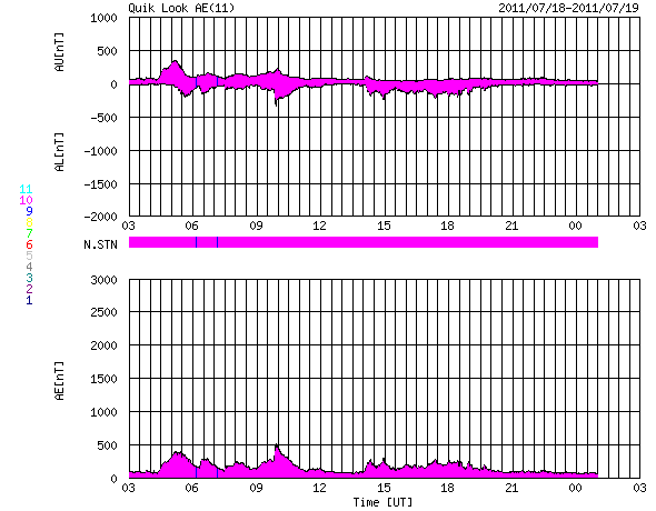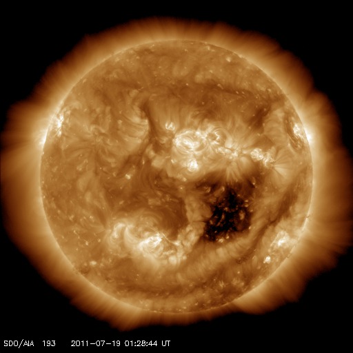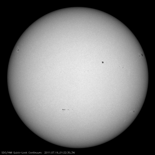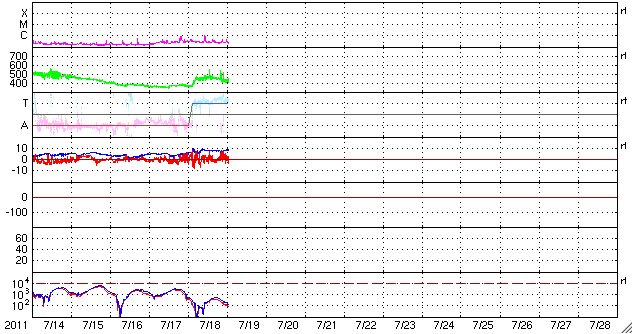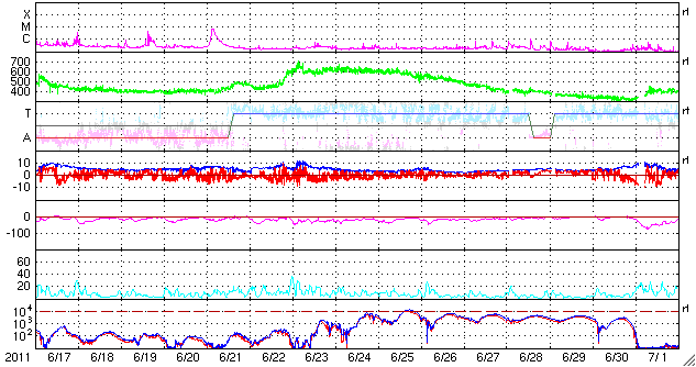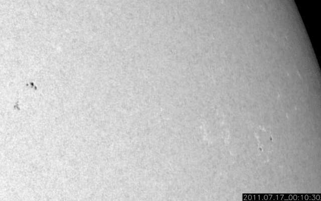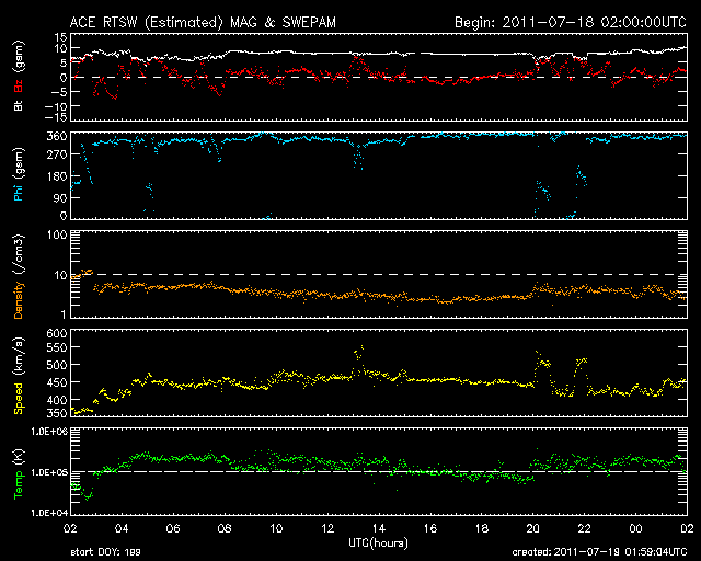 2011/ 7/19 11:00 更新 コロナホールの影響が及び始めています。太陽風の速度は450km/秒に上がりました。 担当 篠原 SDO衛星の高解像度写真より、 太陽の北西に現われた1257黒点群の発達の様子を見てみましょう。 17日から18日にかけての動画です(ファイルサイズが大きいです)。 小さな姿で現われた黒点が、ぐんぐん大きくなって行く様子をご覧ください。 半暗部(黒点周囲の薄暗い部分)が広がって行く様子や、 黒点が反時計方向に回って行く様子も見えます。 昨日のニュースの直後、18日12時(世界時18日3時)頃から、 太陽風の速度(ACEの図の黄色線)は上昇を始め、 2時間後には450km/秒とやや高めの速度になりました。 コロナホールの影響が及び始めた様です。 その後ほぼ一日が経過して、現在も430〜450km/秒と安定した速度を保っています。 一方、磁場強度(白線)も8〜9nTに強まっています。 この後の、大きな速度上昇へつながる変化でしょうか。 SDO衛星のAIA193では、 南半球の大きなコロナホール(写真で暗く穴のように見えている領域)が、 地球への影響開始位置に近づいています。 今後、600km/秒程度に達する高速太陽風が到来すると思われます。 引き続きACEのデータに注目してください。 磁気圏のオーロラ活動は小規模です。 速度は、数値としてはそれほど高まっていませんし、 磁場も強まっていますが、南北成分(赤線)は0nT付近を変化しているだけです。 今後、太陽風の速度が更に高まれば、磁気圏への影響度は大きくなります。 しかし、実際にオーロラ活動につながるには、 磁場が南向きに(赤線がマイナス方向に)振れることが必要です。 ACEのデータでは、この点にも注目してください。 太陽は、黒点はあちこちに現われていますが、フレア活動は低調です。 昨日は、南半球の中央部の1254黒点群で、 C1.0の小規模フレアが発生した程度です。 17〜18日にかけて見られた、1257黒点群の発達の様子。SDO衛星より。 (c) SDO (NASA)、 (動画加工 : 宇宙天気ニュース) ![]() SDO衛星のAIA193カメラによる太陽コロナの様子 (c) SDO (NASA) ![]() SDO衛星による太陽の可視光写真。マウスの矢印を写真に重ねると、黒点番号付きの写真に切り替わります。 (c) SDO (NASA) ![]() ACEが観測した太陽風の磁場(1番上の枠、白線は全体の強度、赤線は南北成分) および、太陽風の密度(3番目の橙線)、速度(4番目の黄線) (c) NOAA/SWPC ![]() リアルタイムAE指数 下段のAEグラフの値が高くなると、オーロラ活動が活発化しています。 (c) 京都大学, NICT ![]() 27日の太陽周期に合わせたデータプロット 太陽が同じ面を地球に向けていた27日前の変化から、今後を予想することができます。 (c) 作図:宇宙天気ニュース