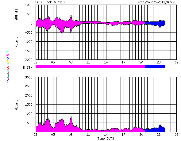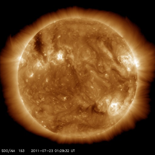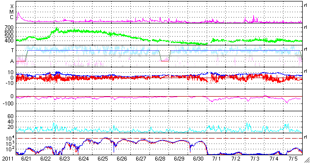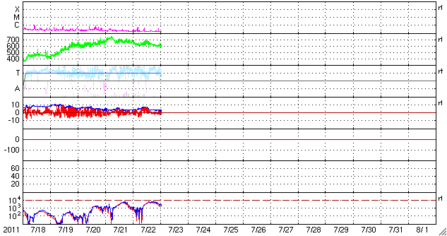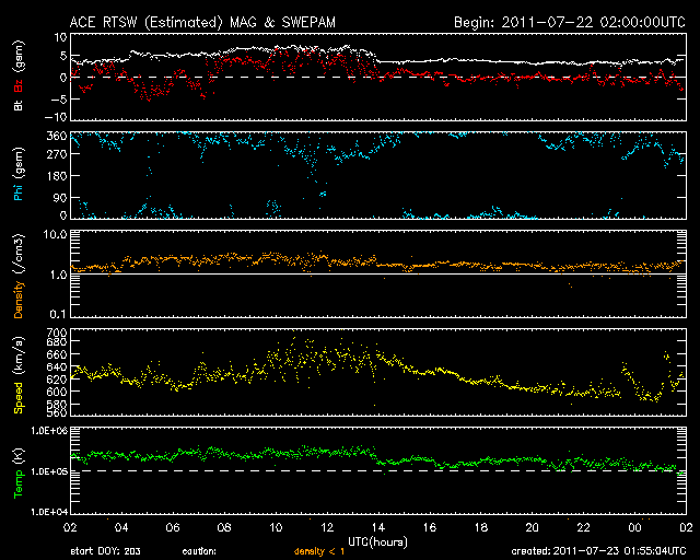 2011/ 7/23 10:56 更新 高速太陽風は600km/秒を割りました。高速風は後半に入っています。 担当 篠原 700km/秒台にまで達した今回の高速太陽風も、後半に入っています。 磁場強度が3nTに弱まり、速度も600km/秒台を割ろうとしているところです。 まだ2日程度は500km/秒台の高速風が続きそうですが、 地球の磁気圏への影響は次第に弱まって行きます。 加えて、現在の太陽風磁場は南北成分がほとんど0nT付近にあり、 AE指数によるオーロラ活動のグラフは、既にかなり静かです。 今日の図では、前半までは500nT前後の変化がありますが、 後半は300nT以下の変化しか見られません。 この後も、速度が下がるにつれて、一層静かになって行きそうです。 SDO AIA193では、太陽の中心付近はぼんやりと光って、コロナホールはなく、 高速風の後は、しばらく穏やかな日が続きそうです。 放射線帯の高エネルギー電子は、昨日よりも増えていますが、 10,000の線には達しませんでした。 高速風が続いているので、今後の変化を見る必要はありますが、 これから大きく増加することはないでしょう。 太陽のX線のグラフは目立った変化はなく、フレア活動は穏やかです。 SDO衛星のAIA193カメラによる太陽コロナの様子 (c) SDO (NASA) ![]() SDO衛星による太陽の可視光写真。マウスの矢印を写真に重ねると、黒点番号付きの写真に切り替わります。 (c) SDO (NASA) ![]() ACEが観測した太陽風の磁場(1番上の枠、白線は全体の強度、赤線は南北成分) および、太陽風の密度(3番目の橙線)、速度(4番目の黄線) (c) NOAA/SWPC ![]() リアルタイムAE指数 下段のAEグラフの値が高くなると、オーロラ活動が活発化しています。 (c) 京都大学, NICT ![]() 27日の太陽周期に合わせたデータプロット 太陽が同じ面を地球に向けていた27日前の変化から、今後を予想することができます。 (c) 作図:宇宙天気ニュース