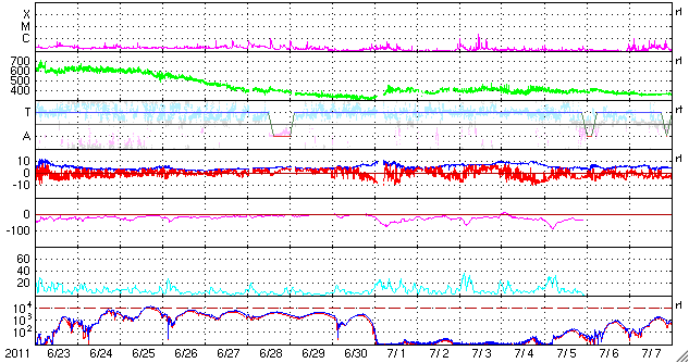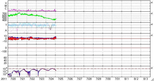 2011/ 7/22 10:03 660km/秒に少し下がりましたが、高速太陽風は続いています。オーロラの活動は弱まっています。