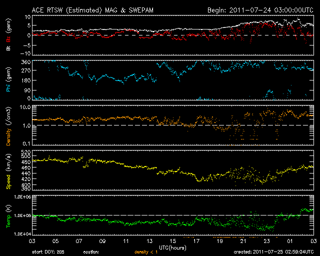 2011/ 7/20 13:23 600km/秒台の高速太陽風が始まりました。オーロラの活動も強まっています。