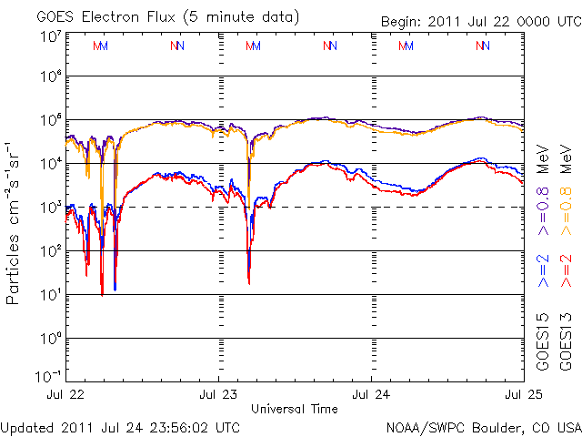 放射線帯電子が強くなっています。太陽放射線は静穏です。