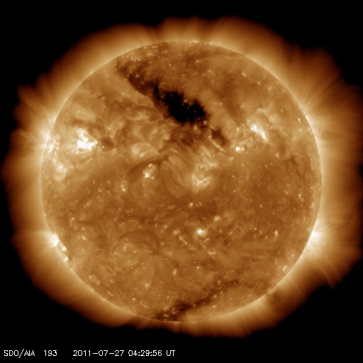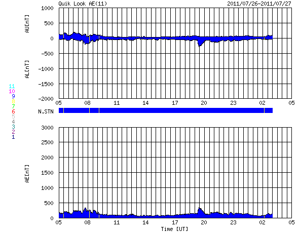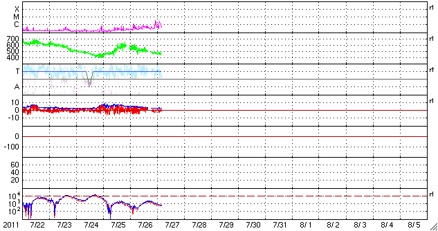 2011/ 7/27 13:57 更新 新しく現れた黒点群で小規模フレアが発生しました。太陽風の速度は下がりつつあります。 担当 篠原 太陽の東から現れた1260黒点群で、今朝、C3の小規模フレアが2回発生しました。 1260群は、黒点としても昨日より発達しているようです。 また、その東の端に1261黒点群が顔を出しています。 こちらも比較的活動的な黒点群の様です。 これからしばらく、この2つの黒点群の動向に注目する必要がありそうです。 太陽風は、速度がゆっくりと下がって、470km/秒になっています。 まだ、やや高速の状態ですが、引き続き平均的な速度へ下がって行くでしょう。 磁気圏のオーロラ活動は静かです。 AE指数はほとんど変化していません。 SDO AIA193を見ると、北半球高緯度側のコロナホールが、 太陽の中心線を越えています。 緯度が高めなので、どの程度地球へ影響が及ぶのか分かりにくいですが、 28日の後半か29日ころから、太陽風に再び乱れが発生するかもしれません。 ただし、前周期の太陽風の乱れは小さかったのです、 今回も同様の可能性はあります。 放射線帯高エネルギー電子は、昨日とほとんど変わらず、 数千のレベルで止まっています。 SDO衛星のAIA193カメラによる太陽コロナの様子 (c) SDO (NASA) ![]() SDO衛星による太陽の可視光写真。マウスの矢印を写真に重ねると、黒点番号付きの写真に切り替わります。 (c) SDO (NASA) ![]() GOES衛星の太陽X線データ (c) NOAA/SWPC ![]() ACEが観測した太陽風の磁場(1番上の枠、白線は全体の強度、赤線は南北成分) および、太陽風の密度(3番目の橙線)、速度(4番目の黄線) (c) NOAA/SWPC ![]() リアルタイムAE指数 下段のAEグラフの値が高くなると、オーロラ活動が活発化しています。 (c) 京都大学, NICT ![]() 27日の太陽周期に合わせたデータプロット 太陽が同じ面を地球に向けていた27日前の変化から、今後を予想することができます。 (c) 作図:宇宙天気ニュース