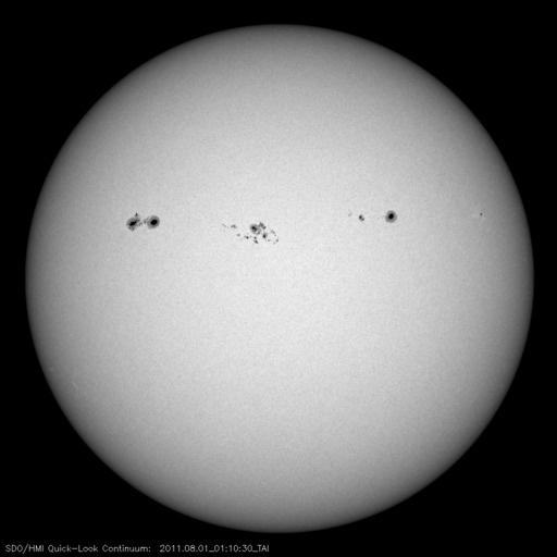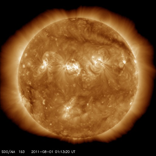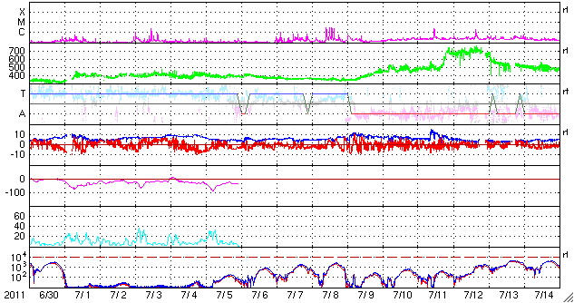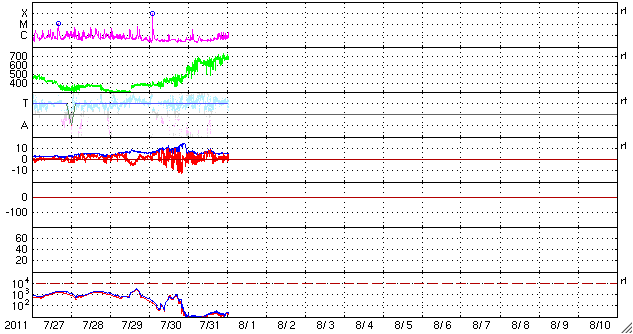 2011/ 8/ 1 10:50 更新 太陽風の速度は600km/秒台後半まで上がっています。太陽では小さなフレア活動が増えています。 担当 篠原 太陽風の速度は、昨日から今日にかけて更に高まり、 今朝、680km/秒にまで達しました(最新値は660km/秒付近)。 コロナホールが高緯度側に分布していたことを考えると、 ここまで影響が強まるとは思いませんでした。 太陽風の磁場強度は5nTと平均的な強さです。 コロナホールによる高速風の場合、この強度だとあまり速度は下がらず、 磁場強度が3nTくらいに弱まるとともに速度も低下していく事が多いのですが、 今回はどうでしょうか。 一方、磁気圏のオーロラ活動は、 AE指数で500nT以下の小規模の活動が断続的に発生しています。 太陽風磁場の南北成分が北寄りのため、 オーロラ活動はあまり活発になっていません。 それでも、500nT近くの変動が出ているのは、 速度がかなり上がっているためでしょう。 太陽では、昨夜くらいから再びフレア活動が高まり、 C1の小さな小規模フレアばかりですが、 左端の1263黒点群や、右端の1265黒点群で次々発生しています。 GOES衛星のX線カメラを見ていると、 その間の1261黒点群でも小さな活動が発生しています。 4つ並んだ黒点群達の動きには、まだ注意が必要です。 この5日間のこれらの黒点群の様子を動画で紹介します。 ファイルサイズがかなり大きくなりますが、どうぞご覧下さい。 SDOの可視光写真による、東西に並んだ4つの黒点群の変化。 (c) SDO (NASA)、 (動画加工 : 宇宙天気ニュース) ![]() SDO衛星のAIA193カメラによる太陽コロナの様子 (c) SDO (NASA) ![]() SDO衛星による太陽の可視光写真。マウスの矢印を写真に重ねると、黒点番号付きの写真に切り替わります。 (c) SDO (NASA) ![]() ACEが観測した太陽風の磁場(1番上の枠、白線は全体の強度、赤線は南北成分) および、太陽風の密度(3番目の橙線)、速度(4番目の黄線) (c) NOAA/SWPC ![]() リアルタイムAE指数 下段のAEグラフの値が高くなると、オーロラ活動が活発化しています。 (c) 京都大学, NICT ![]() 27日の太陽周期に合わせたデータプロット 太陽が同じ面を地球に向けていた27日前の変化から、今後を予想することができます。 (c) 作図:宇宙天気ニュース