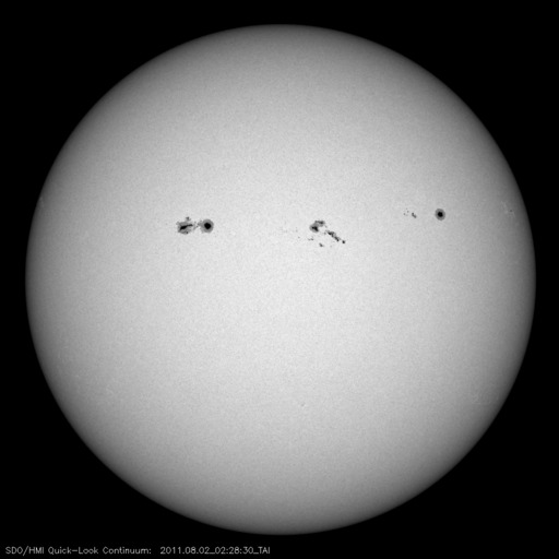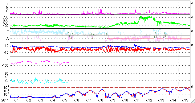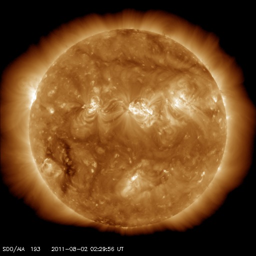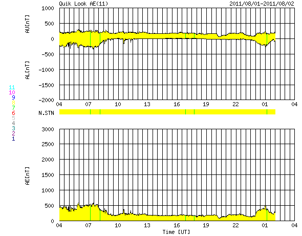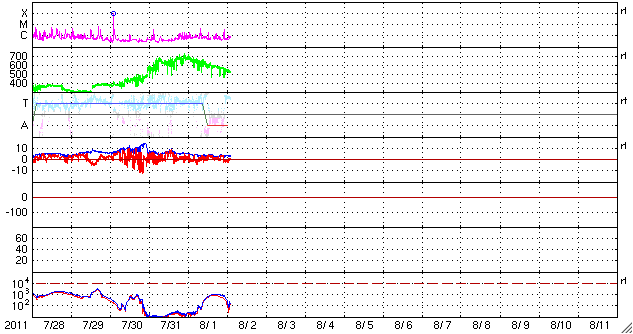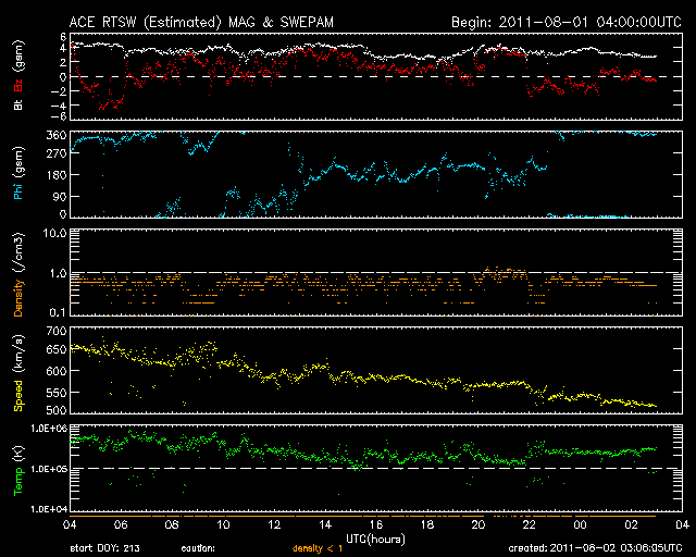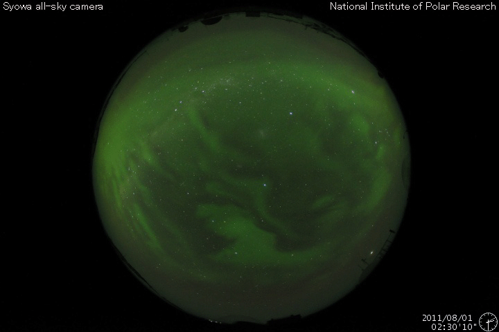 2011/ 8/ 2 12:07 更新 太陽風の速度は500km/秒近くに下がりました。太陽はCクラスフレアを数回起こしています。 担当 篠原 太陽風の速度は、下がり続けていますが現在もまだ520km/秒と高速状態です。 31日に高速風が始まって、2日半程が経過しています。 南極の昭和基地で、1日の明け方(世界時1日2〜4時)に撮影された オーロラの動画を掲載します。 もこもこしたオーロラが雲のように流れて行く様子が見えます。 この時間帯、AE指数では500nTほどの変動が連続的に発生していました。 AE指数の図の後半は、変化は小さくなっています。 高速太陽風は、今日、明日で終わり、 数日程度、静かな太陽風になると思います。 SDO衛星AIA193を見ると、太陽の南東(左下)に、 コロナホールの暗い領域が見えています。 次の太陽風の乱れは、このコロナホールが影響することになるでしょう。 太陽は、1261黒点群と1263黒点群で、 C1〜C4の小規模フレアが数時間おきに発生しています。 SDO AIA193やGOES X線カメラの動画を見ると、小さな爆発が頻繁に起きています。 黒点は、昨日と同様に大きな姿を保っています。 この後も、これらの黒点群によるフレア活動に注意が必要でしょう。 NOAA/SWPCの予報では、Mクラスの中規模フレアの確率を60%としています。 南極の昭和基地で全天カメラにより撮影された、朝を迎える頃のオーロラ。 (c) 国立極地研究所、(動画加工 : 宇宙天気ニュース) ![]() SDO衛星のAIA193カメラによる太陽コロナの様子 (c) SDO (NASA) ![]() SDO衛星による太陽の可視光写真。マウスの矢印を写真に重ねると、黒点番号付きの写真に切り替わります。 (c) SDO (NASA) ![]() ACEが観測した太陽風の磁場(1番上の枠、白線は全体の強度、赤線は南北成分) および、太陽風の密度(3番目の橙線)、速度(4番目の黄線) (c) NOAA/SWPC ![]() リアルタイムAE指数 下段のAEグラフの値が高くなると、オーロラ活動が活発化しています。 (c) 京都大学, NICT ![]() 27日の太陽周期に合わせたデータプロット 太陽が同じ面を地球に向けていた27日前の変化から、今後を予想することができます。 (c) 作図:宇宙天気ニュース
