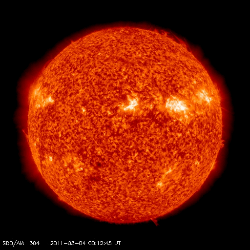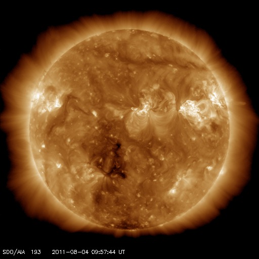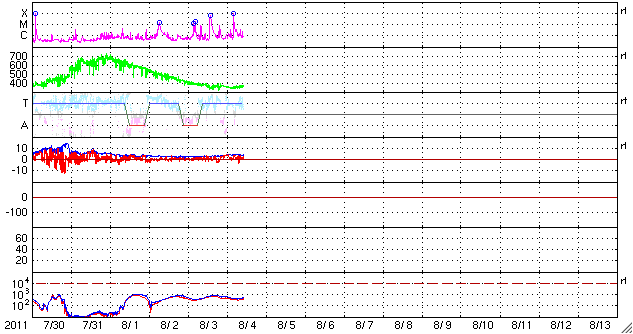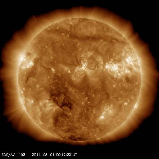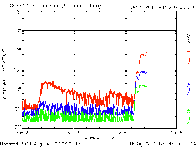 2011/ 8/ 4 19:31 更新 M9.3フレア発生以降の状況 (速報) 担当 篠原 今日2回目の更新です。 前号もご覧ください。 4日12時半(世界時4日3時半)に、 1261黒点群でM9.3のかなり大きな中規模フレアが発生しました。 関連するデータがそろってきましたので、速報として紹介します。 1, 2枚目の動画は、SDO衛星のAIA193, 304です。 フレア発生時の明るい輝きと、 その直後に、コロナのガスが激しく噴き出して行く様子がよく見えます。 噴き出したCMEは、SOHO、STEREO Aheadのコロナグラフで撮影されています。 発生した1261黒点群は太陽の西側に寄っているため、CMEのガスも右側が中心ですが、 SOHOの写真では、太陽全体を包むように白いガスが広がっています。 従って、地球の方向にもCMEは噴き出していると考えられます。 噴出する様子は、横から見ているSTEREO Aheadの写真でより詳しく見ることができます。 地球はこの写真の左方向にあります。 そちらへ向かってガスが広がって行く様子をご覧ください。 昼のニュースで紹介した、M6.0のフレアによるCMEと比較すると、 ガスの広がる速度が一段速いことが分かります。 すると、2日〜2日半くらいで地球までやって来るかもしれません。 6日の昼以降はACEのデータに注目です。 (この前のCMEと重なって、太陽風は複雑な変化になるかもしれません) また、SOHOの写真では、白い筋がいくつも画面を飛び交っています。 これは、太陽放射線の増加によるものです。 GOES衛星によるプロトンの観測では、 警戒ラインの10を超えて、80近くへ増加しています。 SDO AIA 193による、1261黒点群で発生したM9.3フレア。 (c) SDO (NASA)、 (動画加工 : 宇宙天気ニュース) ![]() SDO AIA 304による、1261黒点群で発生したM9.3フレア。 (c) SDO (NASA)、 (動画加工 : 宇宙天気ニュース) ![]() SOHO LASCO C2、C3カメラと、STEREO Ahead COR2カメラによるCME。 (c) SOHO (ESA & NASA)、STEREO (NASA)、 (動画加工 : 宇宙天気ニュース) ![]() SDO衛星のAIA193カメラによる太陽コロナの様子 (c) SDO (NASA) ![]() SDO衛星による太陽の可視光写真。マウスの矢印を写真に重ねると、黒点番号付きの写真に切り替わります。 (c) SDO (NASA) ![]() GOES衛星の太陽X線データ (c) NOAA/SWPC ![]() GOES衛星の太陽放射線データ (c) NOAA/SWPC ![]() 27日の太陽周期に合わせたデータプロット 太陽が同じ面を地球に向けていた27日前の変化から、今後を予想することができます。 (c) 作図:宇宙天気ニュース