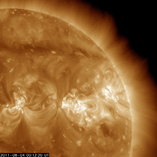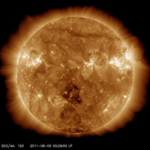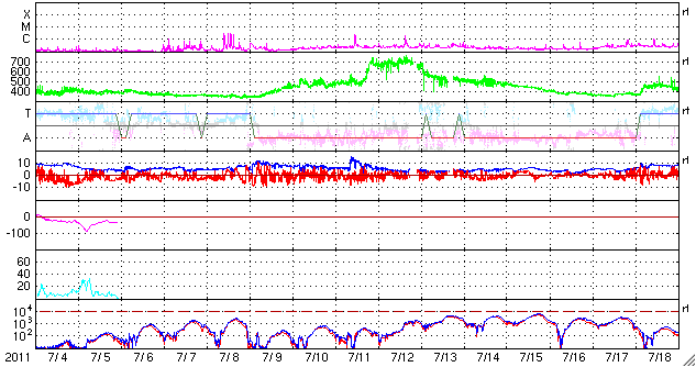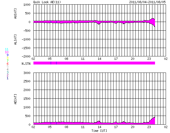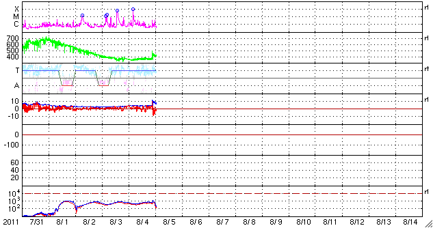 2011/ 8/ 5 10:21 更新 太陽ではフレアの発生に注意が必要です。これから明日にかけて、CMEによる太陽風の乱れが次々到来しそうです。 担当 篠原 昨日の昼、4日12時半(世界時4日3時半)に、 1261黒点群でM9.3のかなり大きな中規模フレアが発生しました。 昨日の2回目のニュースに加えて、このフレアに関連する動画を紹介します。 GOES衛星のX線カメラでは、フレアの前後で明るく光る場所の形が変化しています。 SDO衛星AIA193、304は、今日は部分拡大の動画です。 コロナの噴き上がりが良く見えています。 SOHO、STEREO Aheadは昨日とほぼ同じですが、 このCMEに続いて、もうひとつ別のCMEが発生しています。 STEREO Aheadを見ると、こちらは太陽の反対側の現象です。 1261黒点群、1263黒点群は、次第に太陽の西端に近づいています。 どちらの黒点も、大きな姿を保っていて、引き続きフレアの発生に注意が必要です。 M9.3のフレアによって、太陽放射線(非常に高速の陽子)も増加しています。 GOES衛星の観測によると、現在、50前後で推移しています。 SOHOの写真の中に白い点や筋がたくさん見えますが、太陽放射線によるノイズです。 太陽風は、今朝まで350km/秒の低速風が続いていましたが、 5日6時(世界時4日21時)に、太陽風の乱れがやって来て、 速度が430km/秒ほどに急に上昇しています。 この変化は、2日午後に発生したM1.2のフレアによるものではなさそうです。 それは、到来が早い割に速度の上昇が小さいためです。 この後に、もうひとつより大きな変化がやって来るのではないかと思います。 一方、磁場強度は、5nTから10nTに強まっています。 しかも、南北成分は最大-10nTと強い南向きになりました。 この影響で、磁気圏の活動が活発になっていると思われます。 AE指数では、その変化の始まりが見えています。 現在進行中の変化ですので、状況が分かるのはもうしばらく後です。 今後、2日午後のM1.2フレアによるCMEの影響、 そして、3日夜のM6.0、4日昼のM9.3のフレアによるCMEの影響と、 今日から明日にかけて太陽風の乱れ、 そして、磁気圏活動の強まりに注目してください。 GOES-15のX線カメラによるM9.3のフレア。 (c) NOAA/SWPC 、(動画加工 : 宇宙天気ニュース) ![]() SDO AIA 193と304による、1261黒点群で発生したM9.3フレア。 (c) SDO (NASA)、 (動画加工 : 宇宙天気ニュース) ![]() SOHO LASCO C2、C3カメラと、STEREO Ahead COR2カメラによるCME。 (c) SOHO (ESA & NASA)、STEREO (NASA)、 (動画加工 : 宇宙天気ニュース) ![]() SDO衛星のAIA193カメラによる太陽コロナの様子 (c) SDO (NASA) ![]() SDO衛星による太陽の可視光写真。マウスの矢印を写真に重ねると、黒点番号付きの写真に切り替わります。 (c) SDO (NASA) ![]() GOES衛星の太陽X線データ (c) NOAA/SWPC ![]() GOES衛星の太陽放射線データ (c) NOAA/SWPC ![]() ACEが観測した太陽風の磁場(1番上の枠、白線は全体の強度、赤線は南北成分) および、太陽風の密度(3番目の橙線)、速度(4番目の黄線) (c) NOAA/SWPC ![]() リアルタイムAE指数 下段のAEグラフの値が高くなると、オーロラ活動が活発化しています。 (c) 京都大学, NICT ![]() 27日の太陽周期に合わせたデータプロット 太陽が同じ面を地球に向けていた27日前の変化から、今後を予想することができます。 (c) 作図:宇宙天気ニュース