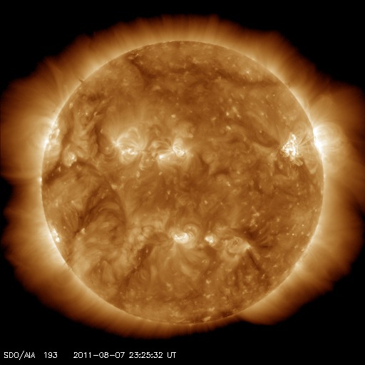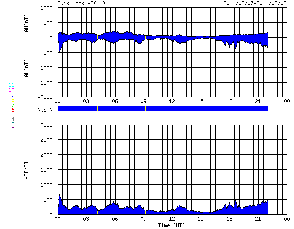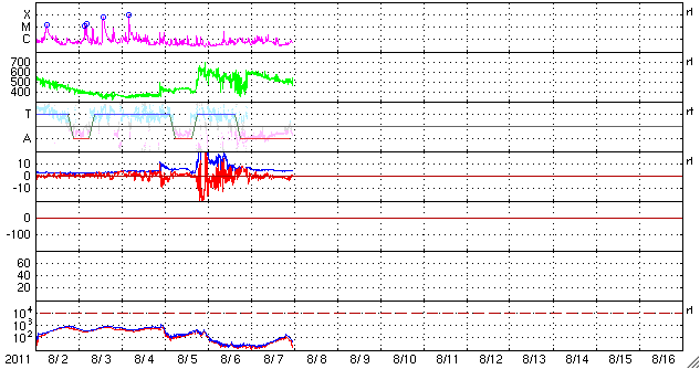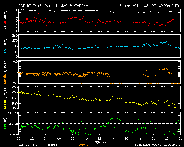 2011/ 8/ 8 08:59 更新 CMEによる高速の太陽風は終わりつつあります。太陽ではCクラスの小さなフレアが続いています。 担当 篠原 太陽風の速度は、ゆっくりと低下が続いています。 昨日は600km/秒ありましたが、現在は450〜500km/秒と高速風ぎりぎりです。 CMEによる高速太陽風は、地球を通り過ぎようとしています。 一方、磁場強度は、5nTから4nTにかけて安定しています。 コロナホールの影響は、まだ来ていないように思います。 しかし、CMEの高速風と混ざって、既にやって来ているのかもしれません。 今日、明日の太陽風の変化を見て下さい。 磁気圏では、高速風の影響を受けて、 小さなオーロラ活動が断続的に発生しています。 太陽風磁場の南北成分が、0nTから弱い南向きに変化しているためでしょう。 今日、明日は、コロナホールの影響で再び速度が上がるか、 あるいは、このまま低速風に向かうか注目してください。 その後は、4〜5日程度穏やかな太陽風が続き、 14、15日以降、次のコロナホールによる高速風に入りそうです。 放射線帯の高エネルギー電子は、今日も増加は見られず、低いままです。 太陽では、西に傾いた1263黒点群が大きな姿を見せています。 C1〜2の小規模フレアを含む活動が続いていて、 もう一段大きなフレアを発生させる可能性もあります。 SDO衛星のAIA193カメラによる太陽コロナの様子 (c) SDO (NASA) ![]() SDO衛星による太陽の可視光写真。マウスの矢印を写真に重ねると、黒点番号付きの写真に切り替わります。 (c) SDO (NASA) ![]() ACEが観測した太陽風の磁場(1番上の枠、白線は全体の強度、赤線は南北成分) および、太陽風の密度(3番目の橙線)、速度(4番目の黄線) (c) NOAA/SWPC ![]() リアルタイムAE指数 下段のAEグラフの値が高くなると、オーロラ活動が活発化しています。 (c) 京都大学, NICT ![]() 27日の太陽周期に合わせたデータプロット 太陽が同じ面を地球に向けていた27日前の変化から、今後を予想することができます。 (c) 作図:宇宙天気ニュース