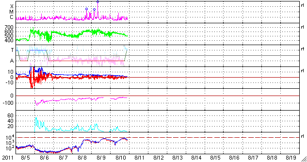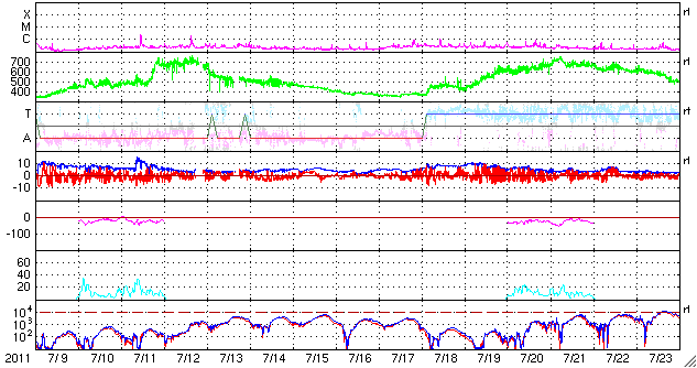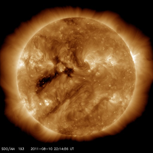 2011/ 8/11 07:53 更新 1263黒点群は西に没し、太陽は黒点がほとんど見えなくなっています。高速太陽風は終わりつつあります。 担当 篠原 1263黒点群は、昨日もC2、C6などの小規模フレアを起こしましたが、 現在は西の端に没してしまい、地球からは見えなくなりました。 今後の活動は、STEREO Aheadで見ることができます。 現在の太陽面には、非常に小さい黒点が3〜4ヶ所で見えるだけで、 久しぶりに寂しい太陽になっています。 フレア活動はしばらく静かになりそうです。 太陽風は、昨日いっぱいは550km/秒の高速風が続きましたが、 昨夜からゆっくりと下がり始め、 今朝の段階で490km/秒と500km/秒台を割っています。 この後も低下は続いて、これから4日程穏やかに推移しそうです。 AE指数は、300〜600nTの弱い変化が発生しています。 太陽風の磁場が弱い南向きになっている影響でしょう。 太陽風の速度が下がりつつあるため、今後の磁気圏活動は静かになります。 SDO衛星AIA193では、太陽の東側のコロナホールが 濃くしっかりと見えるようになりました。 先頭(右端)は、今日、明日で太陽の中央線を越えそうです。 従って、その3日後の15日くらいから地球には高速の太陽風がやって来るでしょう。 前周期の高速風は、最高速度は700km/秒に達し、5〜6日ほど続きました。 放射線帯の高エネルギー電子は、警戒ラインの10000に近く、 やや高い状態が続いています。 SDO衛星のAIA193カメラによる太陽コロナの様子 (c) SDO (NASA) ![]() SDO衛星による太陽の可視光写真。マウスの矢印を写真に重ねると、黒点番号付きの写真に切り替わります。 (c) SDO (NASA) ![]() GOES衛星の太陽X線データ (c) NOAA/SWPC ![]() ACEが観測した太陽風の磁場(1番上の枠、白線は全体の強度、赤線は南北成分) および、太陽風の密度(3番目の橙線)、速度(4番目の黄線) (c) NOAA/SWPC ![]() リアルタイムAE指数 下段のAEグラフの値が高くなると、オーロラ活動が活発化しています。 (c) 京都大学, NICT ![]() 27日の太陽周期に合わせたデータプロット 太陽が同じ面を地球に向けていた27日前の変化から、今後を予想することができます。 (c) 作図:宇宙天気ニュース