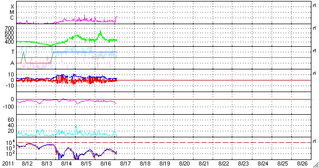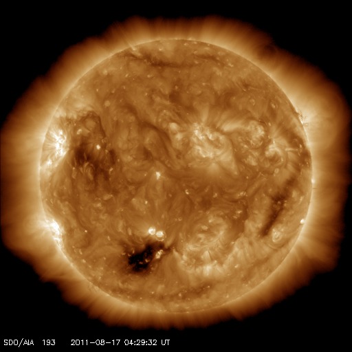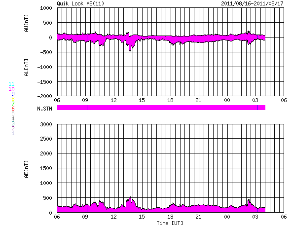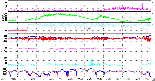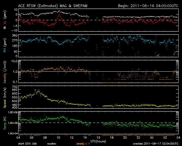 2011/ 8/17 14:01 更新 昨日、太陽風が一時的に高速になりました。現在は平均的な状態です。 担当 篠原 昨日の昼、16日12時(世界時16日3時)から、太陽風の速度は再び上昇を始め、 16日16時(世界時16日7時)には、650km/秒とかなり高い速度まで上がりました。 しかし、そこからすぐに低下が始まって、 4時間ほどで450km/秒とやや高速の風程度に戻ってしまいました。 それから、半日経過した現在まで安定した状態が続き、 現在は430km/秒と平均的な速度です。 27日周期の図を見ると、短時間の速度変化だったことが良く分かります。 コロナホールの分布によって、この様な変化になったのでしょう。 これでコロナホールの影響は通り抜け、しばらく穏やかな太陽風が続きます。 SDO AIA193の太陽コロナ写真を見ると、南半球にコロナホールがあります。 少し緯度が高めですが、4日後くらいに地球に影響が及ぶ可能性があります。 磁気圏のオーロラ活動は静穏です。 次の高速風まで、このまま静かな状態が続くでしょう。 太陽は、東端から南半球側の黒点群も姿を現しました(1272黒点群)。 黒点の規模は比較的小さいようです。 この1272黒点群は、先ほど、17日11時(世界時17日2時)に C2の小規模フレアを起こしました。 北半球側の1271黒点群とともに、今後の活動に注目してください。 今日は学校内のネットワークが不安定で、 記事を書いた後、アップロードできるまでに1時間ほどかかってしまいました。 申し訳ありません。 SDO衛星のAIA193カメラによる太陽コロナの様子 (c) SDO (NASA) ![]() SDO衛星による太陽の可視光写真。マウスの矢印を写真に重ねると、黒点番号付きの写真に切り替わります。 (c) SDO (NASA) ![]() ACEが観測した太陽風の磁場(1番上の枠、白線は全体の強度、赤線は南北成分) および、太陽風の密度(3番目の橙線)、速度(4番目の黄線) (c) NOAA/SWPC ![]() リアルタイムAE指数 下段のAEグラフの値が高くなると、オーロラ活動が活発化しています。 (c) 京都大学, NICT ![]() 27日の太陽周期に合わせたデータプロット 太陽が同じ面を地球に向けていた27日前の変化から、今後を予想することができます。 (c) 作図:宇宙天気ニュース