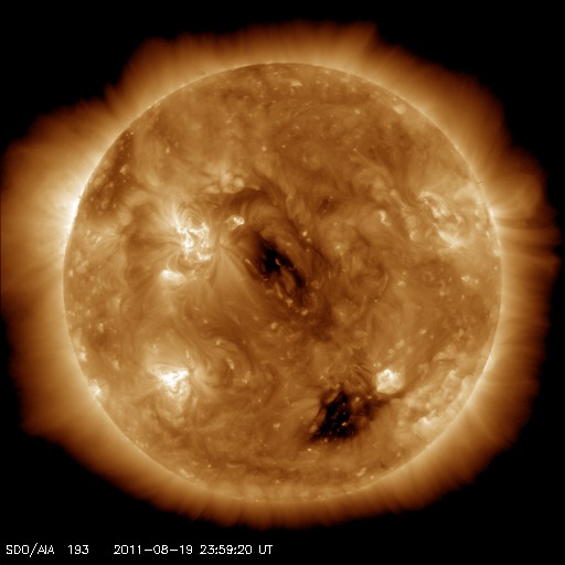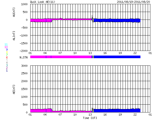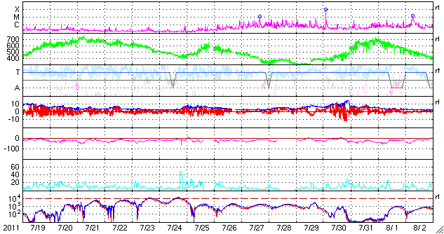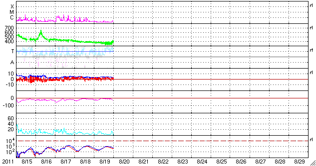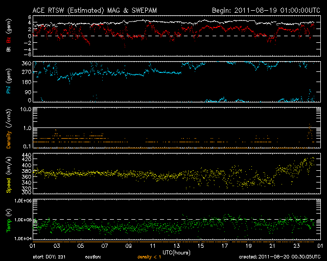 2011/ 8/20 09:30 更新 太陽風、磁気圏ともに穏やかです。明日以降、太陽風の速度が上がるかもしれません。 担当 篠原 宇宙天気は全体的に穏やかです。 太陽風の速度は、昨日のニュース以降も370km/秒とやや低速の状態が続きました。 今朝に入って、400km/秒に上がっている様ですが、 磁場強度はずっと4nTと弱めの状態で安定しています。 従って、これからすぐに太陽風が変化するということはなさそうです。 一方、SDO衛星AIA193の太陽コロナ写真を見ると、 南半球のコロナホールは次第に西側に進んでいます。 太陽の中心線から西側に半分ほど進んだ位置が、地球に影響が及び始める目安です。 明日くらいから太陽風の速度がある程度上昇するかもしれません。 これに続いて、太陽中心のコロナホールも3日後くらいから地球に影響を及ぼすでしょう。 どちらもコロナホールの規模から見て、あまり大きな乱れにはならないと思いますが、 明日以降、3〜4日間程度、太陽風の速度は高まった状態が続くかもしれません。 現在の磁気圏のオーロラ活動は静かです。 AE指数は全く変化していません。 太陽のフレア活動も静かです。 X線のグラフには目立った変化は観測されていません。 また、1271黒点群、1272黒点群はどちらも特に変化はありません。 SDO衛星のAIA193カメラによる太陽コロナの様子 (c) SDO (NASA) ![]() SDO衛星による太陽の可視光写真。マウスの矢印を写真に重ねると、黒点番号付きの写真に切り替わります。 (c) SDO (NASA) ![]() ACEが観測した太陽風の磁場(1番上の枠、白線は全体の強度、赤線は南北成分) および、太陽風の密度(3番目の橙線)、速度(4番目の黄線) (c) NOAA/SWPC ![]() リアルタイムAE指数 下段のAEグラフの値が高くなると、オーロラ活動が活発化しています。 (c) 京都大学, NICT ![]() 27日の太陽周期に合わせたデータプロット 太陽が同じ面を地球に向けていた27日前の変化から、今後を予想することができます。 (c) 作図:宇宙天気ニュース
