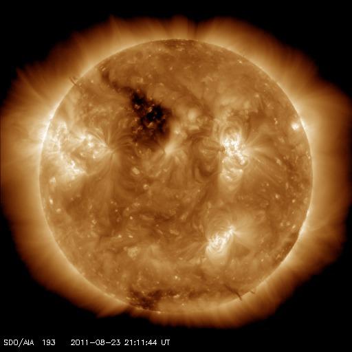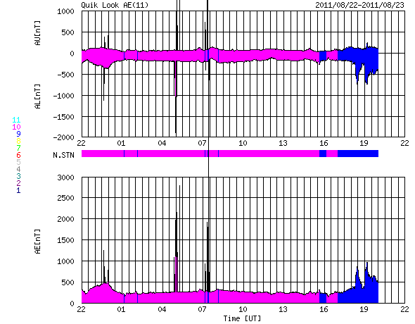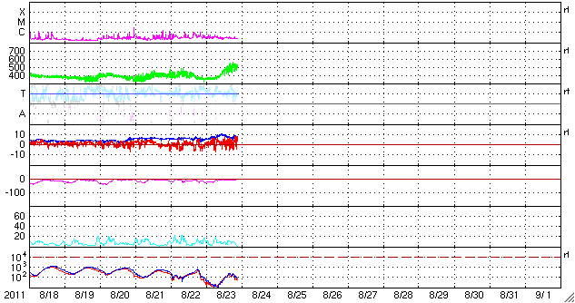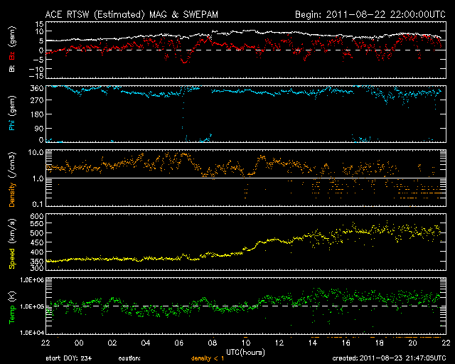 2011/ 8/24 06:47 更新 500km/秒の高速太陽風が始まりました。小規模のオーロラ活動が発生しています。 担当 篠原 昨夜、23日19時(世界時23日10時)頃から太陽風の速度は上昇を始め、 24日1時(世界時23日16時)頃に500km/秒の高速風になりました。 コロナホールの影響がやって来た様です。 磁場強度は、現在も7nTほどに強まっています. 磁場の南北成分は、北寄りに変化していますが、 時々南に振れて小規模のオーロラ活動を起こしています。 AE指数のグラフは現在も太くなっていて、変化が読みにくいですが、 500nT程度の小規模の変化が2回ほど発生しています。 コロナホールの規模から考えると、 高速太陽風は今日一杯程度続き、明日には下がっているのではないかと思います。 SDO衛星AIA193の太陽コロナ写真を見ると、 次のコロナホールが太陽の中心線にほぼ達しています。 すると、3日後の27日くらいに、再び太陽風の速度が上昇するでしょう。 このコロナホールは、27日前の前周期にも高速風をもたらしました。 27日周期の図の7月31日の変化です。 この時は700km/秒に達するかなり速い太陽風になりました。 この頃と比べると、コロナホールの規模はやや弱まっているようです。 最高速度は前回よりも下がるかもしれません。 太陽は1271黒点群は大きな姿を保っていますが、活動度は更に下がり、 X線のグラフに目立ったフレア活動はなく、穏やかになっています。 今日から土曜日まで神奈川県の大磯に出かけます。 ニュースの更新が不規則になるかもしれません。 SDO衛星のAIA193カメラによる太陽コロナの様子 (c) SDO (NASA) ![]() SDO衛星による太陽の可視光写真。マウスの矢印を写真に重ねると、黒点番号付きの写真に切り替わります。 (c) SDO (NASA) ![]() ACEが観測した太陽風の磁場(1番上の枠、白線は全体の強度、赤線は南北成分) および、太陽風の密度(3番目の橙線)、速度(4番目の黄線) (c) NOAA/SWPC ![]() リアルタイムAE指数 下段のAEグラフの値が高くなると、オーロラ活動が活発化しています。 (c) 京都大学, NICT ![]() 27日の太陽周期に合わせたデータプロット 太陽が同じ面を地球に向けていた27日前の変化から、今後を予想することができます。 (c) 作図:宇宙天気ニュース