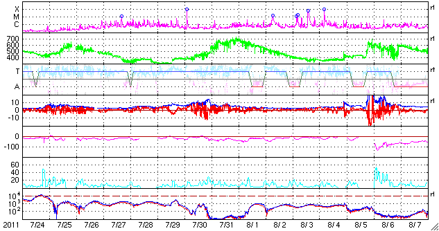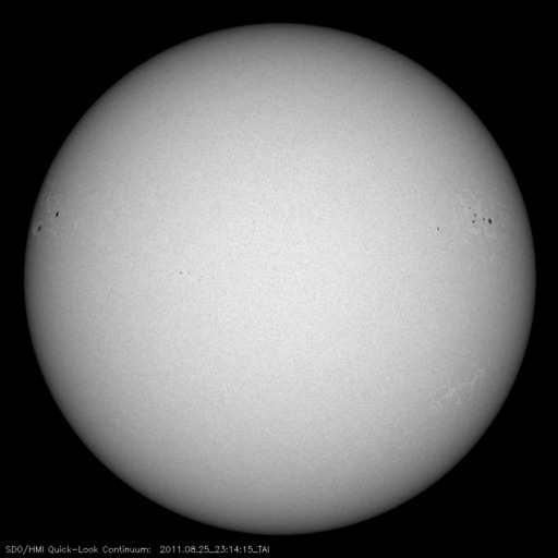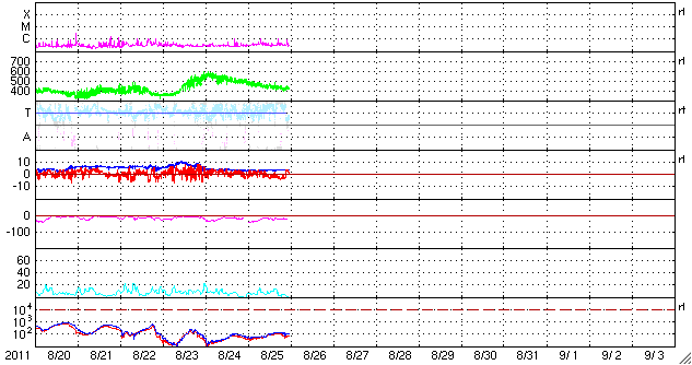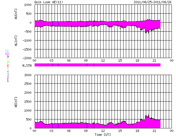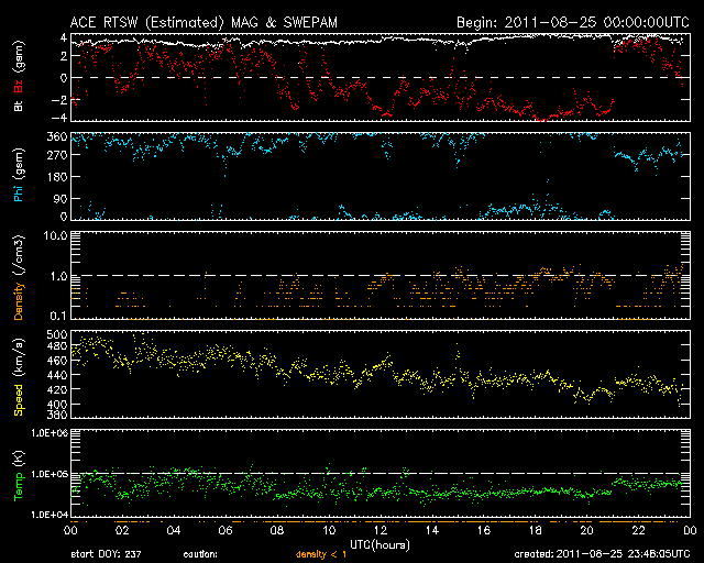 2011/ 8/26 08:48 更新 太陽風は平均的な速度に戻っています。明日以降、高速風になりそうです。 担当 篠原 太陽風の速度はゆっくりと下がり続け、 420km/秒と平均的な速度に戻っています。 磁場強度も3〜4nTと弱めの状態です。 その中で、磁場の南北成分が半日ほど連続して-2〜-4nTの弱い南向きになっていました。 この影響で、AE指数の変化も少し高まっていた様です。 太陽風は、今日はこのまま穏やかに推移し、 明日くらいから、コロナホールの影響による高速の太陽風がやって来そうです。 SDO衛星AIA193の太陽コロナ写真を見ると、 北半球に暗く見えているコロナホールは、 西半球側(右側)に次第に進んでいます(太陽の自転によるものです)。 このコロナホールの先頭が、太陽の西側の半分ほどまで進んだ頃、 地球に高速太陽風がやって来ると見積もります。 太陽では、東の端から新しい黒点が2つ上がってきました。 右側が1277黒点群、左側が1279黒点群です。 それぞれB9.5、B9.6とほぼCクラスに達する規模のフレアを起こしています。 黒点としてはそれほど大きくありませんが、 どの様な活動を起こすのか、しばらく注目してください。 元気いっぱいの小中学生たちに負けそうになりながら、講習会1日目を終えました。 今日はその続きと、自分たちで作った水ロケットの打ち上げを行います。 その時刻まで現在の良い天気が続くといいのですが。 SDO衛星のAIA193カメラによる太陽コロナの様子 (c) SDO (NASA) ![]() SDO衛星による太陽の可視光写真。マウスの矢印を写真に重ねると、黒点番号付きの写真に切り替わります。 (c) SDO (NASA) ![]() ACEが観測した太陽風の磁場(1番上の枠、白線は全体の強度、赤線は南北成分) および、太陽風の密度(3番目の橙線)、速度(4番目の黄線) (c) NOAA/SWPC ![]() リアルタイムAE指数 下段のAEグラフの値が高くなると、オーロラ活動が活発化しています。 (c) 京都大学, NICT ![]() 27日の太陽周期に合わせたデータプロット 太陽が同じ面を地球に向けていた27日前の変化から、今後を予想することができます。 (c) 作図:宇宙天気ニュース