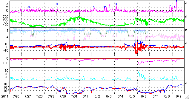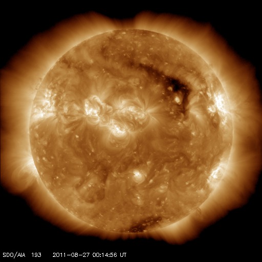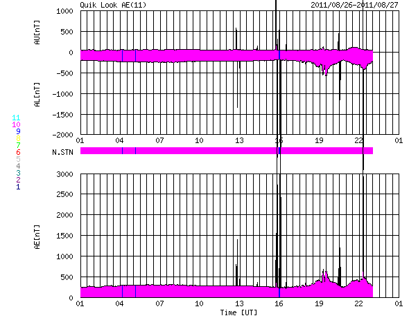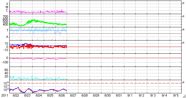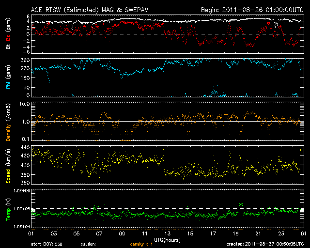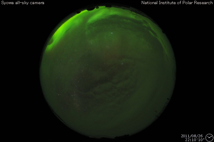 2011/ 8/27 09:50 更新 太陽風は400km/秒の速度で安定しています。これから高速風が始まりそうです。 担当 篠原 穏やかな太陽風が続いています。 現在の速度は400km/秒、磁場強度も4〜5nTと、 どちらも平均的な状態です。 ACEの図の後半から、磁場の南北成分が南向きに振れる様になり、 この影響で小規模のオーロラ活動が発生しています。 AE指数のグラフは、(恐らく)データの問題でずっと太くなっていますが、 後半で小さな変動が観測されています。 その頃の南極の昭和基地のオーロラの写真を掲載します。 オーロラの活動は弱く、光は高緯度側(南極寄り)の地平線付近に見えています。 一方、太陽風は高速風の到来が近付いています。 SDO衛星AIA193の太陽コロナ写真を見ると、 北半球のコロナホールはだいぶ西側(右側)に進み、 影響が地球に到達する目安の位置に達しています。 今日か明日くらいに太陽風の速度は上昇して、 2〜3日程度高速太陽風が続きそうです。 27日周期の図によると、 前周期もこの頃に700km/秒に達する高速風が来ています。 今回もここまで高速になるかどうかは分かりませんが、 今後のACEの変化に注目してください。 速度の上昇に先立って磁場強度が強まるので、 その変化にも注目してください。 太陽は、1271黒点群が西に没しつつありますが、 東側には新しい黒点も出現して、すこしにぎやかです。 フレア活動はC1.0、C2.3とCクラスの小規模フレアが2回発生していますが、 どちらも沈みかけた1271黒点群で起きています。 東側の黒点たちの活動はまだ小さいです。 南極の昭和基地で撮影されたオーロラの全天写真。 (c) 国立極地研究所 ![]() SDO衛星のAIA193カメラによる太陽コロナの様子 (c) SDO (NASA) ![]() SDO衛星による太陽の可視光写真。マウスの矢印を写真に重ねると、黒点番号付きの写真に切り替わります。 (c) SDO (NASA) ![]() ACEが観測した太陽風の磁場(1番上の枠、白線は全体の強度、赤線は南北成分) および、太陽風の密度(3番目の橙線)、速度(4番目の黄線) (c) NOAA/SWPC ![]() リアルタイムAE指数 下段のAEグラフの値が高くなると、オーロラ活動が活発化しています。 (c) 京都大学, NICT ![]() 27日の太陽周期に合わせたデータプロット 太陽が同じ面を地球に向けていた27日前の変化から、今後を予想することができます。 (c) 作図:宇宙天気ニュース