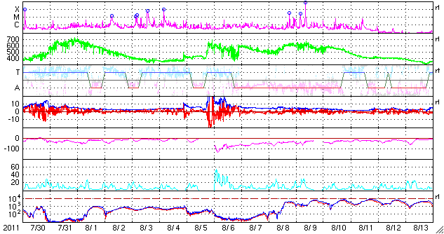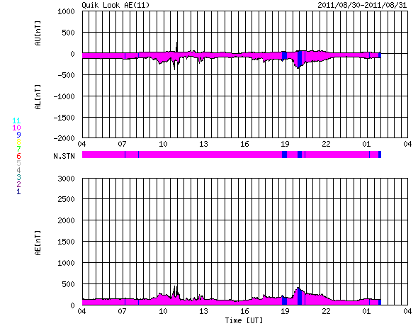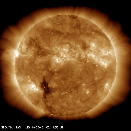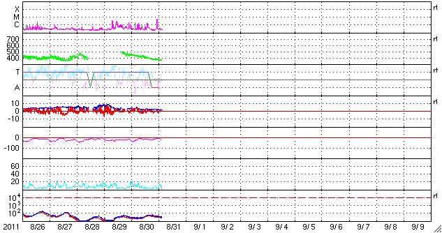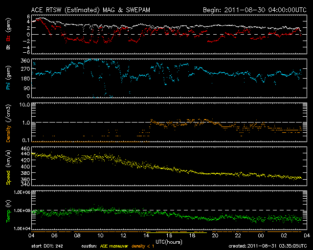 2011/ 8/31 12:32 更新 アクセス累計が500万件に達しました。太陽風は低速風になっています。 担当 篠原 1週間前の8月24日に、宇宙天気ニュースのアクセス累計が500万件に達しました。 ご愛読頂きありがとうとございます。 経過報告の記事を書きましたので、どうぞご覧ください。 4月に400万件に到達した後、たった4カ月での100万件達成でした。 昨日、440km/秒に下がっていた太陽風の速度は更に低下して、 現在は360km/秒と低速風に変わっています。 磁場強度も2nTに弱まっています。 太陽風が穏やかなので、磁気圏のオーロラ活動は基本的に静穏ですが、 弱いながらも磁場が-2nT程度の南向きになっている時間帯に、 AE指数で200〜300nTほどの小さな変化は発生しています。 この後は、5日程度穏やかな太陽風が続きそうです。 SDO衛星AIA193を見ると、南半球側に縦に細長いコロナホールが見えています。 5日後くらいに影響がやって来そうです。 27日周期の図では、前周期の8月8日からこれに相当する高速風が始まっています。 (8月5〜7日の高速風はフレアによるもので、周期性はありません) 今回は、コロナホールの位置が少し東にずれているので、 高速風の到来も1日程度遅れるのではないでしょうか。 太陽では、今朝、31日7時(世界時30日22時)にC5.5の小規模フレアが、 太陽の南東(左下)の1281黒点群で発生しました。 この前にも、あちこちの活動領域でC1程度の小さなフレアが何度も発生しています。 しかし、今のところこれ以上規模が拡大する様子はありません。 SDO衛星のAIA193カメラによる太陽コロナの様子 (c) SDO (NASA) ![]() SDO衛星による太陽の可視光写真。マウスの矢印を写真に重ねると、黒点番号付きの写真に切り替わります。 (c) SDO (NASA) ![]() ACEが観測した太陽風の磁場(1番上の枠、白線は全体の強度、赤線は南北成分) および、太陽風の密度(3番目の橙線)、速度(4番目の黄線) (c) NOAA/SWPC ![]() リアルタイムAE指数 下段のAEグラフの値が高くなると、オーロラ活動が活発化しています。 (c) 京都大学, NICT ![]() 27日の太陽周期に合わせたデータプロット 太陽が同じ面を地球に向けていた27日前の変化から、今後を予想することができます。 (c) 作図:宇宙天気ニュース