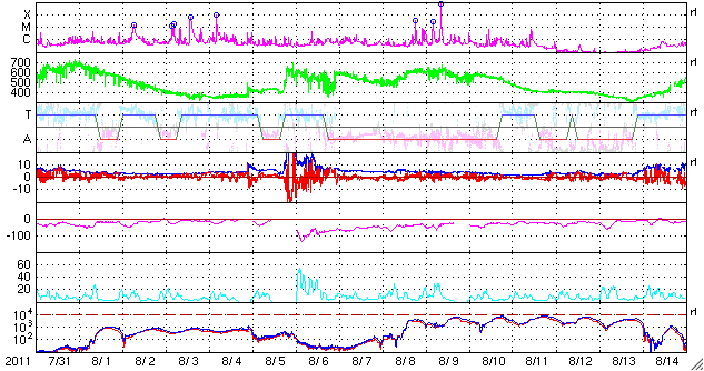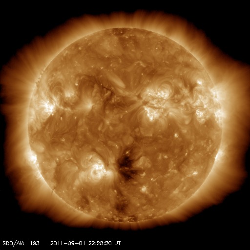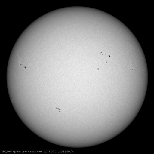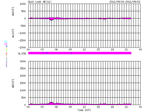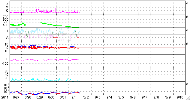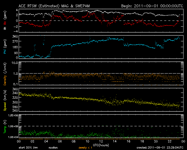 2011/ 9/ 2 08:29 更新 太陽風はかなり低速です。小規模フレアが発生しています。 担当 篠原 太陽風の速度は更に下がり、 280km/秒とかなり遅くなっています。 300km/秒を割ってここまで下がったのは、 久しぶりです。 磁場強度も2nTと弱く、 太陽風はとても穏やかです。 このため、磁気圏のオーロラ活動はとても静かで、 AE指数は全く変化していません。 SDO衛星AIA193では、 南半球のコロナホールは、 ちょうど太陽の中央に来ています。 これから3日後の9月5日頃から、 太陽風に影響が見られそうです。 前周期は、600km/秒まで速度が上がりました。 今回も同じ程度に上がるかもしれません。 太陽では、東側の1283黒点群で、 1日21時半(世界時1日12時半)と、 2日3時(世界時1日18時)に、 C2.0の小規模フレアが2回発生しています。 1283黒点群は、一昨日に続いての発生で、 小さいですが、活動が続いています。 SDO衛星のAIA193カメラによる太陽コロナの様子 (c) SDO (NASA) ![]() SDO衛星による太陽の可視光写真。マウスの矢印を写真に重ねると、黒点番号付きの写真に切り替わります。 (c) SDO (NASA) ![]() ACEが観測した太陽風の磁場(1番上の枠、白線は全体の強度、赤線は南北成分) および、太陽風の密度(3番目の橙線)、速度(4番目の黄線) (c) NOAA/SWPC ![]() リアルタイムAE指数 下段のAEグラフの値が高くなると、オーロラ活動が活発化しています。 (c) 京都大学, NICT ![]() 27日の太陽周期に合わせたデータプロット 太陽が同じ面を地球に向けていた27日前の変化から、今後を予想することができます。 (c) 作図:宇宙天気ニュース