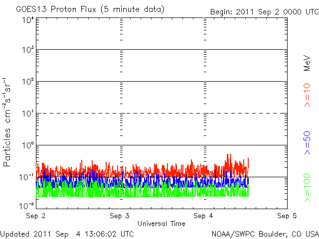 - 2011/ 9/ 3 12:39 太陽風の速度が380km/秒に上がっています。太陽のフレア活動は静かです。