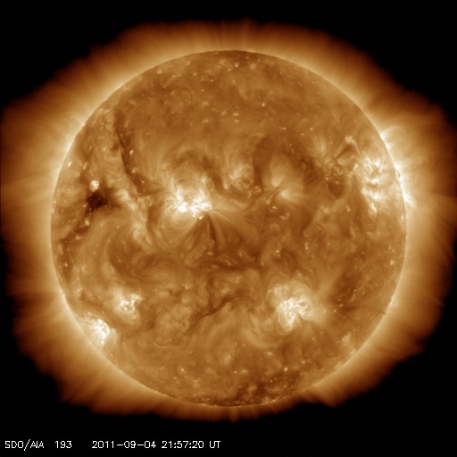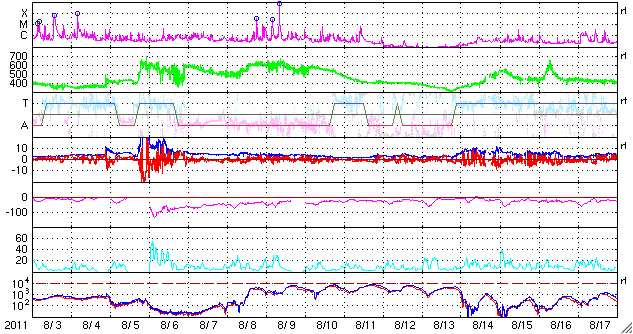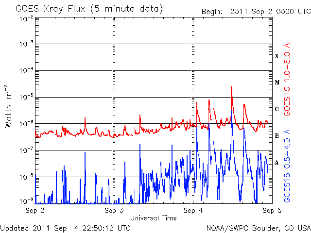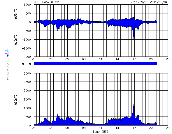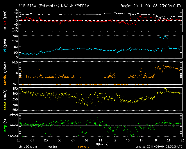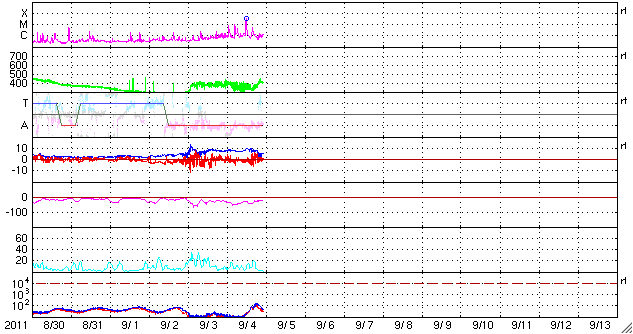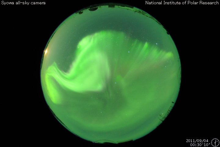 2011/ 9/ 5 07:52 更新 昨夜M3.2の中規模フレアが発生しました。磁気圏でオーロラがやや活発でした。 担当 篠原 昨夜、4日20時半(世界時4日11時半)に、 太陽の西の端ぎりぎりにあった1286黒点群で、 M3.2の中規模フレアが発生しました。 昨夜、速報としてGOES衛星のX線写真の動画を掲載しました。 どうぞ昨夜の記事もご覧ください。 1286黒点群は、その前に、C8.3、C9.0など大きめのCクラスフレアを起こしていました。 活動度が急に上がった様です。 そして、深夜5日0時(世界時4日15時)にもC5.8の小規模フレアを起こしています。 この後は、西の端に沈んでしまって、地球からは見えなくなっています。 現在の太陽面にも、1281、1283、1287黒点群などが見えていますが、 目立ったフレアは起こしておらず、太陽の活動は一旦落ち着きそうです。 太陽風は、昨夕から速度が350km/秒ほどに下がったものの、 今朝から再び400km/秒に上がっています。 太陽風の速さとしては、平均的な数値です。 磁場強度も5nTに下がり、落ち着いています。 一方、磁気圏では、500nT前後のオーロラ活動が活発に見られています。 最大の変化は1000nTを超える激しいものになっています。 ACEの図では、磁場の縦軸が大きくなってしまって細かい変化が見にくいのですが、 比較的南向きになっていたのかもしれません。 昭和基地のオーロラの様子を一枚掲載します。 今日くらいから、太陽の南半球に見えていたコロナホールの影響が 地球にやって来る可能性があります。 速度が一段上昇して、500km/秒台になるかもしれません。 27日周期の図で、8月8〜10日の高速風の回帰です。 これからウラジオストックに飛びます。 明日はカムチャッカへ移動になり、更新はできないだろうと思います (ネットにアクセスできれば行います)。 南極の昭和基地で、全天カメラにより撮影されたオーロラ。 (c) 国立極地研究所 ![]() SDO衛星のAIA193カメラによる太陽コロナの様子 (c) SDO (NASA) ![]() SDO衛星による太陽の可視光写真。マウスの矢印を写真に重ねると、黒点番号付きの写真に切り替わります。 (c) SDO (NASA) ![]() GOES衛星の太陽X線データ (c) NOAA/SWPC ![]() ACEが観測した太陽風の磁場(1番上の枠、白線は全体の強度、赤線は南北成分) および、太陽風の密度(3番目の橙線)、速度(4番目の黄線) (c) NOAA/SWPC ![]() リアルタイムAE指数 下段のAEグラフの値が高くなると、オーロラ活動が活発化しています。 (c) 京都大学, NICT ![]() 27日の太陽周期に合わせたデータプロット 太陽が同じ面を地球に向けていた27日前の変化から、今後を予想することができます。 (c) 作図:宇宙天気ニュース