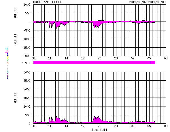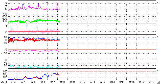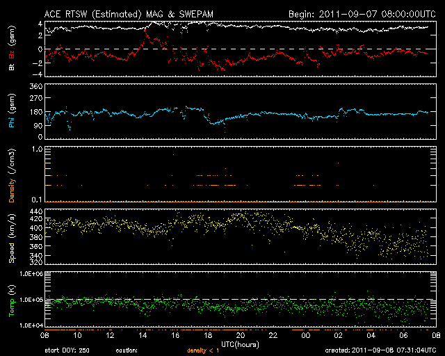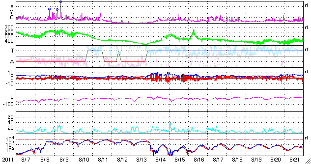 SDO衛星のAIA193カメラによる太陽コロナの様子 (c) SDO (NASA) ![]() SDO衛星による太陽の可視光写真。マウスの矢印を写真に重ねると、黒点番号付きの写真に切り替わります。 (c) SDO (NASA) ![]() GOES衛星の太陽X線データ (c) NOAA/SWPC ![]() GOES衛星の太陽放射線データ (c) NOAA/SWPC ![]() ACEが観測した太陽風の磁場(1番上の枠、白線は全体の強度、赤線は南北成分) および、太陽風の密度(3番目の橙線)、速度(4番目の黄線) (c) NOAA/SWPC ![]() リアルタイムAE指数 下段のAEグラフの値が高くなると、オーロラ活動が活発化しています。 (c) 京都大学, NICT ![]() 27日の太陽周期に合わせたデータプロット 太陽が同じ面を地球に向けていた27日前の変化から、今後を予想することができます。 (c) 作図:宇宙天気ニュース