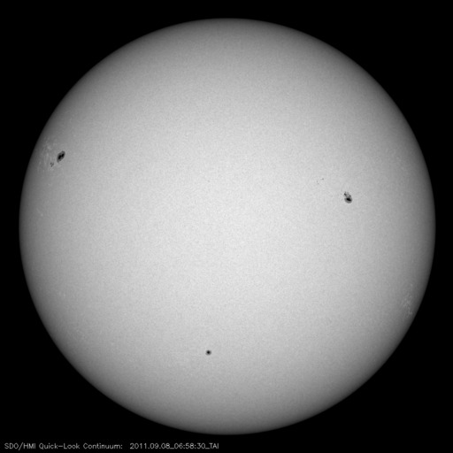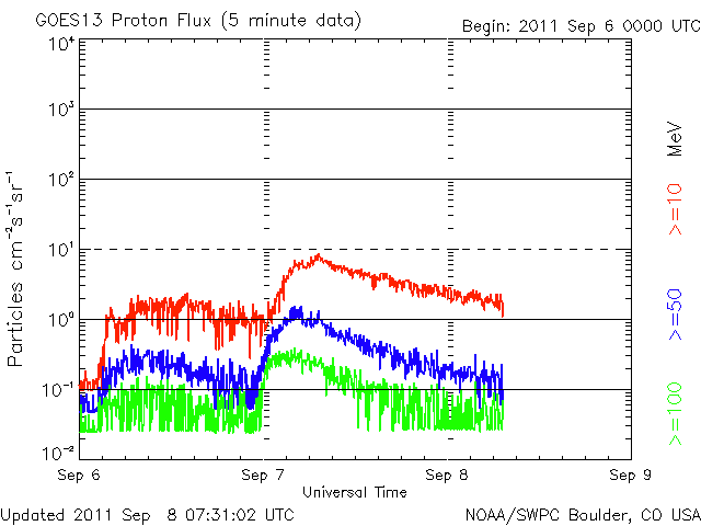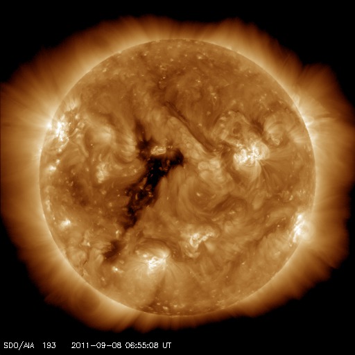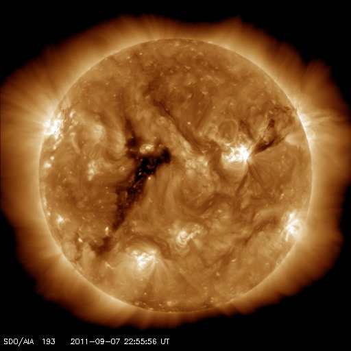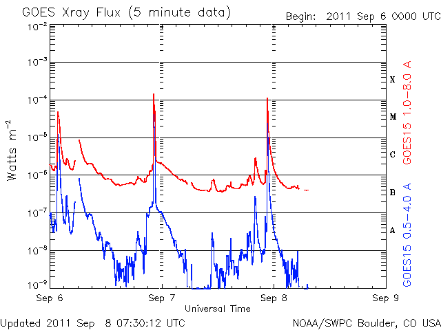 2011/ 9/ 8 16:31 更新 昨日に続いてXクラスのフレア(X1.8)が発生しました。明日には太陽風の擾乱が到来しそうです。 2011/ 9/ 8 16:37 追加 X1.8フレアによるCMEのSOHO LASCO C3画像。 担当 篠原 今朝、1283黒点群で昨日に続いてXクラスの大規模フレアが発生しました。 8日7時半(世界時7日22時半)に、X1.8です。 昨日とほとんど同じ時刻に、同じくらいの規模のフレアが発生したので、 GOES衛星のX線グラフを見ると、 昨日と今日にほとんど同じ高さの細い山が記録されています。 フレア発生時に撮影された、SDO衛星AIA193の太陽コロナ写真を掲載します。 フレアによって噴出するコロナのガスが、黒く写っています。 この後、CMEとなって噴き出していくのです。 太陽放射線は、今日のフレアでは変化していません。 もう少し遅れてやって来るかもしれません。 今後についてですが、昨日発生したX2.1のフレアによってCMEが発生しています。 SOHO LASCO C3カメラによる噴出の様子を掲載します(動画でないのが残念ですが)。 NOAA/SWPCの報告によると、800km/秒くらいの速度で飛び出しているそうです。 すると、地球へは2日過ぎくらいで到達する可能性があります。 明日の朝から夜にかけて、太陽風の大きな乱れがやって来そうです。 ただし、800km/秒という太陽風の速度は、 高い値ですが、特別激しいという規模ではありません。 擾乱の始まりでは強い磁場が運ばれてきて、 大きく南を向いた場合は激しいオーロラの活動や磁気嵐を起こすことがあります。 ライブカメラなど注目してください。 現在の太陽風は、速度400km/秒前後と平均的な状態です。 小規模のオーロラ活動も発生しているようです。 明日から3日間程度は注目の期間になりそうです。 ACE衛星、ライブカメラと様々なデータに注目してください 明日もまた、夕方に更新するのがやっとだと思います。 その頃には擾乱は始まっているかもしれません。 また、今日のX1.8フレアによるCMEを追加記事の形で掲載します。 ネットワークの事情から、動画を掲載できないのがとても残念です。 宇宙天気情報BOXのリンクから、 それぞれのデータ元へ行くと様々な動画が見られます。 ぜひ、この活発な宇宙天気現象を見届けて下さい。 2011/ 9/ 8 16:37 追加 (篠原) 関連の図はページの最後にあります 記事更新システムの都合により、追加記事の形で掲載します。 昨日のCMEよりはガスの噴き出しが弱い様に見えます。 SDO AIA193による、X1.8フレアとコロナの噴出の様子。 (c) SDO (NASA) ![]() SOHO衛星 LASCO C3カメラの映像 (c) SOHO (ESA & NASA)