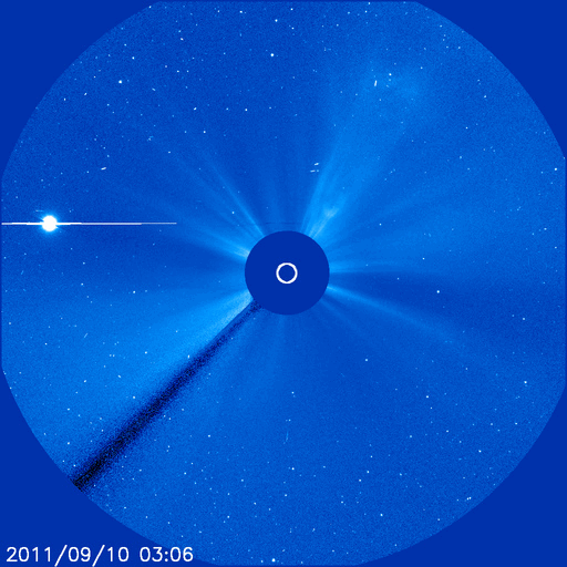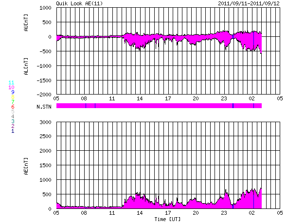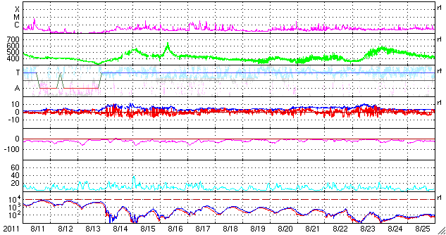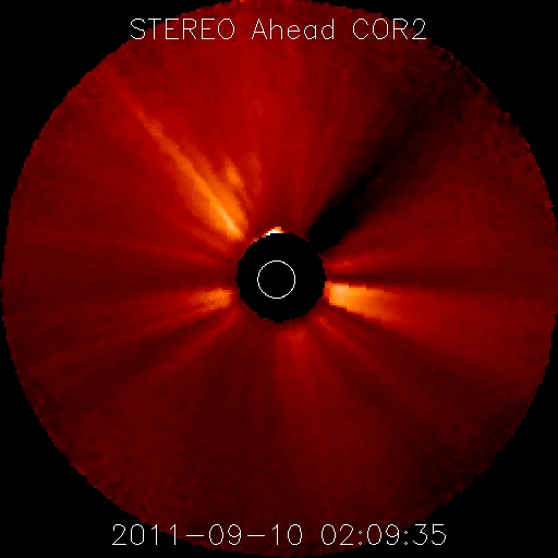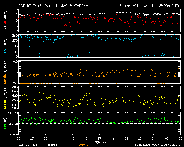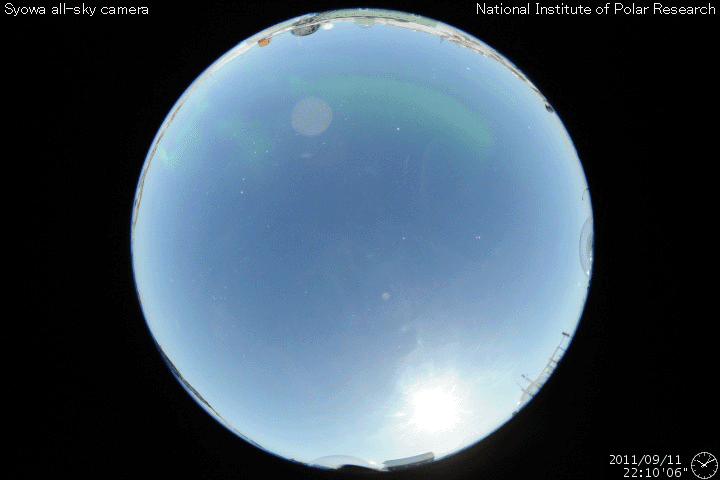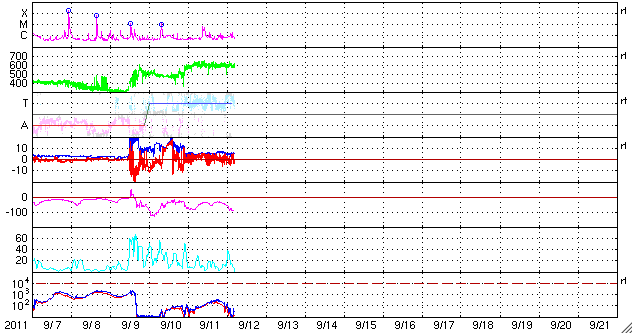 2011/ 9/12 13:48 更新 太陽風は600km/秒付近の高速状態です。コロナホールにより、このまま高速風が続きそうです。 担当 篠原 昨日の情報ですが、フィラメント噴出の様子を、 SDO衛星AIA304の動画で紹介します。 太陽の中央から少し北西(右上)側に寄った領域から、 黒く写っているプラズマのガスが勢い良く噴き上がっています。 こうして発生したCMEを捉えたのが、SOHO衛星LASCO C3カメラです。 この写真でも北西側により濃くガスが噴き上がっているのが分かります。 また、このCMEに続いて、もう一つ別のCMEが西(右)に向かって飛び出しています。 地球に向かっている様子は、STEREO Ahead衛星を使って見ることができます。 この衛星は、地球から見ると、太陽を右横から観測しています。 今回のCMEは、地球のある左方向に噴き出していますが、 最も濃い方向はだいぶ北寄り(上方向)に偏っています。 従って、地球への影響はあまり強くなさそうです。 現在の太陽風は、CMEの到来による高速状態が継続しています。 昨日より、600km/秒付近でほぼ安定しています。 磁場強度も5nTと平均的な強さです。 この状況により、オーロラの活動も活発に発生していて、 AE指数を見ると、300〜500nTの小中規模の変動が続いています。 その中で、AE指数が500nTほどに変化した頃(世界時11日22〜23時)に、 南極の昭和基地で撮影されたオーロラの動画を紹介します。 地球には、コロナホールによる高速風がやって来て、 高速状態はこのまま続きそうです。 そして、14日頃には、 動画で紹介しているCMEの乱れがやって来るのではないでしょうか。 いろいろな擾乱が重なってたいへんですが、 もうしばらくにぎやかな状態が続きそうです。 放射線帯の高エネルギー電子は、ほとんど増加していません。 太陽風の乱れは続いているので、引き続き変化に注意してください。 太陽では、昨日、11日18時(世界時11日9時)に、 1283黒点群でC6.6の大きめの小規模フレアが発生しました。 しかし、可視光写真を見ると、 今回大活躍だった1283黒点群は、西の端に没しています。 後に残った黒点群は、数は多いのですが、 フレア活動は目立ったものはありません。 むしろ、これから東の端に上がってくる 新しい活動領域に注目してください。 今日は久しぶりに鹿児島からの更新です。 日本はまだまだ暑いですね。熱帯へ旅行に来た様な気分です。 そして、また明日から10日間カナダへ行きます。 明日、明後日は移動日なので、更新は状況次第です。 現地に入れば、今回はホテルから更新できると思います。 SDO AIA304による、フィラメントの噴出。 (c) SDO (NASA) ![]() SOHO LASCO C3カメラによる、CMEの様子。 (c) SOHO (ESA & NASA) ![]() STEREO aheadによる地球方向に噴き出すCMEの様子。 (c) STEREO (NASA) ![]() 南極昭和基地の全天カメラで撮影されたオーロラの活動。 (c) 国立極地研究所 ![]() SDO衛星のAIA193カメラによる太陽コロナの様子 (c) SDO (NASA) ![]() SDO衛星による太陽の可視光写真。マウスの矢印を写真に重ねると、黒点番号付きの写真に切り替わります。 (c) SDO (NASA) ![]() ACEが観測した太陽風の磁場(1番上の枠、白線は全体の強度、赤線は南北成分) および、太陽風の密度(3番目の橙線)、速度(4番目の黄線) (c) NOAA/SWPC ![]() リアルタイムAE指数 下段のAEグラフの値が高くなると、オーロラ活動が活発化しています。 (c) 京都大学, NICT ![]() 27日の太陽周期に合わせたデータプロット 太陽が同じ面を地球に向けていた27日前の変化から、今後を予想することができます。 (c) 作図:宇宙天気ニュース