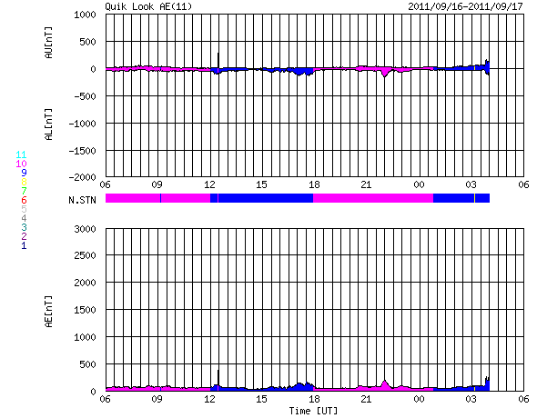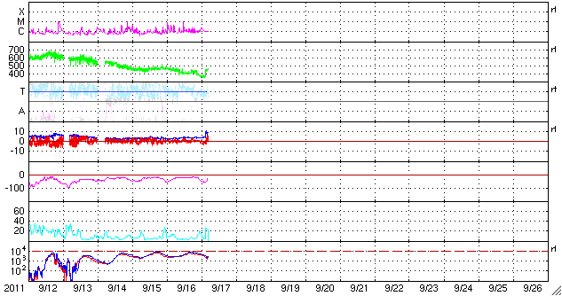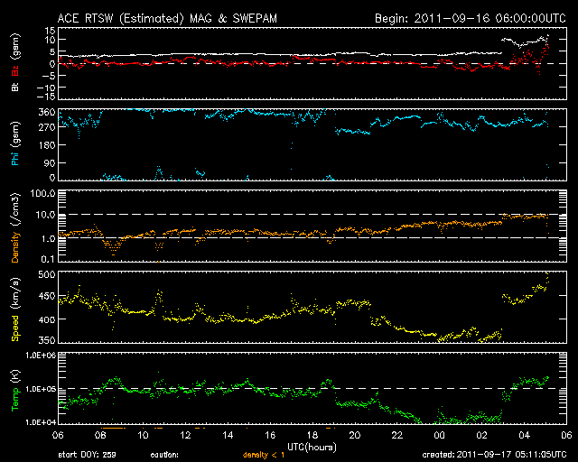 2011/ 9/17 14:11 更新 14日のCMEによる太陽風の乱れが始まりました。太陽風の磁場は北寄りに推移しています。 担当 篠原 カナダ・イエローナイフの大塚氏より、 世界時13日7時頃のオーロラの写真をいただきました。 出張のため、掲載が遅くなりました。 昨日紹介した2枚目のオーロラの翌日の写真です。 AE指数は800nT程の変化になっています。 オーロラ爆発が発生して、 頭の上から降り注ぐようなオーロラの姿が撮影されています。 今回も素晴らしい写真をありがとうございます。 太陽風は、いよいよCMEによる擾乱がやって来ました。 ACE衛星の観測でつい先ほど、17日12時(世界時17日3時)より、 太陽風データの速度、磁場強度に変化が発生しています。 磁場強度は変化が最も目立ち、4nTから10nTに強まっています。 速度の変化は小幅で、370km/秒から、 440〜460km/秒とやや高速に高まった程度です。 CMEの噴出が14日の朝でしたから、 およそ3日で擾乱は地球へ到達したことになります。 経過時間から考えると、速度はもう少し上がるかもしれません。 (と書いているうちに、最新の速度は500km/秒近くに上がりそうです) 磁場の南北成分は、初めは弱い北向きになっています。 磁場の向きは、ここまでは東西方向に大きく振れている様です。 磁場が北寄りのため、オーロラ活動など磁気圏の乱れは、 現時点ではあまり強まりそうにありません。 今後、南側に反転すると、オーロラの発生状況も大きく変わってきます。 太陽風の乱れは、半日から1日程度続くでしょう。 今後の変化に注目して下さい。 放射線帯の高エネルギー電子は、やや高い状態が続いています。 こちらは、今回の太陽風の乱れによって、大きく減少すると思われます。 太陽は、昨日のニュースで紹介した大きめのCクラスフレアが3回発生した後は、 16日20時半(世界時16日11時半)のC9.3、1290黒点群(南西の端)、 17日8時(世界時16日23時)のC2.6、1289黒点群(北西の端近く) あたりが目立ったフレアです。 小さなCクラスのフレアは頻発していて、活動度は高まっていますが、 大きな変動には発達していません。 太陽の西側に見えていた黒点群のグループは、 次第に太陽の向こう側に隠れます。 1295、1296黒点群などが残りますが、太陽面は少し寂しくなります。 YOSHI OTSUKA氏により、カナダ・イエローナイフで撮影されたオーロラ。 (c) YOSHI OTSUKA ![]() YOSHI OTSUKA氏により、カナダ・イエローナイフで撮影されたオーロラ。 (c) YOSHI OTSUKA ![]() SDO衛星のAIA193カメラによる太陽コロナの様子 (c) SDO (NASA) ![]() SDO衛星による太陽の可視光写真。マウスの矢印を写真に重ねると、黒点番号付きの写真に切り替わります。 (c) SDO (NASA) ![]() ACEが観測した太陽風の磁場(1番上の枠、白線は全体の強度、赤線は南北成分) および、太陽風の密度(3番目の橙線)、速度(4番目の黄線) (c) NOAA/SWPC ![]() リアルタイムAE指数 下段のAEグラフの値が高くなると、オーロラ活動が活発化しています。 (c) 京都大学, NICT ![]() 27日の太陽周期に合わせたデータプロット 太陽が同じ面を地球に向けていた27日前の変化から、今後を予想することができます。 (c) 作図:宇宙天気ニュース