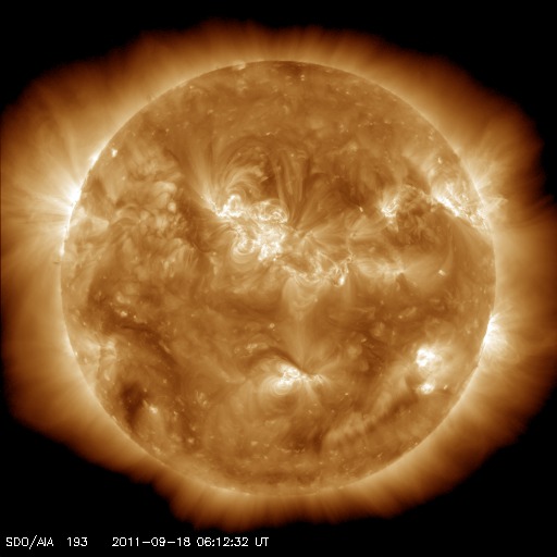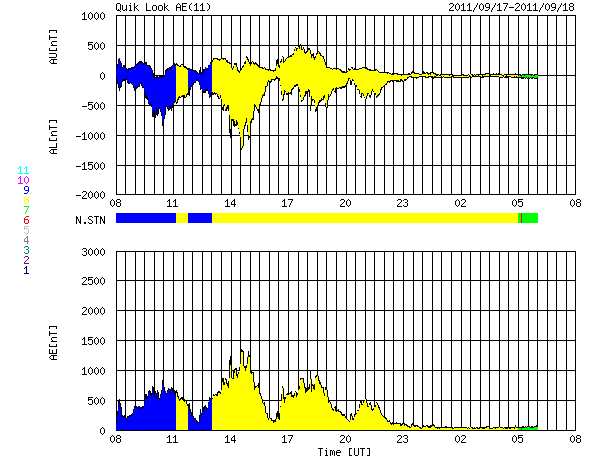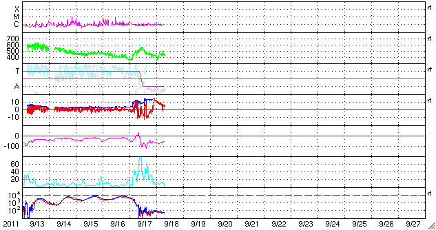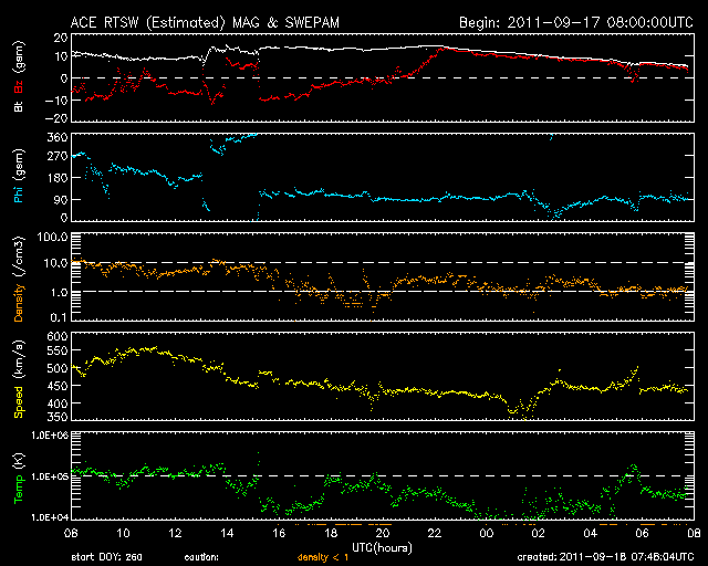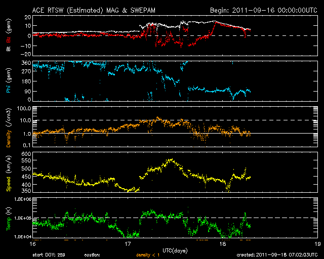 2011/ 9/18 16:48 更新 太陽風磁場が大きく南を向き、オーロラが活発化しました。現在は静かになっています。 担当 篠原 ACE衛星の観測によると、昨日のニュースの直後、 17日16時(世界時17日7時)から、 強まっていた太陽風磁場が大きく南を向くようになりました。 太陽風の擾乱の全体を紹介するため、下に3日幅のACEのグラフを掲載します。 南向きの磁場は、最大-10nTまで振れています。 強い南向きは、途中、短時間の北への振れもありましたが、 18日2時(世界時17日17時)まで続きました。 この間、太陽風の速度は500km/秒前後に高まっていて、 AE指数で500〜1000nT(瞬間的な最大値は1300nT)の大規模な変動が 半日にわたって続きました。 この立ち上がりの頃のオーロラの写真が、 カナダ・イエローナイフの大塚氏より届きました。 1枚目に掲載しています。 世界時17日9時頃の写真で、この時間から急にオーロラが強まったそうです。 激しさはなかったものの、長い時間オーロラが続いたそうで、 その見え方は、現地が朝の3時頃だったということも関係しているのでしょう。 太陽風磁場の南北成分は、この後しばらく0nT付近に留まり、 18日6時(世界時17日21時)からは強い北向きに切り替わっています。 この影響もまたはっきりしていて、AE指数はこれ以降全く変動していません。 現在の太陽風の速度は450km/秒、磁場強度は5nTと、 太陽風の乱れは終わりに近付いています。 明日には通常の状態に戻っているでしょう。 今回の擾乱では、Dst指数(京都大学WDC)も大きく変化していて、磁気嵐が発生しています。 最初の磁気圏圧縮による増加を考慮した変化の幅としては、 100nTの下がり幅になっています。 (グラフとしては、-75nTまで下がっています) 放射線帯の高エネルギー電子は、今回の乱れの影響で、 大きく下がっています。 この後、再度増加するかどうか、明日の変化に注目してください。 太陽は、急に静かになり、昨日のニュース以降は、 C1の小さな小規模フレアが4回ほど記録されている程度です。 大きな黒点群は残っているので、今後も活動の高まりには注意が必要です。 YOSHI OTSUKA氏により、カナダ・イエローナイフで撮影されたオーロラ。 (c) YOSHI OTSUKA ![]() ACE衛星による3日幅の太陽風の変化。各グラフは下の1日幅の図と同じです。 (c) NOAA/SWPC ![]() SDO衛星のAIA193カメラによる太陽コロナの様子 (c) SDO (NASA) ![]() SDO衛星による太陽の可視光写真。マウスの矢印を写真に重ねると、黒点番号付きの写真に切り替わります。 (c) SDO (NASA) ![]() ACEが観測した太陽風の磁場(1番上の枠、白線は全体の強度、赤線は南北成分) および、太陽風の密度(3番目の橙線)、速度(4番目の黄線) (c) NOAA/SWPC ![]() リアルタイムAE指数 下段のAEグラフの値が高くなると、オーロラ活動が活発化しています。 (c) 京都大学, NICT ![]() 27日の太陽周期に合わせたデータプロット 太陽が同じ面を地球に向けていた27日前の変化から、今後を予想することができます。 (c) 作図:宇宙天気ニュース