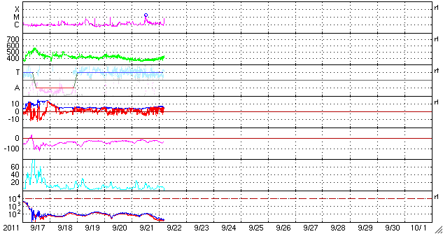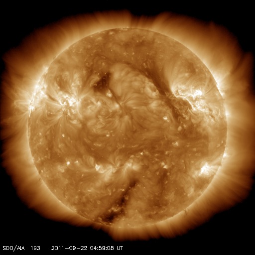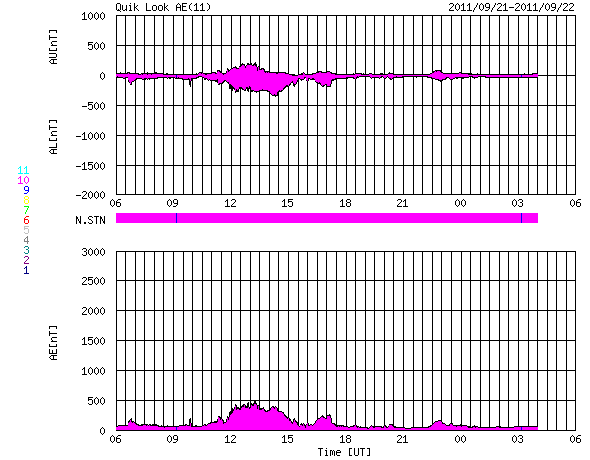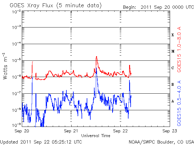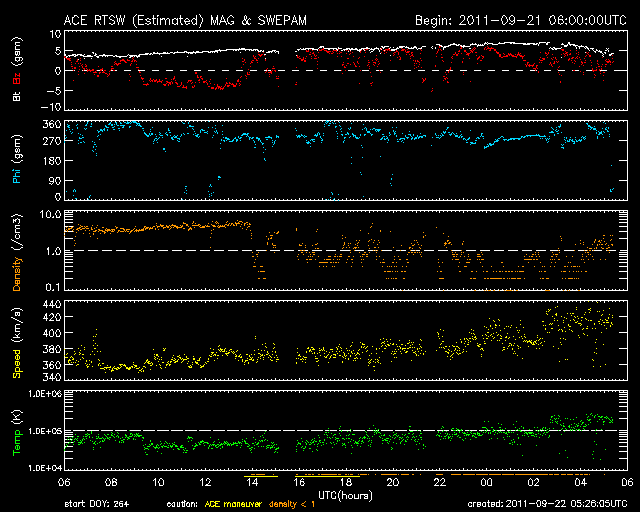 2011/ 9/22 14:26 更新 Mクラスのフレアが発生しました。太陽風は穏やかです。 担当 篠原 昨夜、21日21時(世界時21日13時)に、 太陽の東(左)寄りに見える1301黒点群でM1.9の中規模フレアが発生しました。 また、つい先ほど、22日13時(世界時22日4時)には、 C6.7の大きめの小規模フレアが発生しています(発生場所は不明)。 太陽では、この他にもCクラスの小規模の変動が連続的に発生しています。 今後もフレア活動の動向に注目してください。 太陽風は、速度が410km/秒へ徐々に高まり、 磁場強度も5〜6nTに少し上がっています。 多少変化はしていますが、基本的には穏やかな太陽風が続いています。 磁気圏活動は、太陽風磁場の南北成分の変化に合わせて、 AE指数の図の中ほどに400nTほどの小さな変化が発生しています。 今日のSDO衛星AIA193の太陽コロナ写真を見ると、 北半球のコロナホールの濃さが少し増し、 南極のコロナホールも緯度の低い所まで伸びているように見えます。 この様子では、これから数日間、太陽風に小規模の影響が現われるかもしれません。 どうなるか興味が持たれます。 台風の影響で飛行機が成田から出発できなかったため、 帰国便がキャンセルになり、今日もバンクーバーに残っています。 こちらにいてはさっぱり分かりませんでしたが、 台風15号の影響はかなり大きかったのですね。 こちらの明日の朝に改めて出発して、金曜日の夕方に鹿児島へ帰ります。 月曜から授業が始まるので、この1日の遅れは辛いです。 今夜のホテルのネットワークは、遅くて、不安定で、 データの分析がとても行いにくいです。 こういう状況では、特に太陽のデータをまともに調べることができず、残念です。 SDO衛星のAIA193カメラによる太陽コロナの様子 (c) SDO (NASA) ![]() SDO衛星による太陽の可視光写真。マウスの矢印を写真に重ねると、黒点番号付きの写真に切り替わります。 (c) SDO (NASA) ![]() GOES衛星の太陽X線データ (c) NOAA/SWPC ![]() ACEが観測した太陽風の磁場(1番上の枠、白線は全体の強度、赤線は南北成分) および、太陽風の密度(3番目の橙線)、速度(4番目の黄線) (c) NOAA/SWPC ![]() リアルタイムAE指数 下段のAEグラフの値が高くなると、オーロラ活動が活発化しています。 (c) 京都大学, NICT ![]() 27日の太陽周期に合わせたデータプロット 太陽が同じ面を地球に向けていた27日前の変化から、今後を予想することができます。 (c) 作図:宇宙天気ニュース