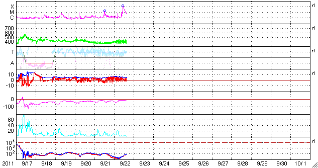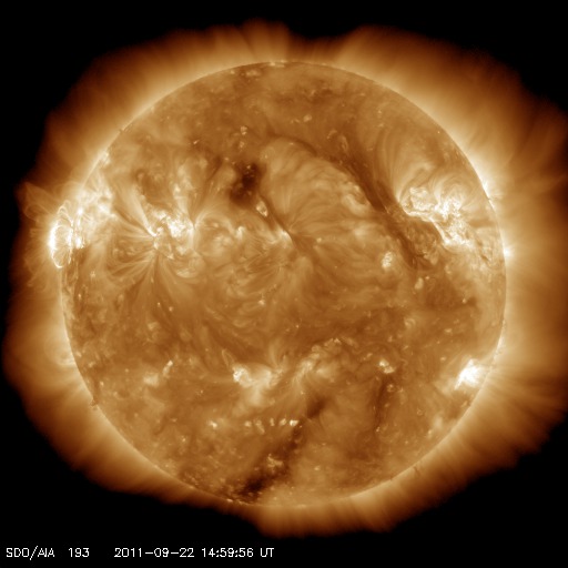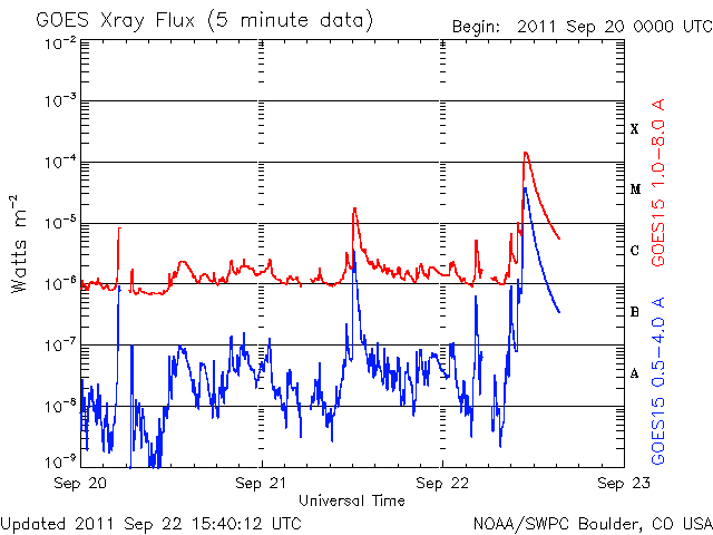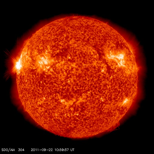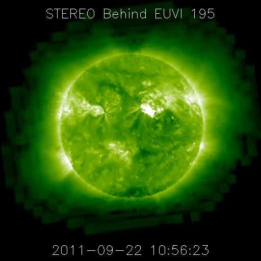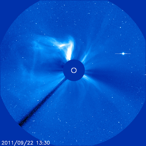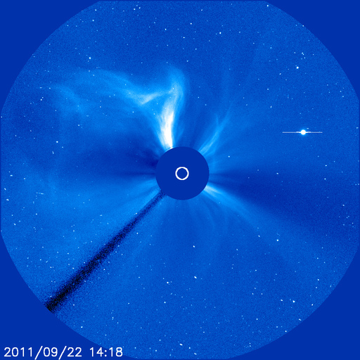 2011/ 9/23 00:42 更新 X1.4の大規模フレアが発生しました。 担当 篠原 太陽で22日19時半(世界時10時半)に、X1.4の大規模フレアが発生しました。 発生した場所は、太陽の東端から新しく現われた1302黒点群です。 こちらに顔を出してすぐに、大きな活動を起こしました。 深夜に申し訳ありませんが、次の更新の予定が立たないので、 簡単に報告します。 フレアが発生した時の、SDO衛星AIA304の写真を掲載します。 左の端に明るく光っている領域が見られます。 可視光写真と比べると、そこに大きな黒点が見えています。 AIA193の写真では、フレアの後のループ状のプロミネンスが見えています。 どちらも動画で見ると素晴らしいので、左のリンクからどうぞご覧ください。 左端で発生しているので、STEREO Behindで見ると、 フレアは太陽のほぼ中心に見えます。 ここでは写真のみ掲載しますが、こちらの動画もご覧ください。 このフレアに伴って、CME(太陽ガスの放出現象)が発生しています。 SOHO衛星のLASCO C3によると、左上に向かって激しくガスが噴き出しています。 撮影が飛び飛びになっていたため、連続写真を見ることができないのが残念です。 地球からは横方向に向かっているので、今後の影響はありません。 また、現時点では、太陽放射線は変化していません。 こちらは、しばらく様子を見る必要があります。 太陽風の状況については、特に変化はありません。 前回のニュースをご覧ください。 出発直前のバンクーバー空港から更新しています。 こちらは朝です。 起きるとXクラスのフレアが発生していて驚きました。 AIA304による、X1.4フレア。東端に輝きが見えています。 (c) SDO (NASA) ![]() STEREO Behindによる、X1.4のフレア。太陽を横から見ているので、フレアは正面で発生している。 (c) STEREO (NASA) ![]() SOHO衛星 LASCO C3カメラの映像 (c) SOHO (ESA & NASA)