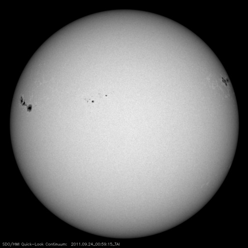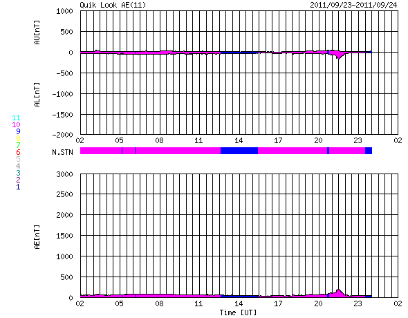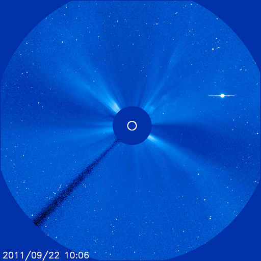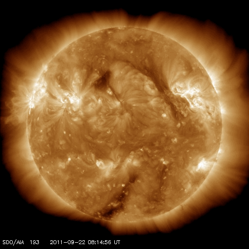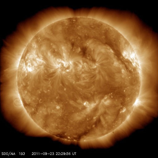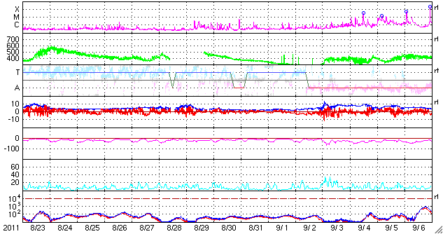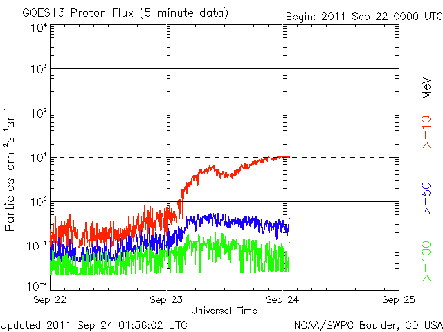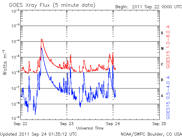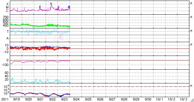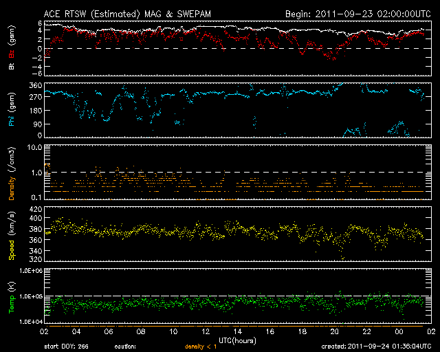 2011/ 9/24 10:32 更新 太陽でフレア活動が続いています。太陽風はやや低速で、オーロラは穏やかです。 担当 篠原 1日遅れになりましたが、無事に日本へ戻ってきました。 22日19時半(世界時10時半)に発生したX1.4の大規模フレアに関して、 SDO AIA193とSOHO LASCO C3の動画を掲載します。 太陽の東端で激しい爆発が起き、 その後、ポストフレアループの美しい輝きが続いています。 SOHO LASCO C3では、CMEの噴出直後の写真も公開されています。 これを見ると、CMEのガスは左側に最も濃く噴き出していますが、 太陽の右半分にも淡く広がる様子が見えます。 これは、SDO AIA193の動画にも見えていて、 この様子だと、地球へもある程度の太陽風の乱れがやって来るのかもしれません。 やって来るとすると、今日から明日にかけてでしょう。 今後のACEのデータに注目してください。 太陽のフレア活動は、その後も活発に続いています。 東端の1302黒点群と、西端の1295黒点群の双方で、 M1〜2クラスの中規模フレアを含むたくさんのフレアが発生しています。 1302黒点群は、黒点の広がりも大きく、次第に太陽の中心に近づくことから、 今後の活動に対して注意が必要でしょう。 また、X1.4のフレアによって、太陽放射線もゆっくりと増加しています。 ちょうど警戒レベルの10に達したところです。 太陽風は、380km/秒とやや低速の状態が続いています。 磁場強度も4nTとやや弱く、穏やかです。 弱いコロナホールの影響が見られるかもしれないと書きましたが、 今のところこれに関係する変化は見えていません。 オーロラの活動もたいへん静かで、AE指数は全く変化していません。 今後は、CMEによる乱れがやってくるかどうか、 また、淡いコロナホールの影響が見られるかどうかという点に注目してください。 SDO AIA193によるX1.4フレア発生の様子。 (c) SDO (NASA) ![]() SOHO LASCO C3カメラによる、CMEの様子。 (c) SOHO (ESA & NASA) ![]() SDO衛星のAIA193カメラによる太陽コロナの様子 (c) SDO (NASA) ![]() SDO衛星による太陽の可視光写真。マウスの矢印を写真に重ねると、黒点番号付きの写真に切り替わります。 (c) SDO (NASA) ![]() GOES衛星の太陽X線データ (c) NOAA/SWPC ![]() GOES衛星の太陽放射線データ (c) NOAA/SWPC ![]() ACEが観測した太陽風の磁場(1番上の枠、白線は全体の強度、赤線は南北成分) および、太陽風の密度(3番目の橙線)、速度(4番目の黄線) (c) NOAA/SWPC ![]() リアルタイムAE指数 下段のAEグラフの値が高くなると、オーロラ活動が活発化しています。 (c) 京都大学, NICT ![]() 27日の太陽周期に合わせたデータプロット 太陽が同じ面を地球に向けていた27日前の変化から、今後を予想することができます。 (c) 作図:宇宙天気ニュース