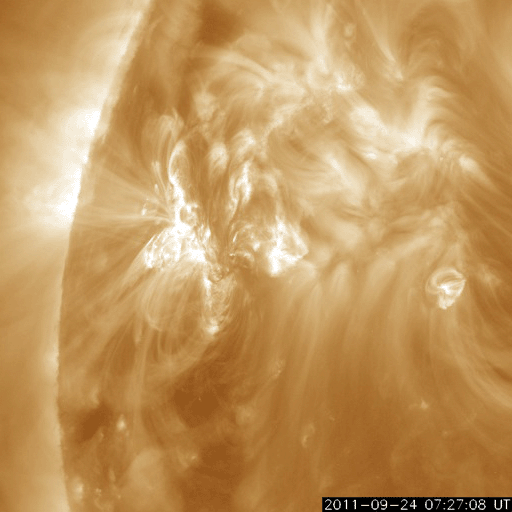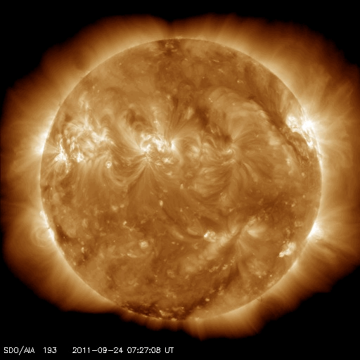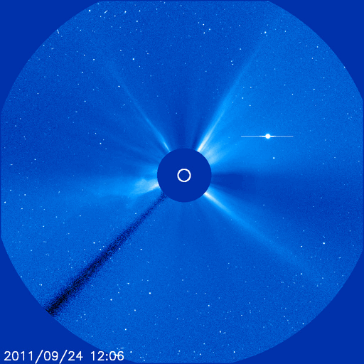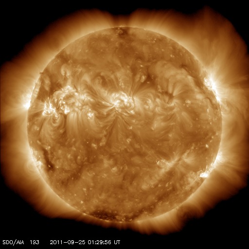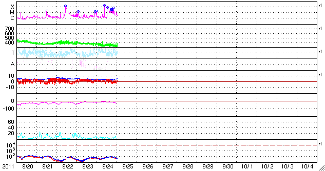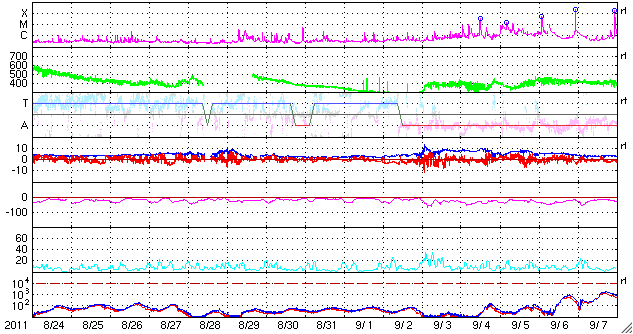 2011/ 9/25 11:04 更新 太陽は、X1.9、M7.1など活発なフレア活動を続けています。今後、CMEの影響が地球に到来しそうです。 担当 篠原 太陽は活発なフレア活動を続けています。 東端にある1302黒点群の活動度がとても高く、 24日18時半(世界時24日9時半)に、X1.9の大規模フレア、 24日21時半(世界時24日12時半)に、M7.1の中規模フレア、 その後も、M2.8、M3.0、M5.8などの中規模フレアを起こしています。 特に、M7.1のフレアは長時間継続する型で、 激しいCME(太陽ガスの放出現象)を伴っています。 X1.9とM7.1のフレアの様子を、SDO衛星AIA193の動画でご覧ください。 また、M7.1のフレアによって発生したCMEの様子を、 SOHO衛星LASCO C3と、STEREO Ahead衛星COR2の動画で紹介します。 STEREOの動画では、このCMEの後に、別のCMEの噴出が見られています。 また、太陽放射線は、10の警戒レベルで安定しています。 1302黒点群は、現在も大きな姿を保っています。 今後も激しいフレアを起こす可能性があり、注意が必要でしょう。 太陽風は、320km/秒とかなり遅い速度に変わっています。 磁場強度は、4nTから5nTへ少し上がっていますが、平均的な値です。 22日のX1.4フレアに伴って発生したCMEの影響は来ていません。 このまま何も来ないのか、小さいながらも変化が見られるのか、 今日いっぱいくらい注目してください。 そして、24日のM7.1フレアによるCMEの影響が、 明日、26日にやって来そうです。 発生地点が地球から見ると斜め方向のため、影響の程度は下がりますが、 今回はある程度の太陽風の乱れとしてやって来るのではないでしょうか。 到来が早いほど、速度の変化も大きくなり、 磁気圏へ及ぼす影響も大きくなる可能性が高くなります。 逆に、到来が遅れれば、太陽風の変化も小さく、影響も小さくなるでしょう。 今後のACEの太陽風データや、オーロラのライブカメラの映像に注目してください。 現在の磁気圏は、低速の太陽風を受けて、穏やかです。 SDO AIA193によるX1.9とM7.1フレアの様子。 (c) SDO (NASA) ![]() SDO AIA193によるX1.9とM7.1フレアの拡大写真。 (c) SDO (NASA)、 (動画加工 : 宇宙天気ニュース) ![]() SOHO LASCO C3カメラによる、CMEの様子。 (c) SOHO (ESA & NASA) ![]() STEREO Aheadによる、CMEの様子。地球は左方向にあります。 (c) STEREO (NASA) ![]() SDO衛星のAIA193カメラによる太陽コロナの様子 (c) SDO (NASA) ![]() SDO衛星による太陽の可視光写真。マウスの矢印を写真に重ねると、黒点番号付きの写真に切り替わります。 (c) SDO (NASA) ![]() GOES衛星の太陽X線データ (c) NOAA/SWPC ![]() GOES衛星の太陽放射線データ (c) NOAA/SWPC ![]() ACEが観測した太陽風の磁場(1番上の枠、白線は全体の強度、赤線は南北成分) および、太陽風の密度(3番目の橙線)、速度(4番目の黄線) (c) NOAA/SWPC ![]() リアルタイムAE指数 下段のAEグラフの値が高くなると、オーロラ活動が活発化しています。 (c) 京都大学, NICT ![]() 27日の太陽周期に合わせたデータプロット 太陽が同じ面を地球に向けていた27日前の変化から、今後を予想することができます。 (c) 作図:宇宙天気ニュース