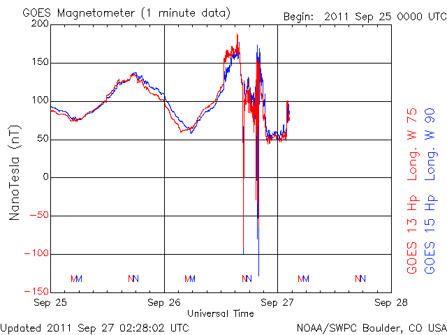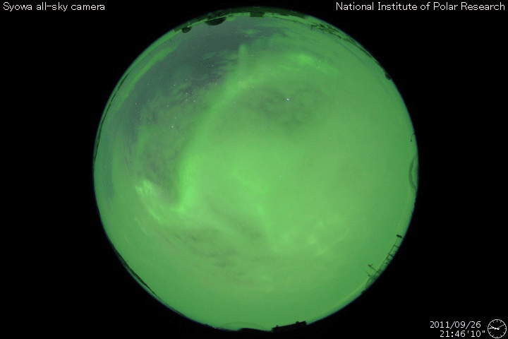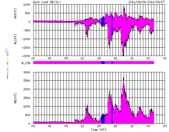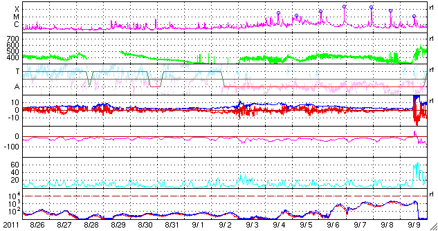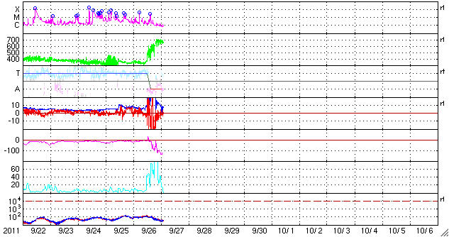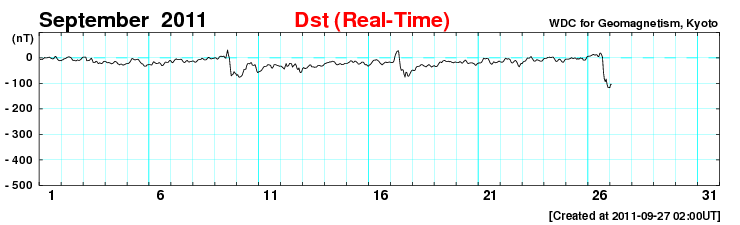 2011/ 9/27 11:29 更新 CMEによる太陽風の乱れが到来しました。激しいオーロラの活動が発生し、大きな磁気嵐になっています。 担当 篠原 24日夜のM7.1フレアの時に発生したCMEによる太陽風の乱れがやって来ました。 ACE衛星の観測によると、26日21時(世界時26日12時)から乱れが始まっています。 磁場強度は一気に30nT近くまで強まり、プラズマの密度は40個/cm^3へ増えました。 この後、磁場強度は最高で35nTまで強まっています。 速度の変化は、初めの瞬間は小幅で、 500km/秒とぎりぎり高速風に上がった程度でした。 しかし、その後8時間にわたってゆっくりと上がり続けて、 700km/秒とかなり高い速度に達しています。 一方、磁場強度とプラズマの密度は、速度の上昇とは反対に弱まり、 磁場強度は既に10nT弱と、プラズマ密度も1個/cm^3を割るくらいになっています。 CMEの影響は地球へやって来るだろうと予想していましたが、 その2日前のX1.4のフレアでは、CMEの影響は全く見られず、 発生源の1302黒点群はまだ太陽の端に近い位置にあったため、 太陽風の乱れは比較的小規模になるのではないかと考えていました。 (昨日の記事であまり強調して書かなかったのもそのためです) しかし、速度の変化、磁場強度の強まりともに大きな擾乱がやって来ました。 これから紹介しますが、この影響で磁気圏はかなり大きく乱れています。 太陽風の擾乱の始まりでは、磁場の南北成分は北寄りでした。 このため、磁気圏への影響は限定的で、オーロラ活動などの乱れも小規模でした。 しかし、CMEによる磁場変化では良く見られることなのですが、 磁場の方向が数時間かけてゆっくりと反転し、 南北成分は強い南向きに変わります。 27日2時(世界時26日17時)には、-20nTに達しています。 この頃には、速度も600km/秒を上回るほどになり、 両方の効果が重なって、激しい磁気圏の擾乱を引き起こしました。 AE指数は、この前後で2000〜2500nTに達する猛烈な変化を記録しています。 磁気嵐も強まって、Dst指数(京都大WDC)は、 現在の速報値で-116nTまで大きく下がっています。 この激しいオーロラを捉えた写真を、 ニュージーランドの南島クィーンズタウンにお住まいのヨネト ミノル氏より頂きました。 メールの文面より、27日1時(世界時26日16時)頃に撮影された写真の様です。 非常に美しく、印象的な写真ですので、 送っていただいたそのままのサイズで掲載します。 10mm魚眼レンズによる撮影とのことで、歪んだ地平線と広い空が写っています。 左側には天の川やマゼラン雲も見えます。 地平線から立ち上がっている赤い光がオーロラです。 3枚の写真を見比べると、縦の光の筋のたなびき方が少しずつ変わっています。 地平線近くの黄色い光は雲です。 赤いオーロラは、緑のオーロラよりも高い所で光っています。 オーロラ帯から少し離れたニュージーランドから見ているので、 より高い空に光る赤いオーロラが目立っている様です(ヨネト氏の解説をどうぞ)。 また、擾乱が激しいため、極域のオーロラの光り方も普段とは違っているようです。 時差の関係で、ニュージーランドよりも少し遅れた27日7時(世界時26日22時)頃の撮影ですが、 南極の昭和基地のオーロラを次に紹介します。 AE指数を見ると、激しさは一段落ついてしまっていますが、 天のはるか上から降り注いで来るような赤いオーロラが目立っています。 普段紹介している昭和基地のオーロラの様子とは一味違った見え方です。 この赤い輝きをニュージーランドからヨネトさんが撮影されたのでしょう。 素晴らしい写真をどうもありがとうございます。 もう1枚、静止衛星のGOESの磁場データも紹介します。 太陽風の強い南向き磁場によって、磁気圏の磁場がどんどんはぎ取られ、 磁気圏の境界が縮まって、GOES衛星が磁気圏の外側に出てしまいました。 磁場のグラフが、瞬間的にマイナスの方向に振れている所です。 今回は2回発生しています。 また、赤線のグラフではっきり見ることができますが、 その前に急に磁場が強まって、150nTの線を超えている部分があります。 これは、太陽風の圧力が高まったために、 磁気圏が圧縮されたことによる増加です。 潰されたり、はぎ取られたり、 磁気圏も激しく変動していた様子を見ることができます。 現在の太陽風は、既に速度は下がり気味で、 CMEによる太陽風の乱れは後半に入っているようです。 磁場強度も8nTくらいに落ち着いていることから、 この後は特に激しい乱れが起きることはないでしょう。 今日いっぱいくらいで今回の擾乱は一段落となるでしょう。 その後は、昨日のニュースで紹介したCMEの影響が追いかけてくるかもしれません。 ただ、今日の様な大きな乱れが来ることはないでしょう。 一方、放射線帯の高エネルギー電子の変化はこれからです。 強い磁気圏の擾乱を受けて、大きく増加する可能性があります。 今後の変化に注意してください。 太陽のフレア活動は次第に低下しています。 GOESのX線のグラフを見ると、Mク