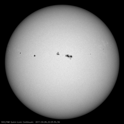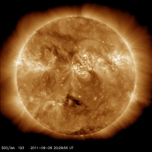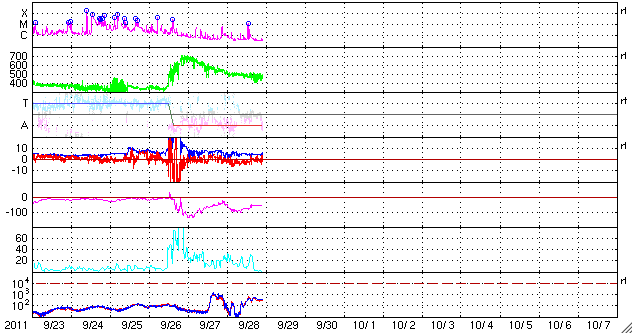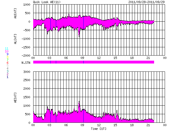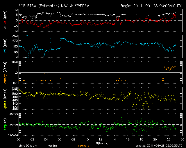 2011/ 9/29 08:05 更新 高速の太陽風の太陽風が続き、オーロラも活発に発生しています。フレアの発生は弱まっている様です。 担当 篠原 太陽風の速度は、500km/秒に下がったところで安定し、 昨日のニュースから今日の早朝まで、この状態が続きました。 今朝になって少し下がり、現在は470km/秒くらいです。 磁場強度も5nTと通常の値で落ち着いていて、 弱まることはありませんでした。 そして、磁場の南北成分は昨日同様南寄りの傾向が続いています。 特に、今日のACEの図の前半は、 振幅は-3nTと小さいですがずっと南向きになっています。 これに高めの速度が重なって、 磁気圏のオーロラ活動は強まった状態が続きました。 AE指数は、500〜800nTほどの中規模の変化が連続的に発生しています。 しかし、図の後半からは、太陽風の様子が変わりつつあるのか、 オーロラの活動は小さくなっています。 その太陽風の速度は、この後、次第に下がっていくと思われます。 SDO AIA193の太陽コロナ写真では、 太陽中央部の南半球側に小さなコロナホールが見えています。 明後日くらいに弱い影響が太陽風に見られるかもしれません。 放射線帯の高エネルギー電子は、 昨日以上に高まることはなく、低い値に留まっています。 太陽のフレア活動は、次第に弱まっている印象です。 昨日は、28日21時半(世界時28日12時半)にC9.3、 28日22時半(世界時28日13時半)にM1.2と、 ほぼ同じ規模の小さめの中規模フレアが1302黒点群で発生した程度です。 1302黒点群の大きさも、昨日のやや小さくなった姿そのままです。 今日も、フレアの発生は続くと思いますが、 その規模は次第に小さくなって行きそうです。 今朝は名古屋より更新しています。 快晴で気持ちのいい朝です。 SDO衛星のAIA193カメラによる太陽コロナの様子 (c) SDO (NASA) ![]() SDO衛星による太陽の可視光写真。マウスの矢印を写真に重ねると、黒点番号付きの写真に切り替わります。 (c) SDO (NASA) ![]() ACEが観測した太陽風の磁場(1番上の枠、白線は全体の強度、赤線は南北成分) および、太陽風の密度(3番目の橙線)、速度(4番目の黄線) (c) NOAA/SWPC ![]() リアルタイムAE指数 下段のAEグラフの値が高くなると、オーロラ活動が活発化しています。 (c) 京都大学, NICT ![]() 27日の太陽周期に合わせたデータプロット 太陽が同じ面を地球に向けていた27日前の変化から、今後を予想することができます。 (c) 作図:宇宙天気ニュース