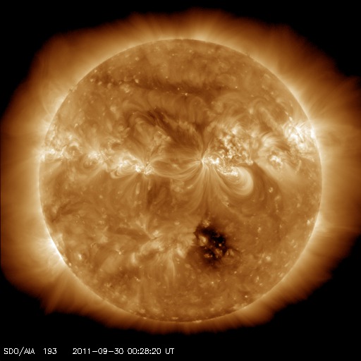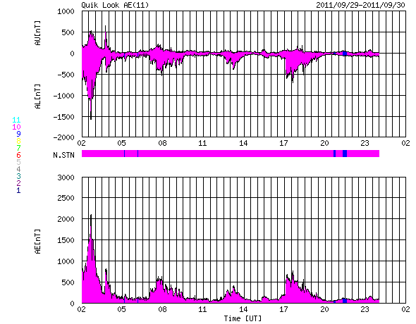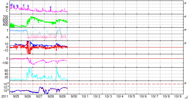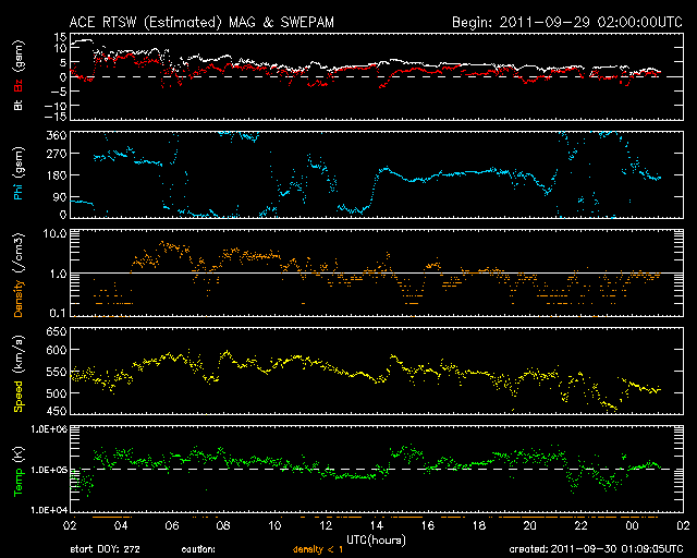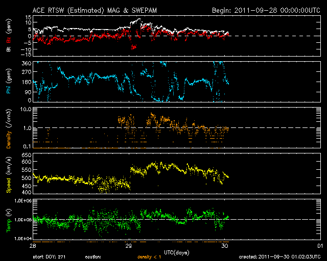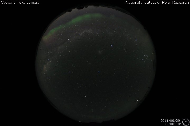 2011/ 9/30 10:09 更新 太陽風は高速状態が続き、オーロラの激しい活動も起きました。 担当 篠原 日本で秋が深まるとともに、 季節が反対の南極では夜が次第に短くなっています。 全天カメラのオーロラ写真では、空が暗いのは5時間になっていました。 昨年までの記録を参考にすると、この撮影も10月15日頃まで、 あと2週間程度です。 今日の1枚目の写真は、残り少ない撮影を楽しみたいと思い、 昨夜(世界時29日23時)の昭和基地のオーロラ動画です。 南極側の空に弱いオーロラがたなびいています。 AE指数では、この時間帯はほとんど変化していませんでした。 やがて空が明るくなり、朝を迎えます。 残りの2週間でどんなオーロラを見ることができるでしょうか。 太陽風の速度は、昨日のニュースの直後に550km/秒へ急に上昇する変化をしました。 太陽で発生していた比較的小規模のCMEによる太陽風の乱れが、 地球までやって来たのではないかと思います。 磁場強度は10〜15nTに強まり、速度も後に600km/秒まで上昇しました。 この影響でオーロラも一時的に活発化し、 AE指数では、1500nTに達する激しい変化が1回、 その後500nT前後の中規模の活動が3回ほど数時間おきに発生しています。 太陽風は、現在も500〜540km/秒と高速の状態です。 磁場強度は3nTほどに下がっているので、速度は次第に低下しそうです。 もうしばらく、小規模のオーロラ活動も期待できそうです。 その後、10月1〜2日頃に、 SDO AIA193の太陽コロナの南半球側にある、 コロナホールの影響がやって来るかもしれません。 また、あまりはっきりしないのですが、 28日に弱いCMEが発生しているかもしれず、その影響も考えられます。 太陽では、29日21時(世界時29日12時)に、 1305黒点群でC2.7の小規模フレアが発生しました。 長時間型の変化をしていて、弱いCMEの噴出が起きているようです。 この後の時間に、SOHO LASCO C2、C3では激しいCMEが観測されていますが、 STEREOによると、これは太陽の反対側の現象です。 南極の昭和基地で全天カメラにより撮影された、朝を迎える頃のオーロラ。 (c) 国立極地研究所、(動画加工 : 宇宙天気ニュース) ![]() ACEによる、3日幅の太陽風の変化。世界時29日1時半に、速度の急な上昇と磁場強度の強まりが発生しています。 (c) NOAA/SWPC ![]() SDO衛星のAIA193カメラによる太陽コロナの様子 (c) SDO (NASA) ![]() SDO衛星による太陽の可視光写真。マウスの矢印を写真に重ねると、黒点番号付きの写真に切り替わります。 (c) SDO (NASA) ![]() ACEが観測した太陽風の磁場(1番上の枠、白線は全体の強度、赤線は南北成分) および、太陽風の密度(3番目の橙線)、速度(4番目の黄線) (c) NOAA/SWPC ![]() リアルタイムAE指数 下段のAEグラフの値が高くなると、オーロラ活動が活発化しています。 (c) 京都大学, NICT ![]() 27日の太陽周期に合わせたデータプロット 太陽が同じ面を地球に向けていた27日前の変化から、今後を予想することができます。 (c) 作図:宇宙天気ニュース