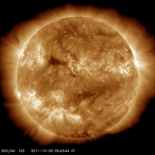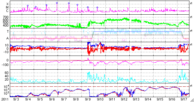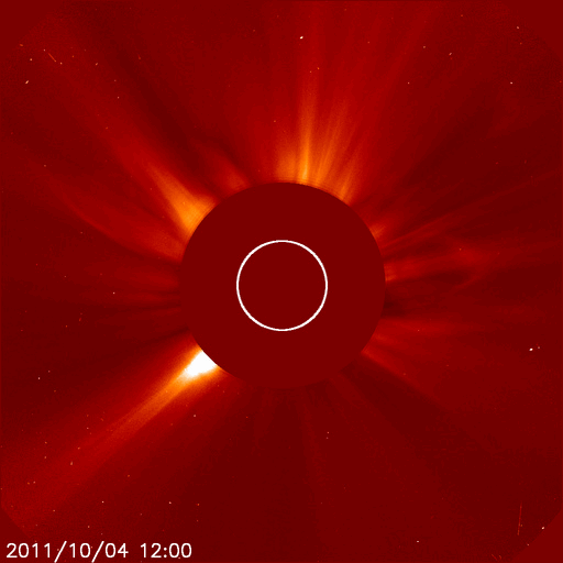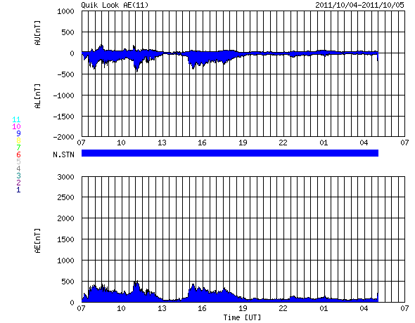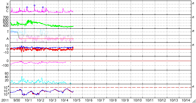 2011/10/ 5 15:25 更新 太陽風は低速ですが、弱いオーロラの活動は続いています。CMEの影響はまだで、今後に注目です。 担当 篠原 太陽の裏側で、大規模なCME(太陽ガスの放出現象)が発生しています。 SOHO LASCO C2、C3の動画をご覧ください。 太陽を取り囲むように激しく白いコロナのガスが噴き出しています。 これが地球方向であれば、たいへんですが、 STEREO Behindで横方向から太陽を見ると、 地球とは反対である左側へ向かって噴き出しています。 EUVI 195の写真では、太陽の左上でフレアが発生しています。 ここの活動領域で発生した現象でした。 地球側の太陽面では、西の端の1302黒点群で、 C7.3とC2.3の2つの小規模フレアが発生しました。 1302黒点群は、西に没して見えなくなっています。 残った黒点群の活動は今のところ特に見られず、 しばらく太陽は穏やかになりそうです。 太陽風は、370km/秒とやや低速の状態で安定しています。 磁場強度も5nTでほぼ変わっていません。 磁場の南北成分は、連続的に南寄りになっていて、 小規模のオーロラ活動が度々発生しています。 AE指数で400nTほどの変化が見られています。 1日や2日に発生したCMEの影響はまだ来ていません。 これからやって来ると思われますが、時間がかかっているので、 速度はあまり上がらないでしょう。 磁場の変化が注目されますが、強い南向きになった場合、 速度が遅い代わりに、磁場の乱れの継続時間も長くなり、 結果的にオーロラなどの磁気圏活動が長時間続くこともあります。 引き続き、ACEのデータやオーロラのライブカメラなどに注目してください。 授業の担当時間の関係で、これから2月までの半年間、 水曜日の更新はこの時刻(15時過ぎ)になることが多いと思います。 遅い時間になり、申し訳ありません。 SOHO LASCO C3、C2カメラによる、ハロー型CMEの様子。 (c) SOHO (ESA & NASA)、 (動画加工 : 宇宙天気ニュース) ![]() STEREO Behindから見たCME。地球の反対側の左側に噴き出しています。 (c) STEREO (NASA)、 (動画加工 : 宇宙天気ニュース) ![]() SDO衛星のAIA193カメラによる太陽コロナの様子 (c) SDO (NASA) ![]() SDO衛星による太陽の可視光写真。マウスの矢印を写真に重ねると、黒点番号付きの写真に切り替わります。 (c) SDO (NASA) ![]() GOES衛星の太陽X線データ (c) NOAA/SWPC ![]() ACEが観測した太陽風の磁場(1番上の枠、白線は全体の強度、赤線は南北成分) および、太陽風の密度(3番目の橙線)、速度(4番目の黄線) (c) NOAA/SWPC ![]() リアルタイムAE指数 下段のAEグラフの値が高くなると、オーロラ活動が活発化しています。 (c) 京都大学, NICT ![]() 27日の太陽周期に合わせたデータプロット 太陽が同じ面を地球に向けていた27日前の変化から、今後を予想することができます。 (c) 作図:宇宙天気ニュース
