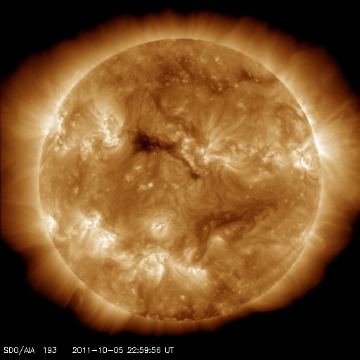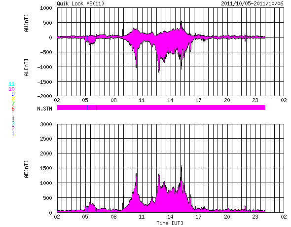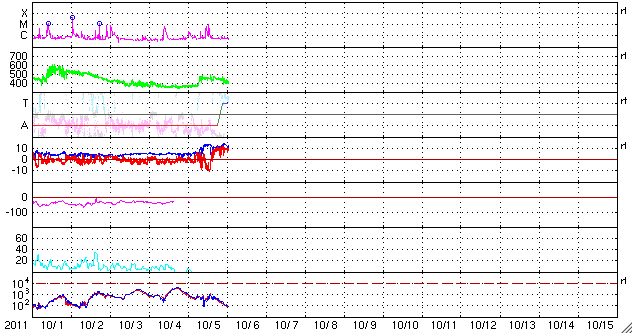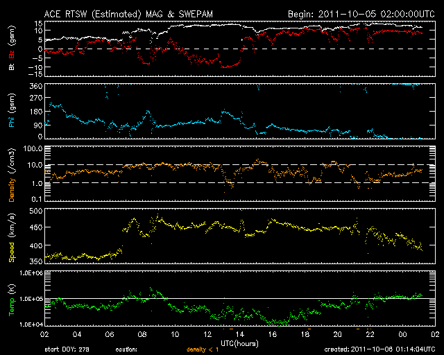 2011/10/ 6 10:12 更新 CMEの乱れが到来し、オーロラが活発に発生しました。現在の磁気圏活動は弱まっています。 担当 篠原 ニュージーランドのヨネト ミノル氏より、 今朝撮影されたばかりの素晴らしいオーロラの写真が届きました。 現地時間6日4時11分(世界時5日15時11分)の撮影とのことです。 (最初の記事で世界時を16時としていましたが、 現地は夏時間のため、世界時の15時が正しい時刻です) 月が沈んだ直後に、最高のオーロラを迎えることができたそうです。 地平線の向こうにあるオーロラ帯へ向かって降り注いでいるオーロラの光のうち、 高いところで輝いている赤いオーロラを見ている写真です。 先日の写真も素晴らしいものでしたが、 今日の写真では、オーロラの縦の光の筋が幾本もはっきりと見えています。 この光の線に添って、磁気圏に向かって磁力線の道が延びているのです。 写真の左端には、南十字星が見えています。 斜め左下に向かってひっくり返っています。 南十字星の右上横には、石炭袋(コールサック)と呼ばれる暗黒星雲が見えています。 そして、南十字星の右下には、ケンタウルス座の二つの1等星、β星とα星が並んでいます。 α星は、地球に最も近い恒星(もちろん太陽以外の)として知られています。 この素晴らしいオーロラの原因となったのは、 とうとうやって来た、CMEによる太陽風の乱れです。 昨日夕方、5日16時(世界時5日7時)頃から、ACE衛星で変化が観測され、 磁場強度が10nTへ、速度が450km/秒へ強まっています。 磁場強度の強まりとともに、磁場の南北成分が大きく南を向きました。 -10nTに達する強い南向きが、途中弱まったりしていますが、 およそ6時間にわたって続いています。 その結果、AE指数で1300〜1500nTに達する激しいオーロラ活動が、 連続的に発生しました。 ニュージーランドの写真は、これらの変化の最後のピークにあたります。 (この点も、撮影時刻が世界時15時であるとすると、変化と完全に一致します) 磁場の南北成分は5日23時(世界時5日14時)に、北向きに切り替わります。 太陽風の乱れはその後も続きますが、 磁気圏へのエネルギー流入は止まり、オーロラの活動はそこで止まっています。 CMEによる太陽風の乱れは現在も続いていますが、 今日いっぱいくらいで地球を通過して行くでしょう。 この後、磁場が再び南向きに切り替わった場合、磁気圏の活動も再び活発化します。 それがなければ、磁気圏はこのまま穏やかに推移するでしょう。 そして、明日以降は穏やかな太陽風に戻りそうです。 SDO衛星AIA193を見ると、太陽の中心付近に小さなコロナホールがあります。 3日後の9〜10日くらいに、小規模の太陽風の強まりがやって来るかもしれません。 太陽では、昨夜、5日19時半(世界時5日10時半)と5日21時半(世界時5日12時半)に、 C6.1とC9.2の2つの大きなCクラスフレアが発生しました。 フレアが起きたのは、東端の南半球側から上がってきた1313黒点群です。 今後の活動に注目してください。 ニュージーランド南島クィーンズタウンで、現地6日4時11分(世界時5日15時11分)に撮影されたオーロラ。 (c) ヨネト ミノル ![]() SDO衛星のAIA193カメラによる太陽コロナの様子 (c) SDO (NASA) ![]() SDO衛星による太陽の可視光写真。マウスの矢印を写真に重ねると、黒点番号付きの写真に切り替わります。 (c) SDO (NASA) ![]() ACEが観測した太陽風の磁場(1番上の枠、白線は全体の強度、赤線は南北成分) および、太陽風の密度(3番目の橙線)、速度(4番目の黄線) (c) NOAA/SWPC ![]() リアルタイムAE指数 下段のAEグラフの値が高くなると、オーロラ活動が活発化しています。 (c) 京都大学, NICT ![]() 27日の太陽周期に合わせたデータプロット 太陽が同じ面を地球に向けていた27日前の変化から、今後を予想することができます。 (c) 作図:宇宙天気ニュース