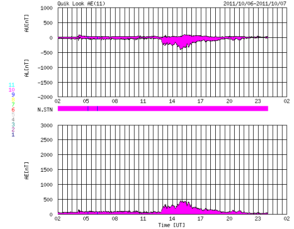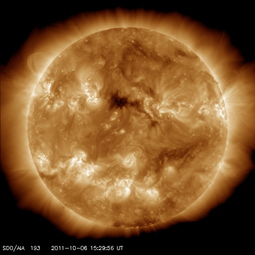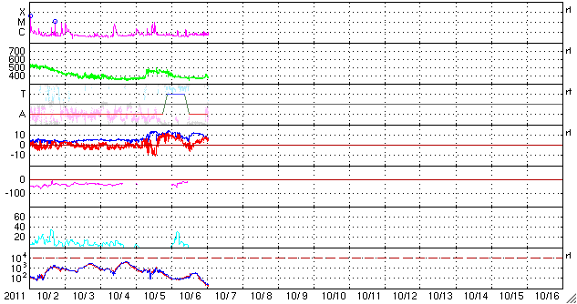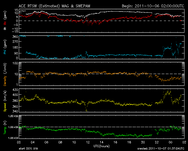 2011/10/ 7 10:32 更新 CMEの影響は終わり、穏やかな太陽風に戻りつつあります。フレア活動は静かです。 担当 篠原 太陽風の磁場強度は、今朝まで10nT前後の強い状態が続きました。 プラズマの密度も10個/cm^3と高まっていて、 CMEの影響が続いていたのだと思われます。 太陽風の速度は380km/秒とやや遅めだったので、 磁場の強まりが長い時間続いたのでしょう。 最新のACEのデータでは、磁場強度は5nT近くに下がり、 プラズマの密度も数個/cm^3へ減少しつつあります。 CMEに関係する変化も、この辺りで終わりとなりそうです。 昨日お知らせしたオーロラの活発な活動の後、 太陽風の磁場は、ほとんど北向きに推移しました。 このため、オーロラの活動はずっと穏やかで、 今日のAE指数は、途中に400nTの小規模の変動が1つ見られる程度です 磁場強度の強まりも終わったことから、 今後の磁気圏は静かに推移するでしょう。 SDO衛星 AIA193では、太陽の北半球側の中央部に、 小さなコロナホールが見えます。 規模が小さいので、影響は限定的になりそうですが、 3日後の10日前後に、 太陽風の速度上昇などの変化が発生する可能性があります。 太陽のフレア活動は、より静かになっています。 昨日は、C1.4、C1.9と二つの小さな小規模フレアが発生しただけでした。 GOES衛星のX線動画を見ると、 1313黒点群などの東半球側の黒点群で、小さな活動は続いています。 今後、規模が拡大するかどうかに注目してください。 宇宙天気とは全く関係ない話題で恐縮ですが、 昨日、AppleのSteve Jobs氏が亡くなったとニュースで知りました。 この宇宙天気ニュースは、iMacで記事を書き、 Mac Proで記事ファイルを作成し、Mac miniで記事を配信しています。 出張中はiPhoneから記事を書くこともあります。 長い間ほんとうにありがとう。ご冥福をお祈り致します。 SDO衛星のAIA193カメラによる太陽コロナの様子 (c) SDO (NASA) ![]() SDO衛星による太陽の可視光写真。マウスの矢印を写真に重ねると、黒点番号付きの写真に切り替わります。 (c) SDO (NASA) ![]() ACEが観測した太陽風の磁場(1番上の枠、白線は全体の強度、赤線は南北成分) および、太陽風の密度(3番目の橙線)、速度(4番目の黄線) (c) NOAA/SWPC ![]() リアルタイムAE指数 下段のAEグラフの値が高くなると、オーロラ活動が活発化しています。 (c) 京都大学, NICT ![]() 27日の太陽周期に合わせたデータプロット 太陽が同じ面を地球に向けていた27日前の変化から、今後を予想することができます。 (c) 作図:宇宙天気ニュース