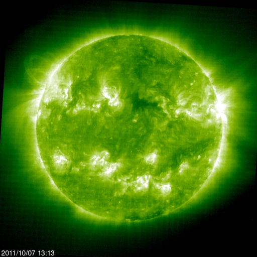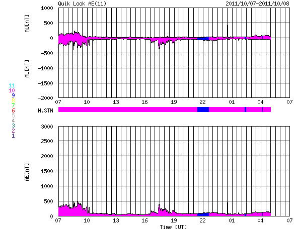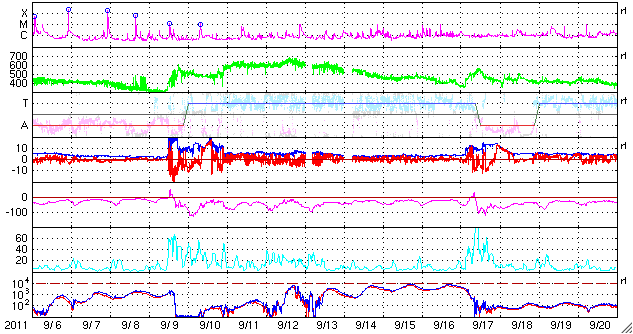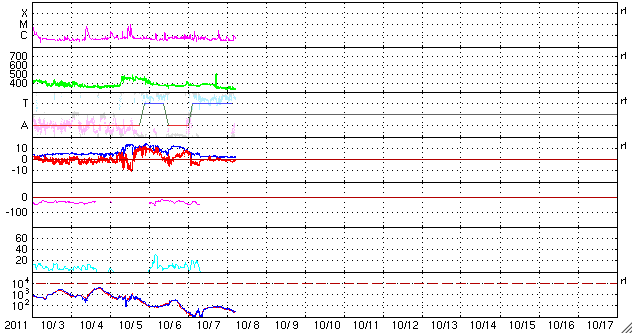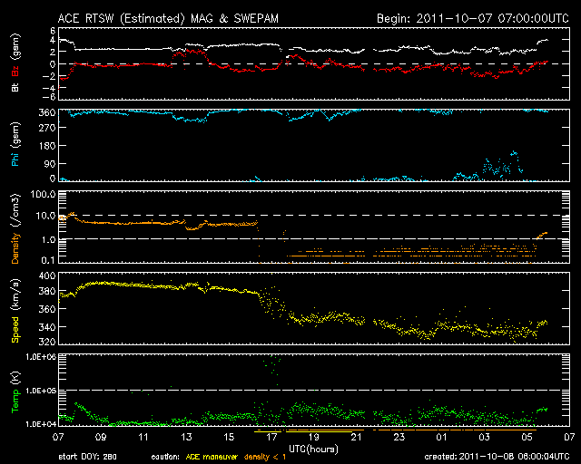 2011/10/ 8 15:00 更新 太陽風の速度は340km/秒に下がり、磁気圏も穏やかです。 担当 篠原 太陽風の速度は340km/秒へ下がり、更に遅い速度になっています。 磁場強度も2nTとかなり弱くなり、 ここ数日続いていた太陽風と比べると、とても静かになっています。 磁気圏の活動も静かになっていて、 AE指数の図の後半は、小さな変化が見られる程度です。 AE指数の図では、最初に400nTと小規模ですがまとまった変化が発生しています。 これは、-5nTほどの南向き磁場が6時間に渡って継続したことによる変動です。 (今日のACEの図の最初の南向き磁場はその最後の部分です) 一連のCMEによる太陽風の乱れの最後とも言ってよさそうな変化でした。 SDO衛星のAIAカメラの写真の更新が止まっているので、 今日はSOHO衛星のEIT195を掲載しています。 半日ほど前の写真ですが、 太陽の中央部の北半球側に小さなコロナホールが見えます。 明日、9日の後半か、10日くらいから影響が及ぶかもしれません。 それまでは、太陽風は低速で、磁気圏も穏やかでしょう。 太陽では、C1〜2と、規模は小さいですが、Cクラスの小規模フレアが 度々発生するようになっています。 ただ、NOAAの報告には発生地点が記されておらず、 GOES衛星のX線動画を見ていても、 あちこちで小さな活動が発生していて、発生地点は良く分かりません。 この後、フレアの規模が高まるようになれば、 活動的な場所も分かるようになるでしょう。 SOHO衛星のEIT195カメラによる太陽コロナの様子 (c) SOHO (ESA & NASA) ![]() SDO衛星による太陽の可視光写真。マウスの矢印を写真に重ねると、黒点番号付きの写真に切り替わります。 (c) SDO (NASA) ![]() ACEが観測した太陽風の磁場(1番上の枠、白線は全体の強度、赤線は南北成分) および、太陽風の密度(3番目の橙線)、速度(4番目の黄線) (c) NOAA/SWPC ![]() リアルタイムAE指数 下段のAEグラフの値が高くなると、オーロラ活動が活発化しています。 (c) 京都大学, NICT ![]() 27日の太陽周期に合わせたデータプロット 太陽が同じ面を地球に向けていた27日前の変化から、今後を予想することができます。 (c) 作図:宇宙天気ニュース