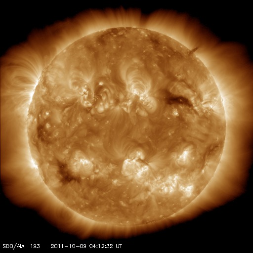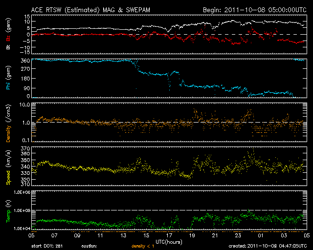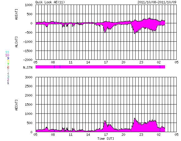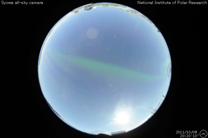 2011/10/ 9 13:48 更新 太陽風磁場が南向きに強まり、中規模のオーロラ活動が続いています。 担当 篠原 昨夜、太陽風磁場の大まかな方向が切り替わるセクター境界の通過が見られました。 ACE衛星のグラフでは、水色の線が上端から下端へ大きく振れています。 また、27日周期の図のセクターのグラフによると、 磁場が「地球から太陽へ」向かう「T」の範囲から、 「太陽から地球へ」向かう「A」の範囲へ切り替わっています。 この切り替わりに伴って、太陽風の状態が変化しています。 磁場の強度が10nT近くに強まり、南北成分が南に偏る様になって、 -5nT前後の南を向く時間が長くなっています。 この影響で、中規模のオーロラ活動が発生しています。 AE指数では、600nTの変化が続いています。 この時の、オーロラの様子を昭和基地の全天カメラで紹介します。 明るい月が輝いているのは残念ですが、 空を覆う激しいオーロラの輝きは十分楽しめます。 太陽風の変化は、グラフの最新の部分では、 水色の線はひっくり返って上端に戻っています。 この後どこに落ち着くのか、注目してください。 今回の変化は、コロナホールに関係している可能性があります。 これから速度も上がって、500km/秒近くまで高まるかもしれません。 一方、磁場強度は次第に弱まって行くと思われるので、 オーロラの活動は小規模の変化が続く程度でしょう。 明日にかけてオーロラの活動が期待されます。 太陽のフレア活動は、時間とともに弱まる傾向にあって、 C1くらいの小さなフレアが2回発生している程度です。 黒点群はいくつも見えていますが、 太陽の活動は静かに推移しそうです。 南極の昭和基地で全天カメラにより撮影された、オーロラの活動。 (c) 国立極地研究所、(動画加工 : 宇宙天気ニュース) ![]() SDO衛星のAIA193カメラによる太陽コロナの様子 (c) SDO (NASA) ![]() SDO衛星による太陽の可視光写真。マウスの矢印を写真に重ねると、黒点番号付きの写真に切り替わります。 (c) SDO (NASA) ![]() ACEが観測した太陽風の磁場(1番上の枠、白線は全体の強度、赤線は南北成分) および、太陽風の密度(3番目の橙線)、速度(4番目の黄線) (c) NOAA/SWPC ![]() リアルタイムAE指数 下段のAEグラフの値が高くなると、オーロラ活動が活発化しています。 (c) 京都大学, NICT ![]() 27日の太陽周期に合わせたデータプロット 太陽が同じ面を地球に向けていた27日前の変化から、今後を予想することができます。 (c) 作図:宇宙天気ニュース