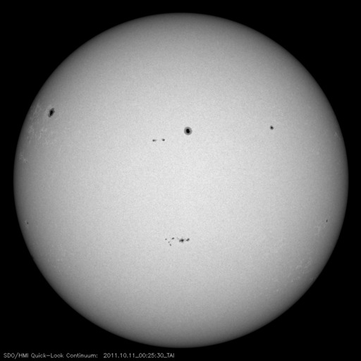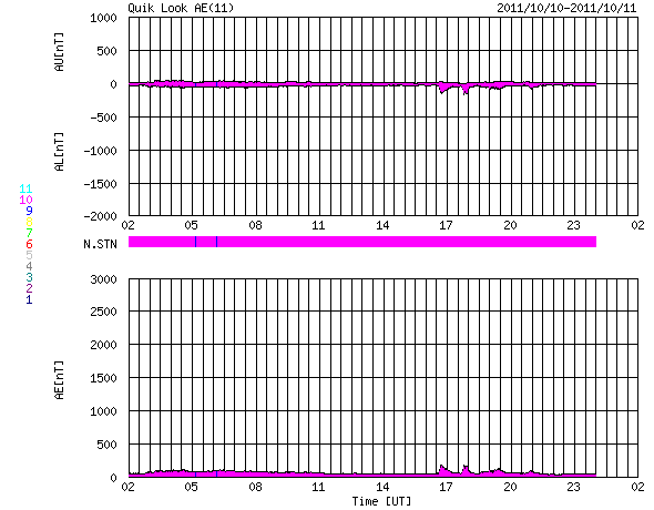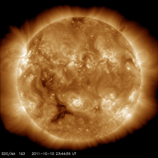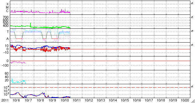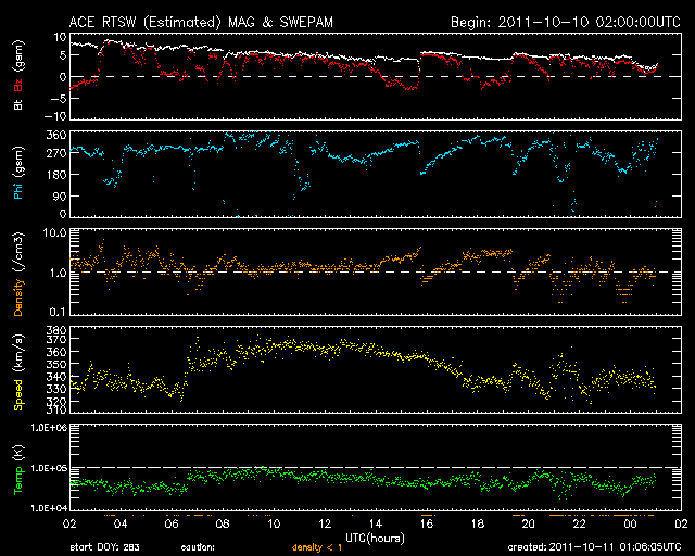 2011/10/11 10:06 更新 太陽風磁場の強まりは終わり、静かな太陽風になっています。Cクラスのフレアが数回発生しています。 担当 篠原 太陽風は、340km/秒前後(ACEの図の黄色線)と低速の状態で安定しています。 磁場強度(白線)は、8nTから次第に弱まり、現在は5nTを割っています。 磁場強度の高まりも終わって、穏やかな太陽風になっています。 昨日のニュース以降は、 太陽風の磁場はずっと北寄り(赤線がプラス方向)になっています。 このため、磁気圏もとても静かで、AE指数は全く変化していません。 この後も、3〜4日程度は低速の太陽風が続き、磁気圏も静穏でしょう。 その後は、太陽の南半球側にあるコロナホールの影響がやって来る可能性があります。 SDO AIA193の太陽コロナ写真の下側に見えているコロナホールです。 初めは緯度が高いので、地球への影響は弱そうですが、 コロナホールの左側が赤道側へ伸びていることから、 遅れて影響が強まってくるかもしれません。 この辺りのコロナホールの様子は、 明日、明後日と次第によく見えてくるでしょう。 太陽では、南半球のちょうどまん中に見えている1313黒点群の活動が目立っています。 C3.8、C1.0、C1.4、C4.5とCクラスの小規模フレアを続けて起こしています。 黒点の規模はそれほど大きくないため、 急に大きなフレアが発生するということはなさそうですが、 活動が更に強まる可能性もあるので、注意してください。 SDO衛星のAIA193カメラによる太陽コロナの様子 (c) SDO (NASA) ![]() SDO衛星による太陽の可視光写真。マウスの矢印を写真に重ねると、黒点番号付きの写真に切り替わります。 (c) SDO (NASA) ![]() ACEが観測した太陽風の磁場(1番上の枠、白線は全体の強度、赤線は南北成分) および、太陽風の密度(3番目の橙線)、速度(4番目の黄線) (c) NOAA/SWPC ![]() リアルタイムAE指数 下段のAEグラフの値が高くなると、オーロラ活動が活発化しています。 (c) 京都大学, NICT ![]() 27日の太陽周期に合わせたデータプロット 太陽が同じ面を地球に向けていた27日前の変化から、今後を予想することができます。 (c) 作図:宇宙天気ニュース