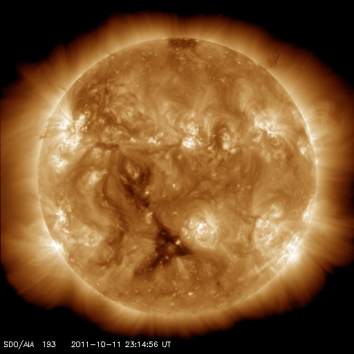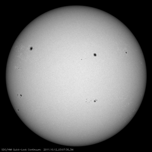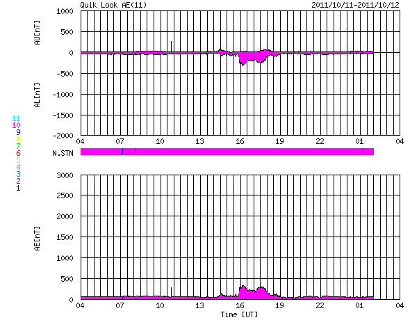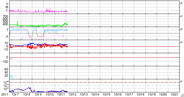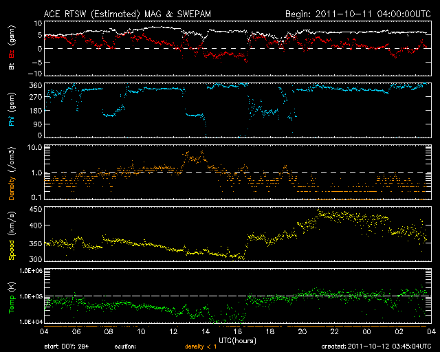 2011/10/12 12:46 更新 太陽風は低速で、磁気圏も静穏です。太陽のフレア活動もありません。 担当 篠原 昨夜から今朝にかけて、 太陽風の速度が一時的に420km/秒くらいまで上がる変化が見られました。 ACEの図は縦軸が拡大されるため、この変化は目立って見えますが、 27日周期の図で見ると、小さな変化だったことがわかります。 現在の速度は、370km/秒に下がっています。 この後も、低速の穏やかな太陽風が続くでしょう。 磁気圏も静穏で、オーロラの活動度を表すAE指数のグラフは、 小さな変化が1回発生した程度です。 SDO衛星AIA193の太陽コロナ写真を見ると、 南半球のコロナホールは、ちょうど太陽の中心線に達しています。 すると、3日後の15日頃から太陽風の速度がやや上昇する可能性があります。 コロナホールの規模は小さく、場所もやや高めの緯度にあるので、 地球への影響は限定的でしょう。 太陽は、昨日の図に見えていた小規模のフレア活動は終わってしまいました。 現在は静穏です。 黒点群の数は多いのですが、活動はどれも静かです。 SDO衛星のAIA193カメラによる太陽コロナの様子 (c) SDO (NASA) ![]() SDO衛星による太陽の可視光写真。マウスの矢印を写真に重ねると、黒点番号付きの写真に切り替わります。 (c) SDO (NASA) ![]() ACEが観測した太陽風の磁場(1番上の枠、白線は全体の強度、赤線は南北成分) および、太陽風の密度(3番目の橙線)、速度(4番目の黄線) (c) NOAA/SWPC ![]() リアルタイムAE指数 下段のAEグラフの値が高くなると、オーロラ活動が活発化しています。 (c) 京都大学, NICT ![]() 27日の太陽周期に合わせたデータプロット 太陽が同じ面を地球に向けていた27日前の変化から、今後を予想することができます。 (c) 作図:宇宙天気ニュース