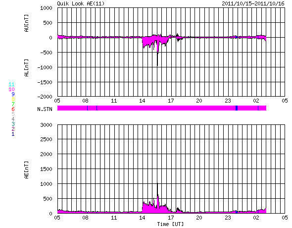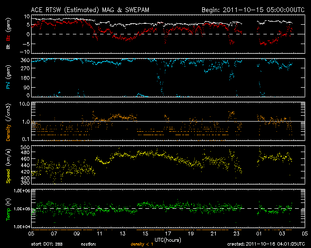 2011/10/16 13:02 更新 太陽風はやや高速の風が続いています。太陽でCクラスフレアの発生が増えています。 担当 篠原 太陽風の速度は、昨日よりもやや少し上昇して、 460km/秒となっています。 磁場強度は反対に、8nTから6nTにやや弱まっています。 速度の変化としては小規模ですが、 コロナホールの影響が及んでいるようです。 磁場強度はまだやや高めです。 この様子だと、すぐに速度が下がるのではなく、 もう2〜3日速度が高まった状態が続くかもしれません。 太陽風磁場の南北成分は、北寄りに推移していて、 磁気圏は多くの時間は静穏です。 ただ、一時的に磁場が南に振れて、 そこで小規模のオーロラ活動が発生しています。 この傾向はこの後も続きそうです。 太陽は、フレア活動の規模が少し高まっています。 15日23時(世界時15日14時)にC5.0、16日5時半(世界時15日20時半)にC3.9と、 やや大きめのCクラスフレアが2回発生し、 その他にも、C1〜2のフレアが多く発生しています。 発生ヶ所は主に1319黒点群ですが、その他の領域でも発生していて、 全体的ににぎやかになってきました。 東の端からも新しい活動領域が近づいていて、 今週は、太陽の活動が強まるのでしょうか。 SDO衛星による太陽の可視光写真。 (c) SDO (NASA) ![]() SDO衛星のAIA193カメラによる太陽コロナの様子 (c) SDO (NASA) ![]() ACEが観測した太陽風の磁場(1番上の枠、白線は全体の強度、赤線は南北成分) および、太陽風の密度(3番目の橙線)、速度(4番目の黄線) (c) NOAA/SWPC ![]() リアルタイムAE指数 下段のAEグラフの値が高くなると、オーロラ活動が活発化しています。 (c) 京都大学, NICT ![]() 27日の太陽周期に合わせたデータプロット 太陽が同じ面を地球に向けていた27日前の変化から、今後を予想することができます。 (c) 作図:宇宙天気ニュース