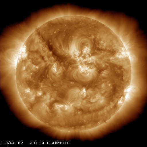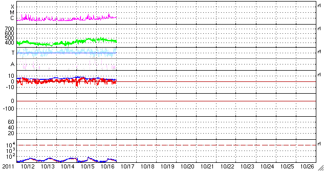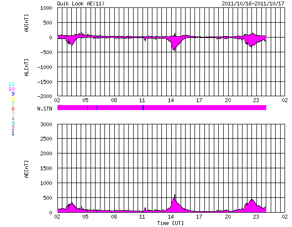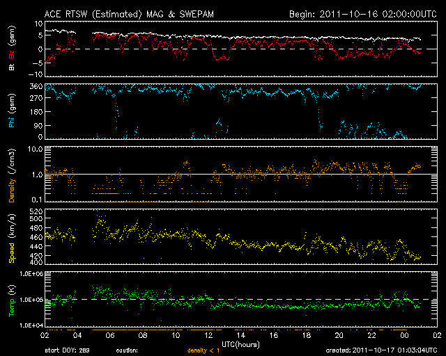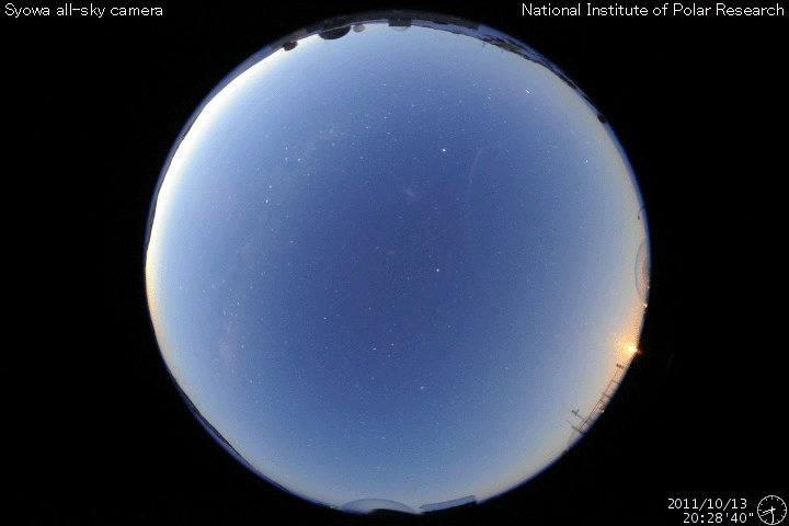 2011/10/17 10:03 更新 太陽風の速度は下がり始めています。Cクラスのフレアは続いています。 担当 篠原 南極の昭和基地のオーロラ全天カメラの今年の観測が終了したようです。 10月13日の夜の写真を最後に更新が止まっています。 その最後の夜の動画を紹介します。 撮影時間は、全体で20分程度しかありません。 右下の空に光って見えるのは、満月直後の大きな月です。 太陽は、左上の地平線がうっすらと明るくなっている方角にあります。 空には淡く天の川が見えていて、 月が無ければもう少し状態はいいのかもしれません。 それでも、左上の薄明は空を覆いつつあり、 昭和基地に夜がなくなるのはもうすぐなのでしょう。 今年もたくさんの素晴らしいオーロラ写真をありがとうございました。 4ヶ月後の2月頃と思われる観測の再開を楽しみに待ちましょう。 太陽風の速度はゆっくりと下がり始めています。 昨日は470km/秒まで上がりましたが、現在は430km/秒です。 磁場強度も4nTに下がり、 コロナホールの影響は後半に入っていると思われます。 太陽風の速度は、この後もゆっくりと低下が続き、 明日、明後日からは低速風に変わりそうです。 磁気圏では、時々、小規模のオーロラ活動が発生しています。 速度が下がり、磁場が弱まっていることから、 今後のオーロラ活動はより小さくなって行くでしょう。 太陽は、Cクラスのフレア活動が活発に発生しています。 東から新しい活動領域が上がってきたためか、 X線の強度そのものも少し上がっています。 現在も活動の中心は、1319黒点群です。 黒点は少し大きくなっているようで、この後も現状程度の活動を続けそうです。 南極の昭和基地、全天カメラの写真。2011年最後の夜(多分) (c) 国立極地研究所、(動画加工 : 宇宙天気ニュース) ![]() SDO衛星による太陽の可視光写真。 (c) SDO (NASA) ![]() SDO衛星のAIA193カメラによる太陽コロナの様子 (c) SDO (NASA) ![]() ACEが観測した太陽風の磁場(1番上の枠、白線は全体の強度、赤線は南北成分) および、太陽風の密度(3番目の橙線)、速度(4番目の黄線) (c) NOAA/SWPC ![]() リアルタイムAE指数 下段のAEグラフの値が高くなると、オーロラ活動が活発化しています。 (c) 京都大学, NICT ![]() 27日の太陽周期に合わせたデータプロット 太陽が同じ面を地球に向けていた27日前の変化から、今後を予想することができます。 (c) 作図:宇宙天気ニュース