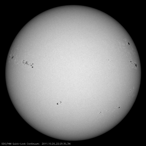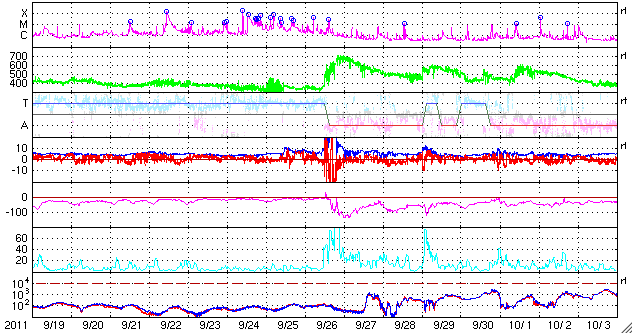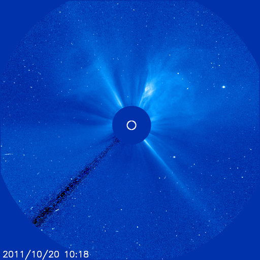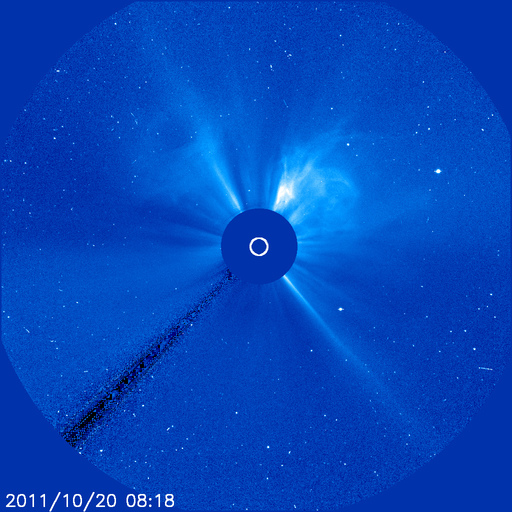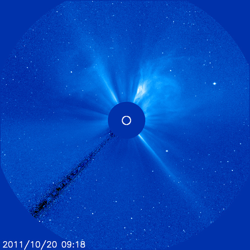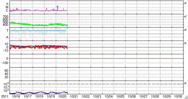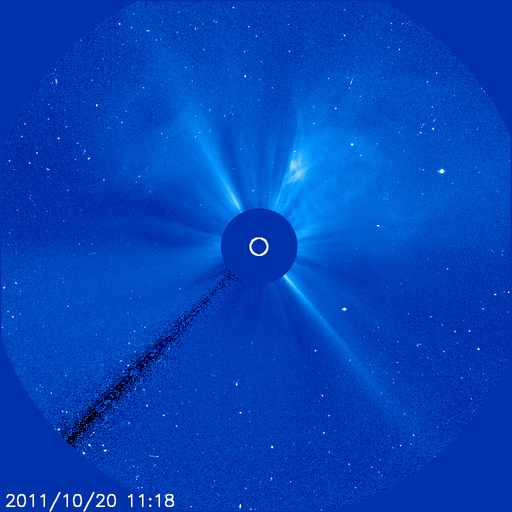 2011/10/21 09:32 更新 3週間ぶりにMクラスのフレアが発生しました。太陽風と磁気圏は穏やかです。 担当 篠原 昨日、20日12時(世界時20日3時)に、M1.6の中規模フレアが発生しました。 Mクラスのフレアは、今日掲載の27日周期の図の右端に見える(太陽X線のグラフの丸印)、 10月2日のM1.3以来です。 発生地点は、太陽の西の端の向こう側です(NOAAによると1318黒点群)。 地球からは見えないので、実際にはより大きな規模のフレアだったと考えられます。 CME(太陽ガスの放出現象)も太陽の北西(右上)に向かって発生していますが、 地球には影響ありません。 太陽のこちら側では、 東端に近い1324黒点群で、C5.4と大きめの小規模フレアが発生している程度で、 特に活動が強まっている様子はありません。 太陽風の速度は、昨夜のうちに400km/秒を割り、 現在は370km/秒とやや低速の風に下がっています。 磁場強度も3nTへ弱まりつつあります。 磁気圏のオーロラ活動も静かです。 今日以降は、むしろコロナホールの影響を受けそうなタイミングで、 今後、再び速度の上昇が見られるかもしれません。 その場合も、変化の規模は小さいでしょう。 SOHO衛星 LASCO C3カメラの映像 (c) SOHO (ESA & NASA)